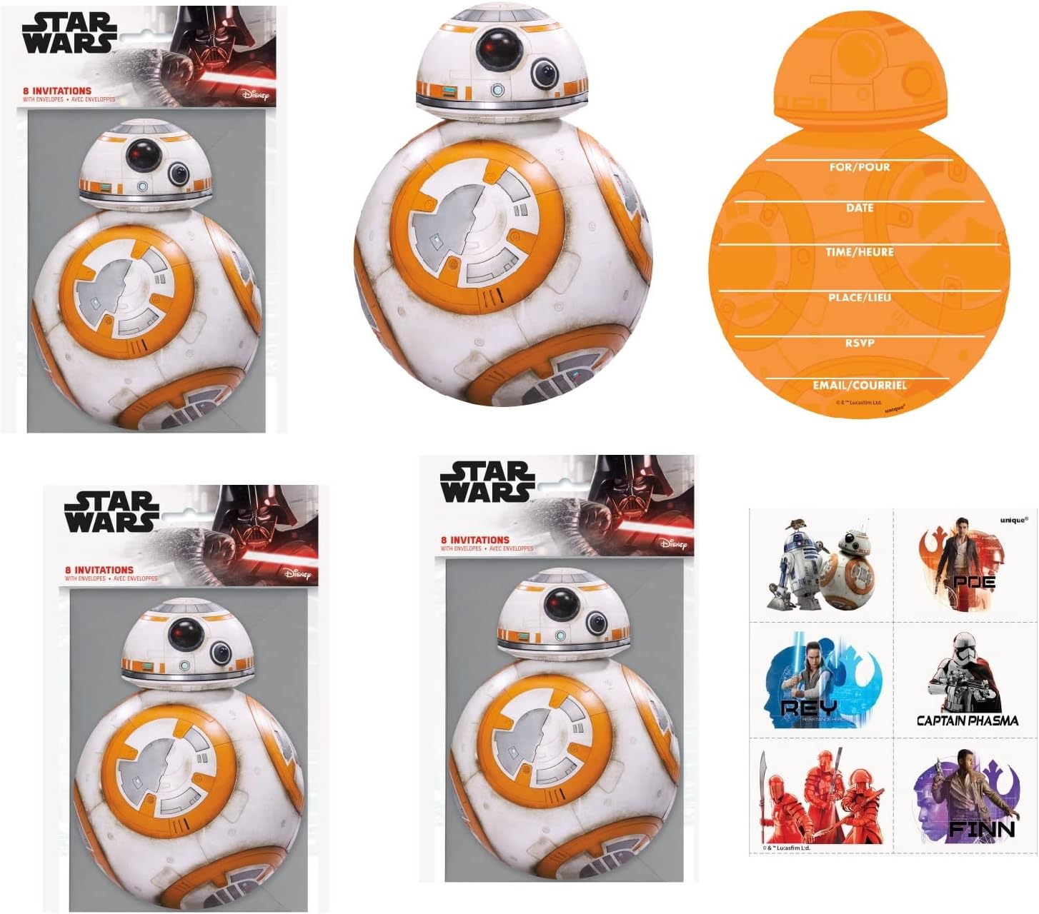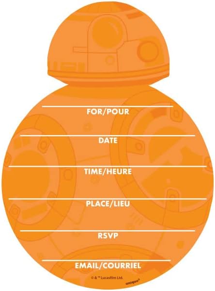 Il pacchetto di forniture per feste di compleanno BB8 di Star Wars Classic include: 24 inviti e buste per feste Inviti con ritaglio BB8, altezza 17,8 cm x larghezza 12,7 cm 6 tatuaggi.