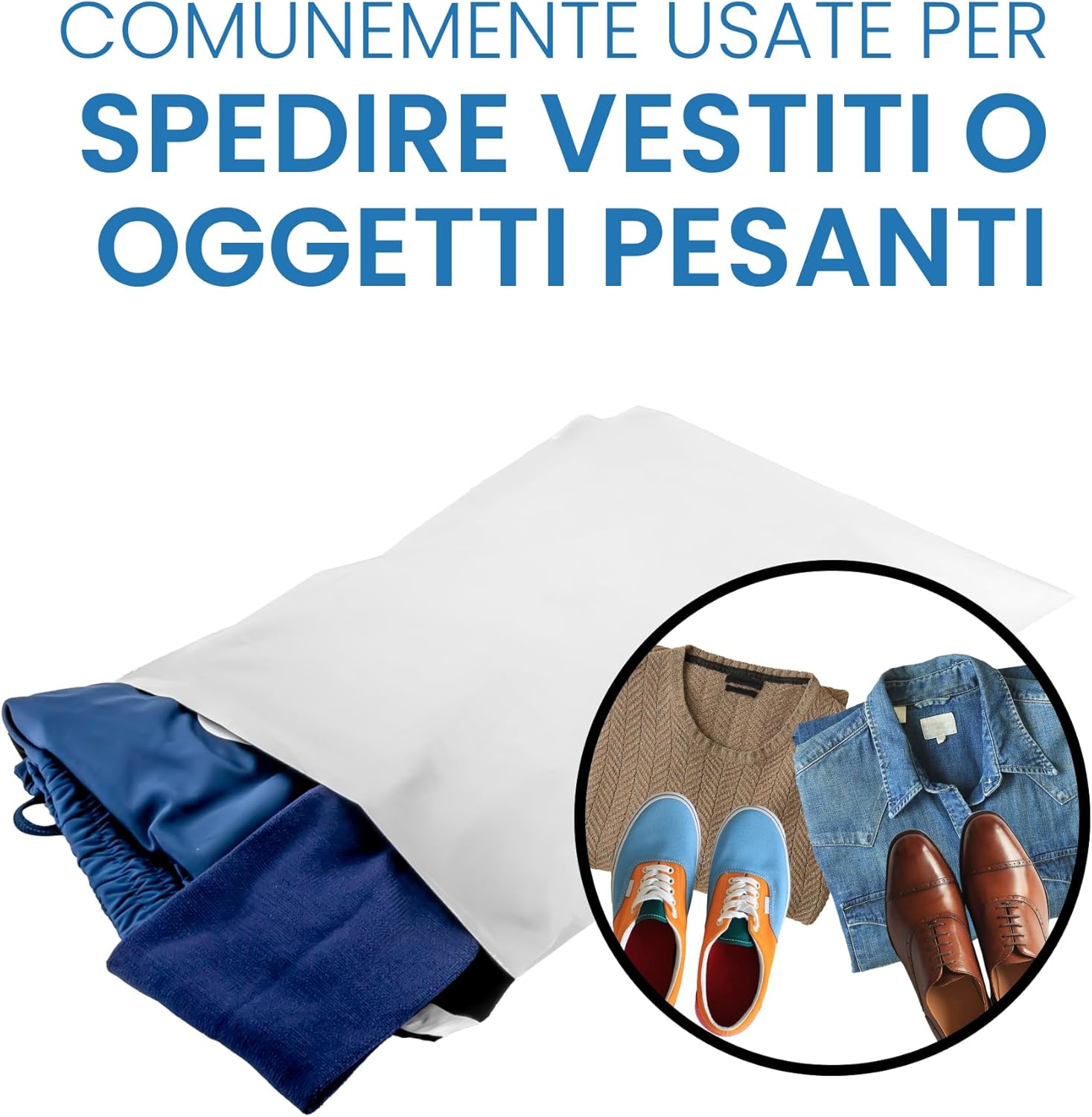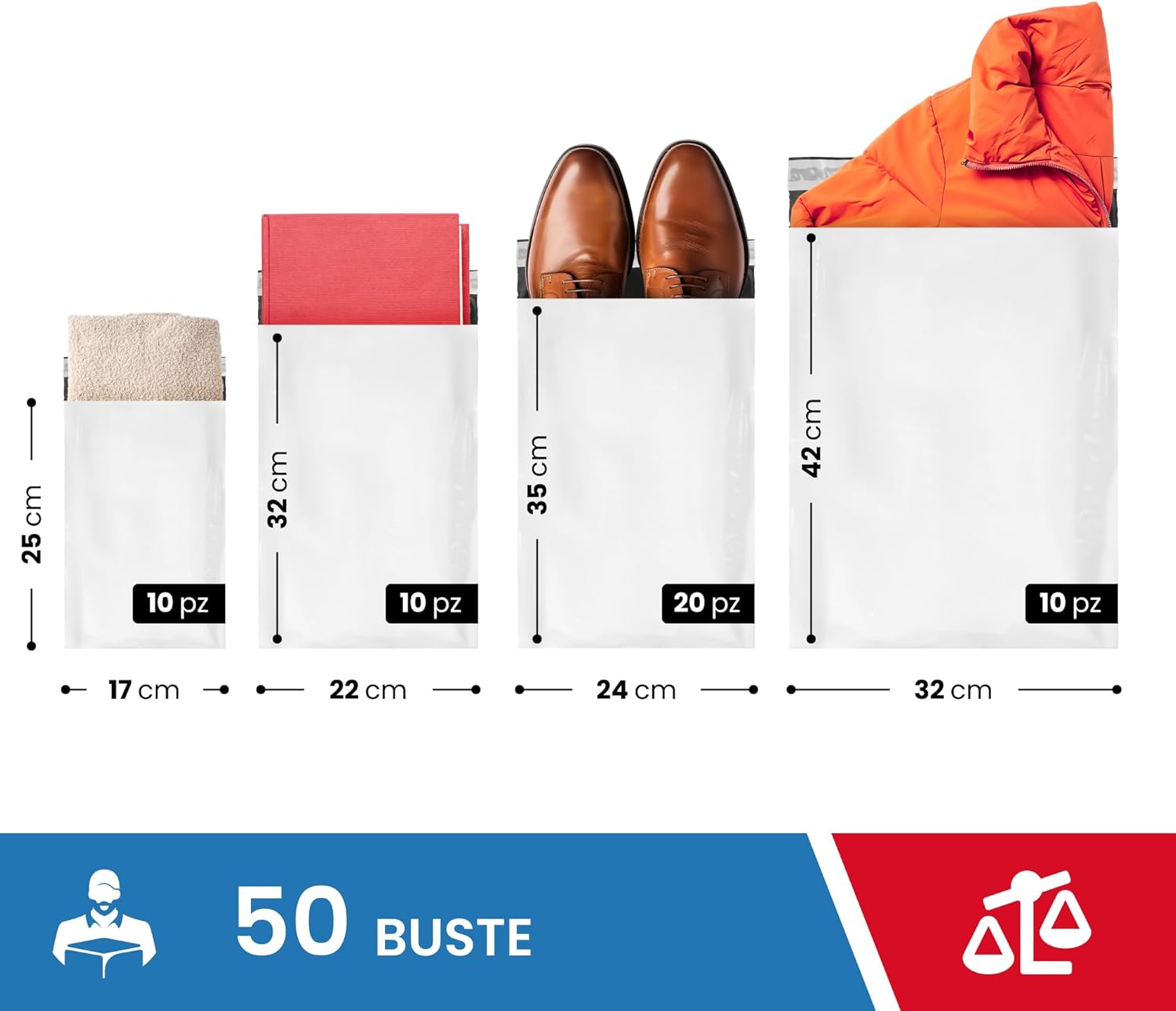 BUSTE PER SPEDIZIONI IN COEX 100% IMPERMEABILI: Buste in polietilene bianco opaco, ideali per nascondere il contenuto e mantenere protetta la privacy del cliente CHIUSURA ADESIVA AUTOSIGILLANTE: La pratica chiusura non necessita di nastro o colla aggiuntiva BUSTE OTTIME PER TRASPORTARE CARICHI ELEVATI: Offrono ottima resistenza per carichi elevati di spedizione e oggetti pesanti, utili per corrieri e per spedizioni ALTAMENTE RESISTENTI AGLI STRAPPI E ANTI-UMIDITÀ: Buste con spessore 55micron con ottima resistenza a strappi e manomissioni per un trasporto sicuro e affidabile PACK ASSORTITO CON 50 BUSTE E 4 MISURE DISPONIBILI: L'intero pack prevede un totale di 50 buste costituite da 10 buste formato 17x25, 10 buste formato 22x32, 20 buste formato 24x35 e 10 buste formato 32x42