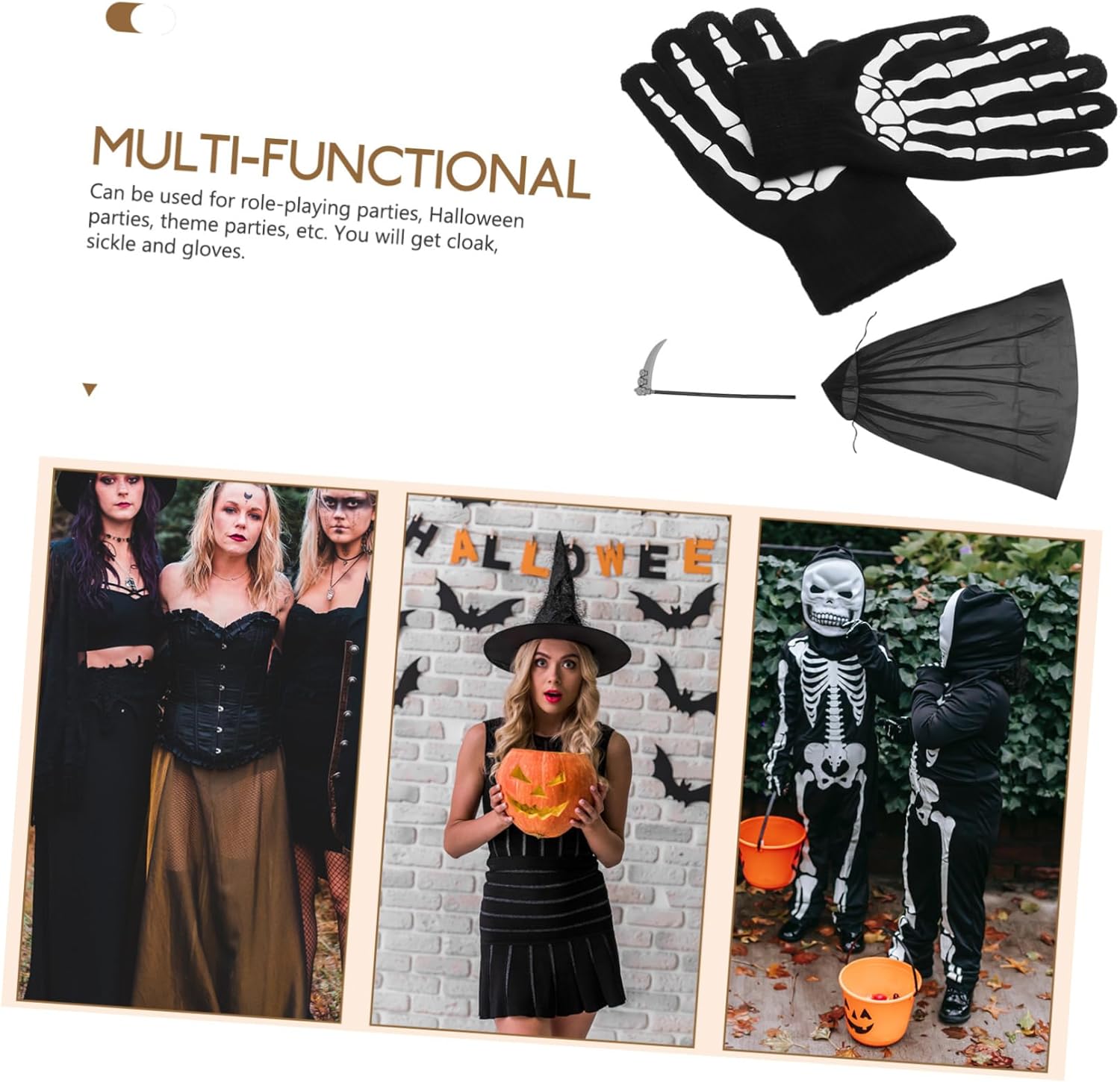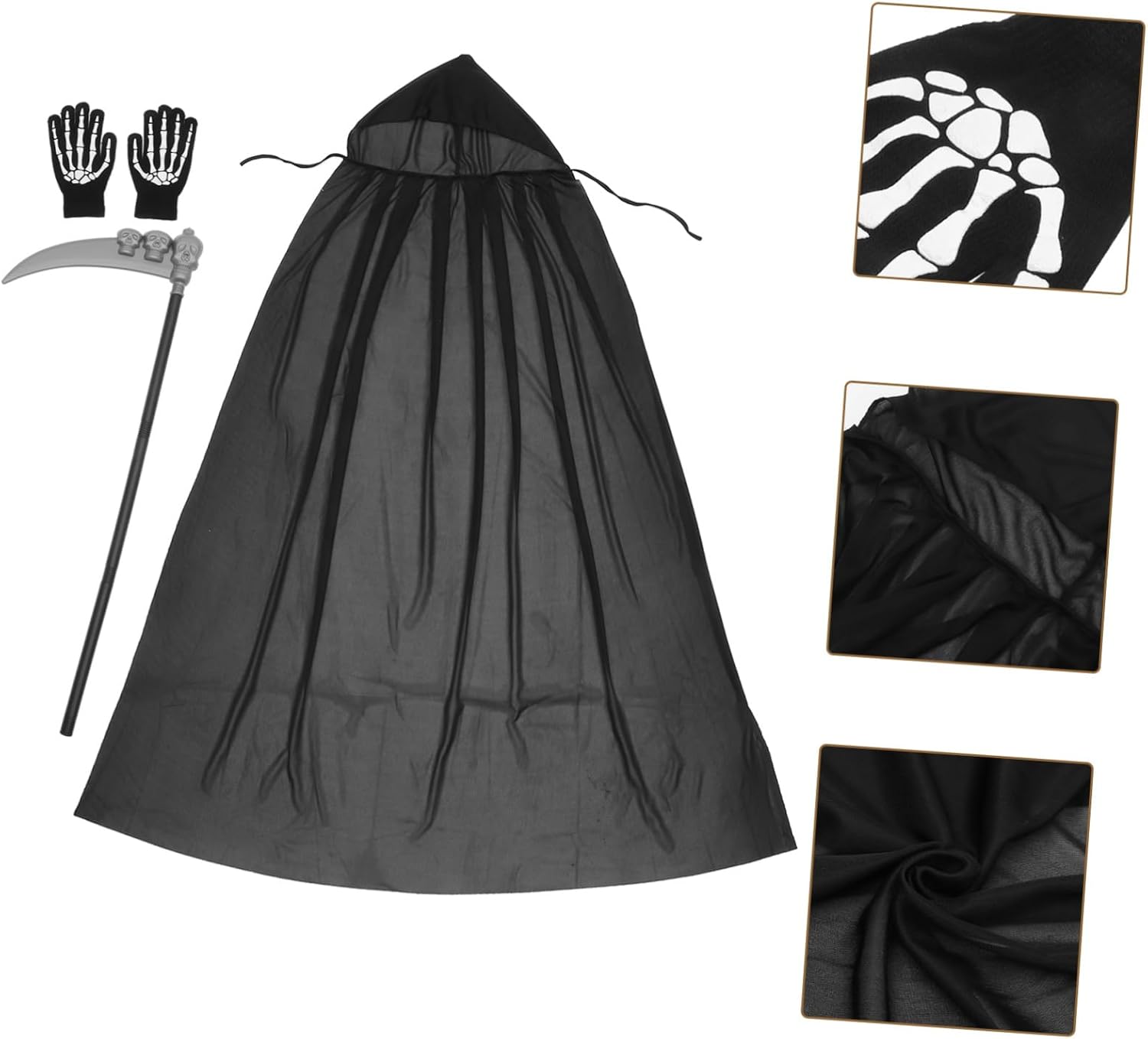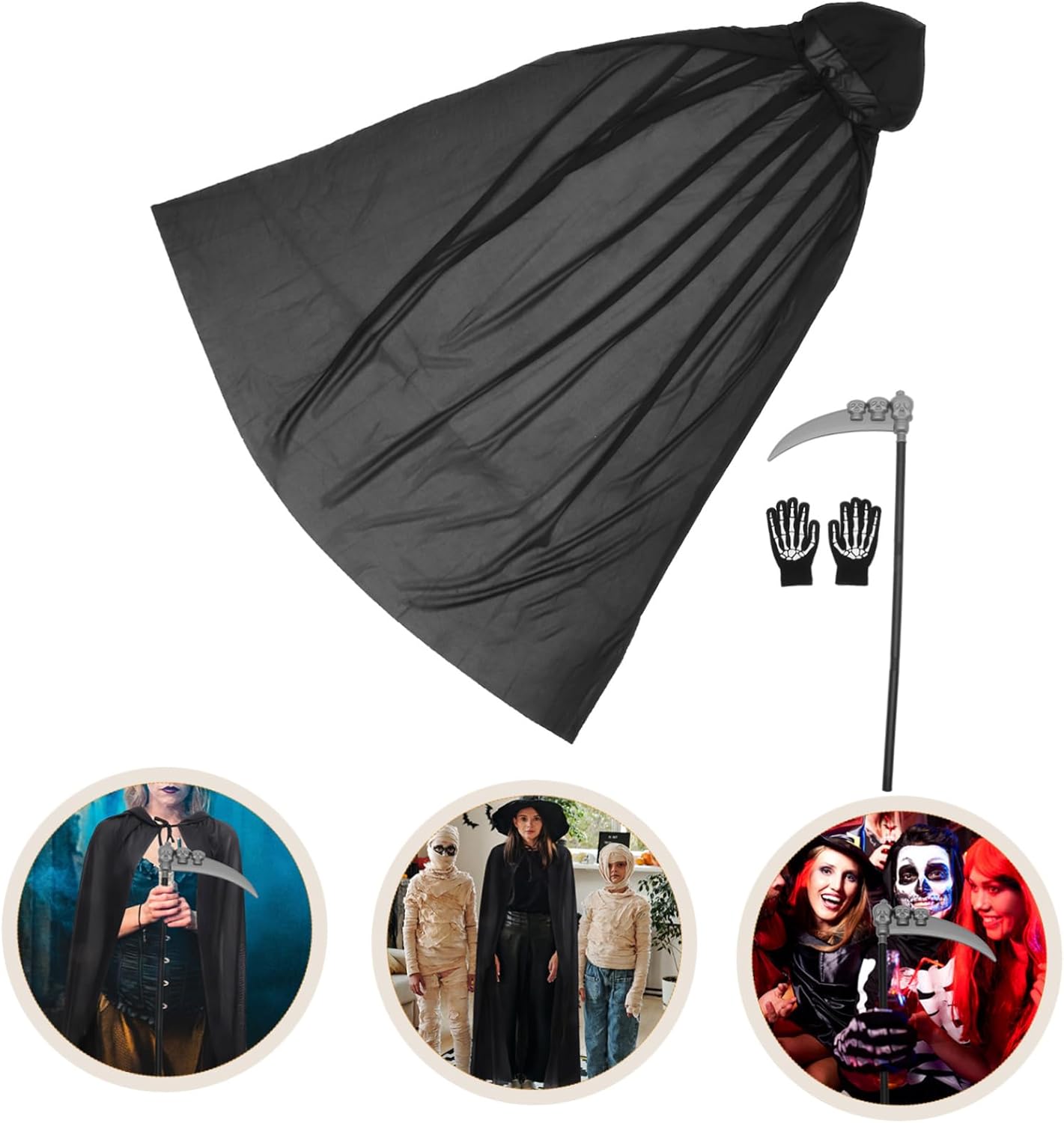 Oggetti di scena di Halloween: stile alla moda, atmosfera misteriosa e abbinamento di colori, decorativi e fantastici, oggetti di scena di Halloween. Decorazione di Halloween - Questo mantello di Halloween può essere utilizzato per giochi di ruolo di Halloween, giochi di ruolo e feste di cosplay, nonché costumi di Halloween per adulti. Costumi per donne - Questo lungo mantello aggiungerà un'atmosfera divertente e misteriosa alla tua festa. È adatto per gli amici ad Halloween o ai compleanni e a loro piacerà. Accessori per costumi di morte di Halloween Guanti di Halloween - Design unico e di alta qualità, che ti rende più attraente e impressionante, può essere usato come guanti per gli amici che amano mantelli di Halloween e costumi di Halloween. COSTUME PER LA FESTA - Questo set di costumi di Halloween ha consistenza, è comodo ed è sicuro da usare, guanti per Halloween