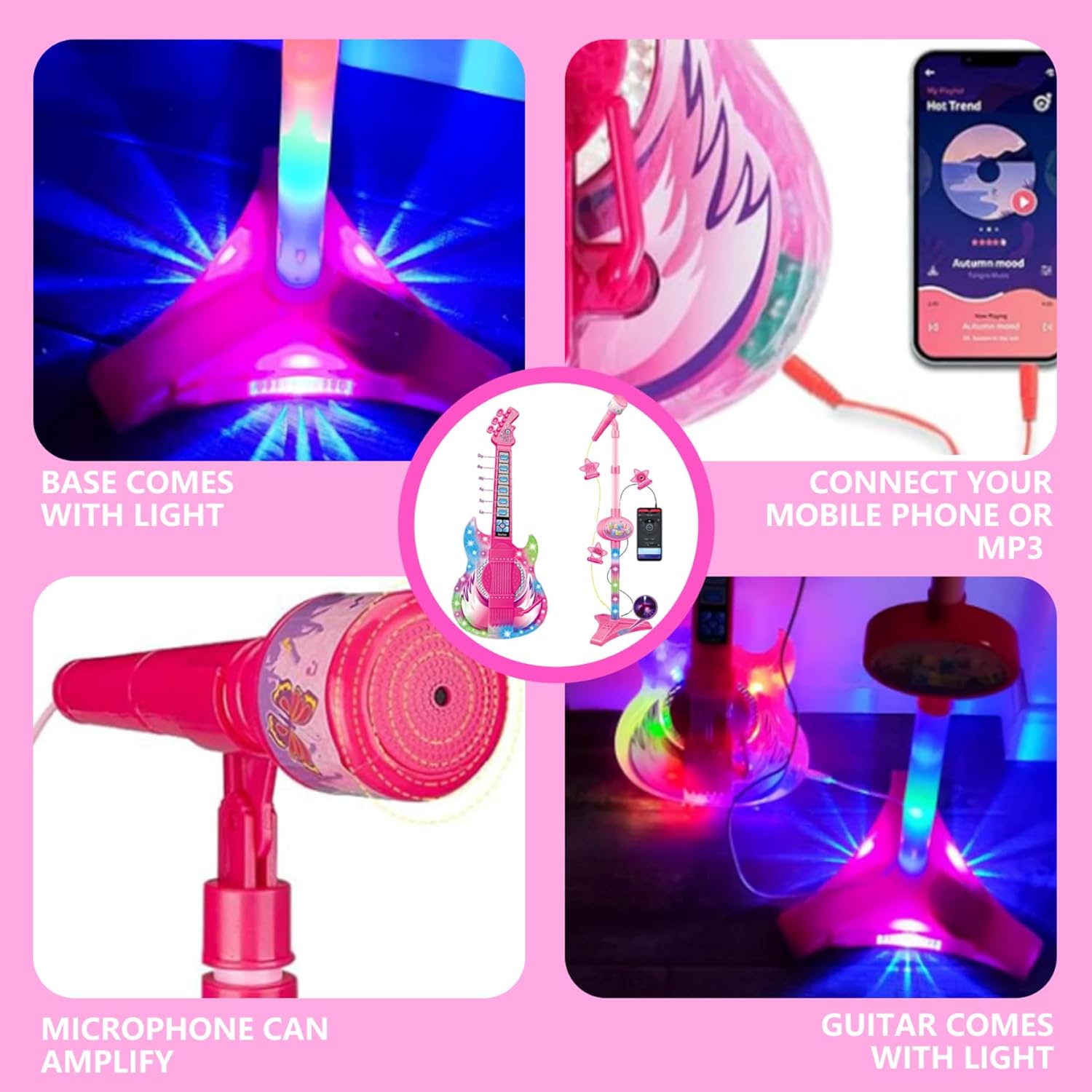 Regolabile e adatto ai bambini: progettato con un supporto di altezza regolabile, questo giocattolo si adatta facilmente ai bambini di età compresa tra 5-9, garantendo comfort e postura corretta durante il gioco, rendendolo perfetto per i bambini in crescita e un uso prolungato. Materiali stabili e sicuri: realizzati con materiali di qualità, non tossici, la chitarra e il microfono sono costruiti per resistere alle sessioni di gioco energetico garantendo al contempo la sicurezza e la durata che ogni genitore desidera. Sviluppo educativo: questo set di strumenti giocattolo aiuta a migliorare il coordinamento degli occhi della mano, le abilità ritmiche e la fiducia attraverso il gioco musicale interattivo, rendendolo un giocattolo di apprendimento ideale per lo sviluppo della prima infanzia. Divertimento musical interattivo: questo set di chitarra e microfono per bambini in 1 incoraggi incoraggia i bambini a esplorare la musica e sviluppare creatività attraverso il canto e il suonare, fornendo intrattenimento avvincente che stimola la loro immaginazione. Luci intense ed effetti sonori: dotato di luci colorate e autentici suoni di chitarra, questa chitarra per bambini elettrici porta l'eccitazione e un'esperienza sensoriale in ogni sessione di gioco, migliorando il divertimento e l'apprendimento.