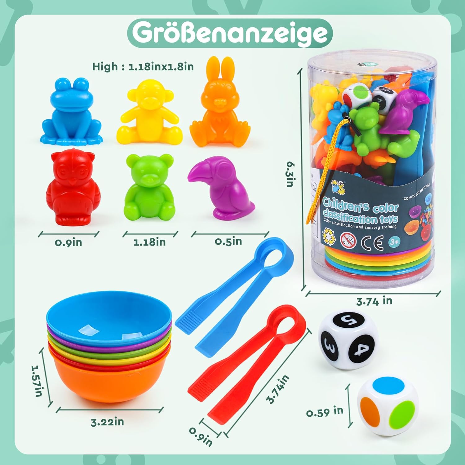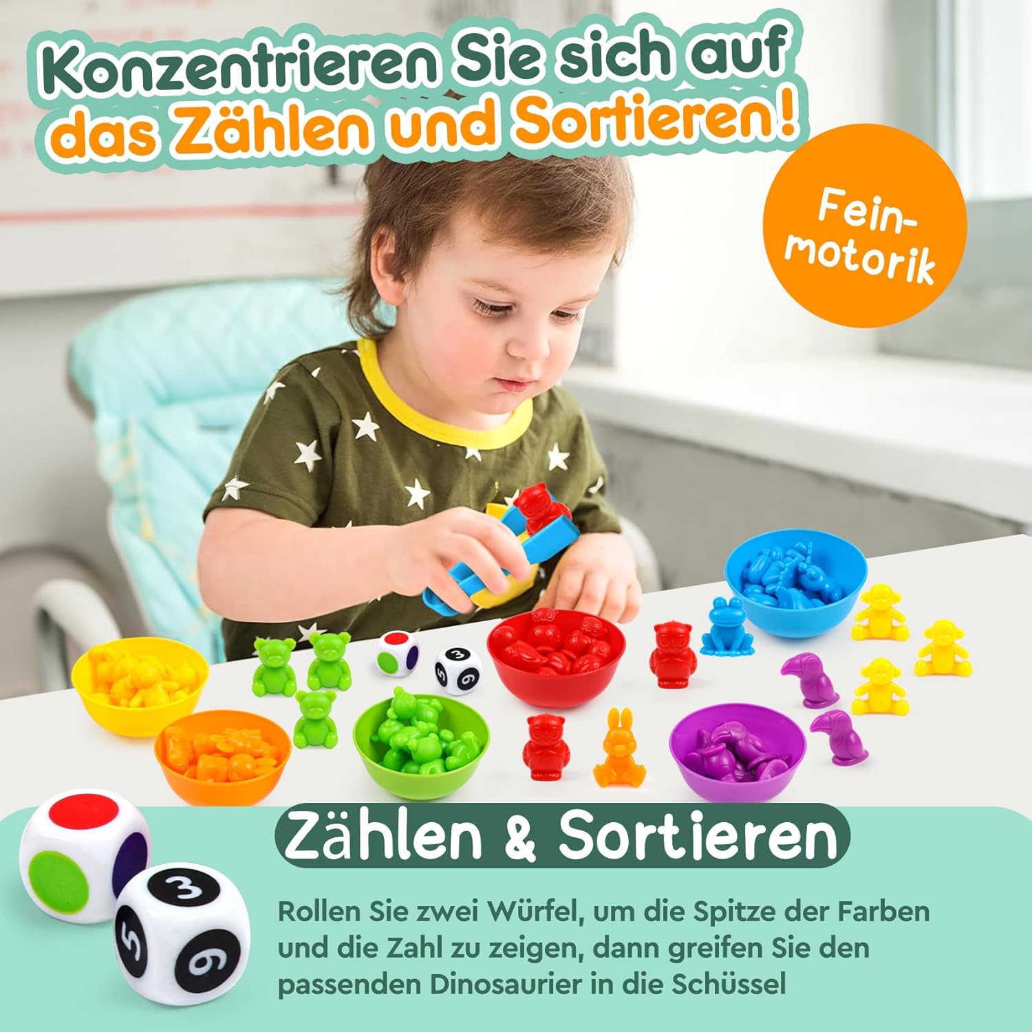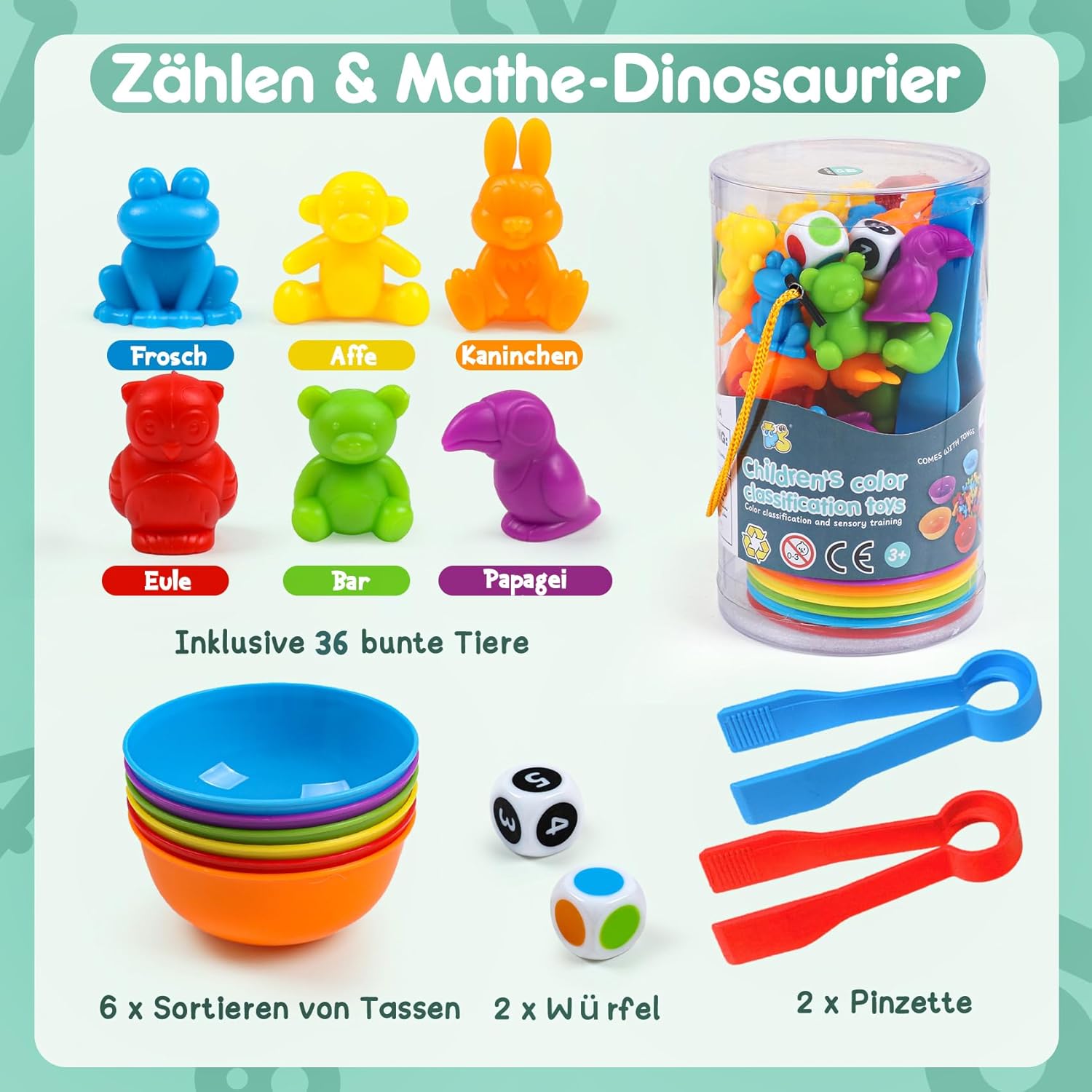 ANIMALI CLASSIFICATI PER COLORE: la nostra collezione di giocattoli comprende sei animali colorati. Ogni animale rappresenta un colore diverso e aiuta i bambini nel riconoscimento dei colori e nell'apprendimento. Questo set contiene sei ciotole giocattolo, ciascuna corrispondente a uno dei sei colori degli animali. I bambini possono ordinare gli animali per colore e metterli nelle ciotole corrispondenti per sviluppare il pensiero logico e la coordinazione. GIOCATTOLI MONTESSORI: Giocando con i giocattoli classificati per colore, i bambini non solo possono divertirsi ma anche sviluppare le loro capacità cognitive. Impari a riconoscere, ordinare e confrontare i colori, il che migliora la tua percezione e comprensione dei colori. IMPARA LE ABILITÀ MOTORIE FINE: per rendere il gioco ancora più interattivo, nel set sono incluse due pinzette. Con le pinzette i bambini possono afferrare i dinosauri e metterli nella ciotola giusta. Ciò promuove le capacità motorie e la coordinazione occhio-mano. MATERIALI DI ALTA QUALITÀ: I nostri giocattoli montessori dai 3 anni in su sono realizzati in plastica atossica e di alta qualità. Sono sicuri e durevoli in modo che i bambini possano goderseli a lungo. I giocattoli sono facili da pulire e possono essere utilizzati sia all'interno che all'esterno. REGALO PERFETTO: questo giocattolo montessori è ideale per i bambini in età prescolare per migliorare il riconoscimento dei colori e le capacità motorie in modo giocoso. Ordina oggi e rendi l'apprendimento colorato ed emozionante!