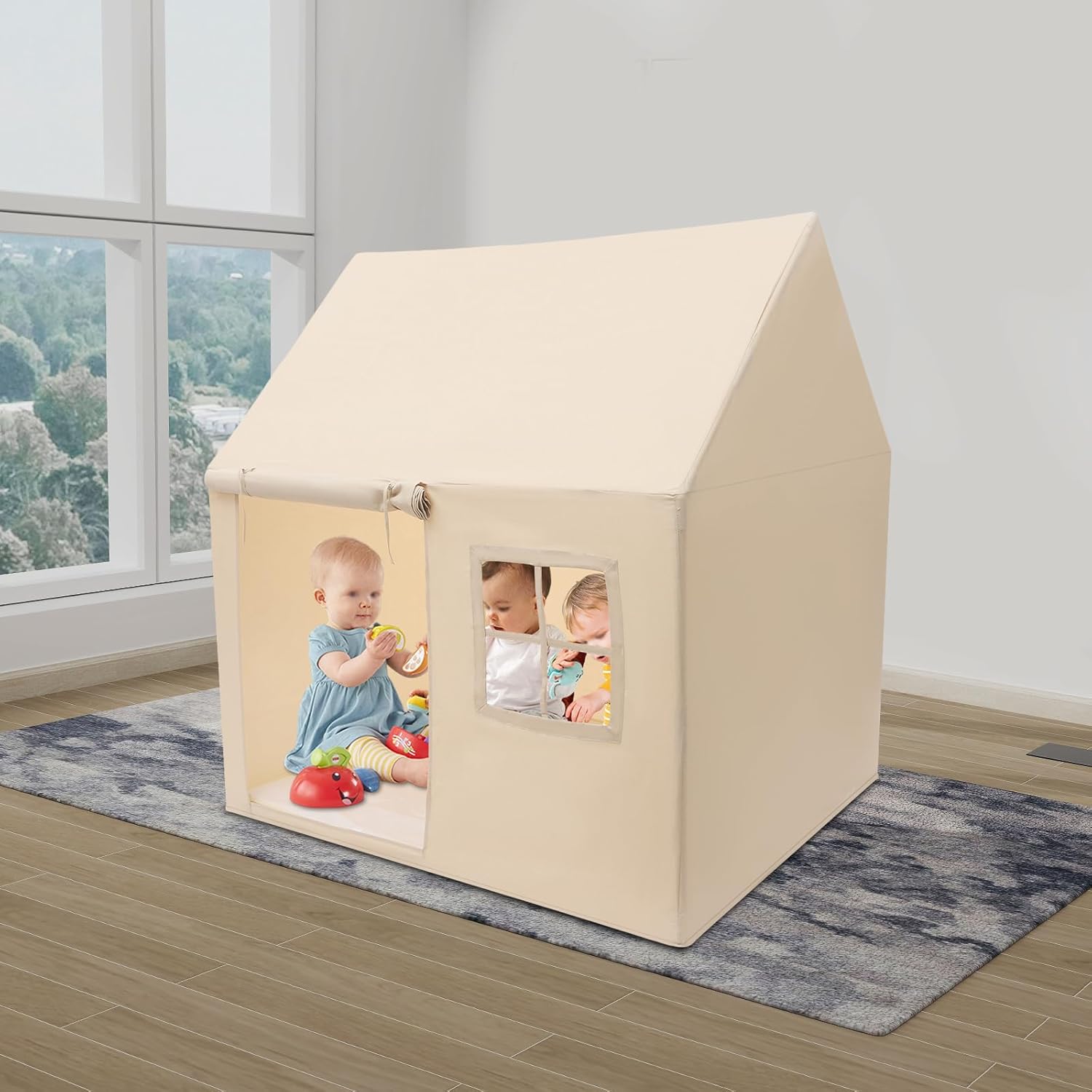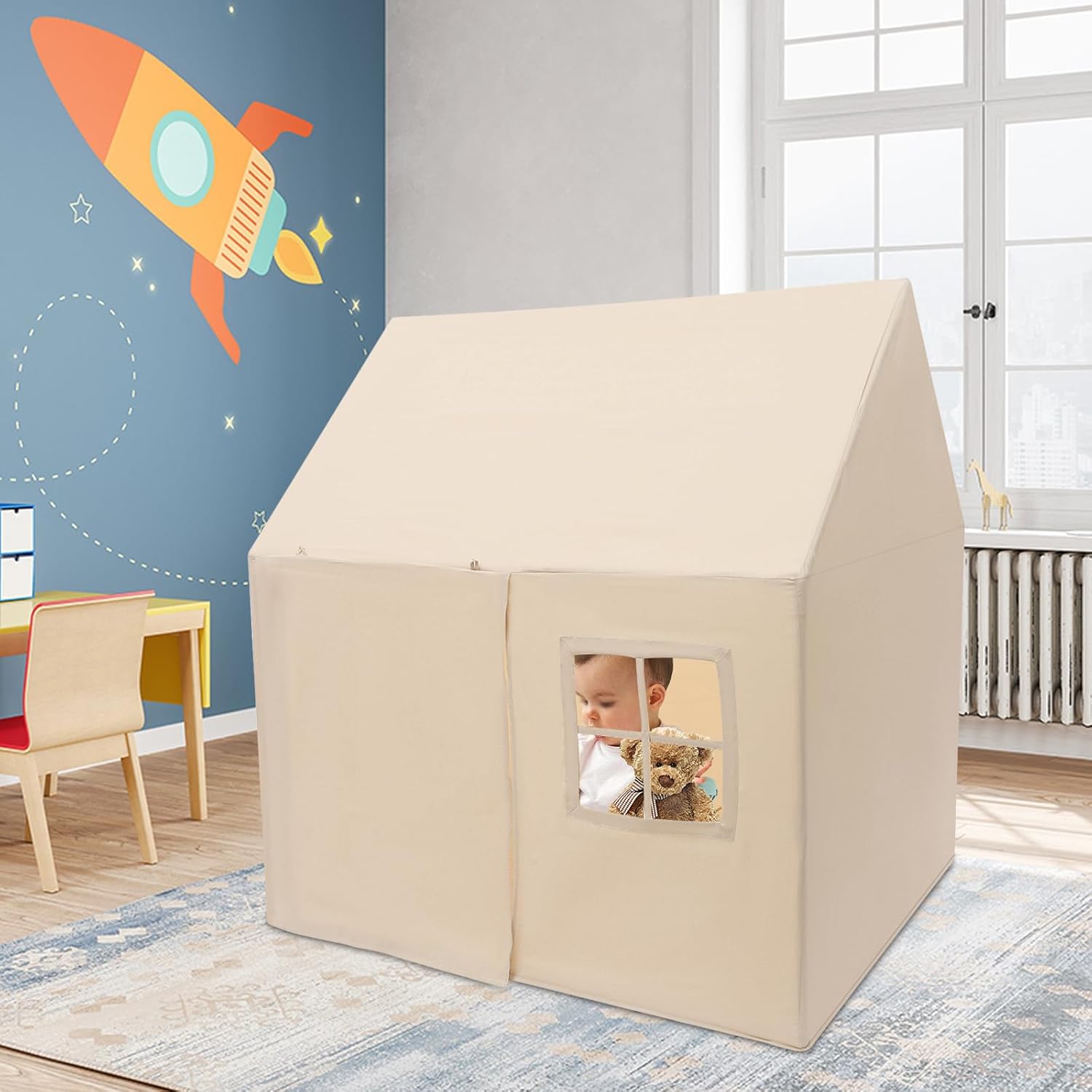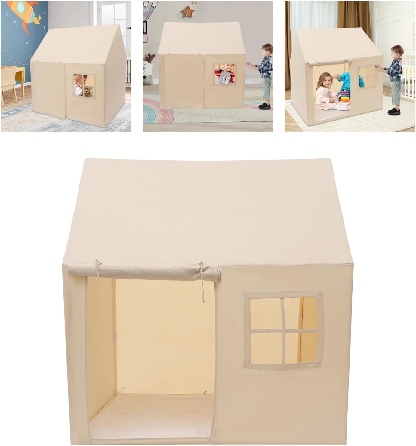 Materiale di alta qualità e durevole: questa tenda per bambini è realizzata in PVC resistente, tessuto e pelle di pesca, è resistente agli strappi, alla corrosione e indeformabile. Garantisce una lunga durata e fornisce ai bambini un ambiente di gioco sicuro e stabile. Spazio spazioso e confortevole: con una dimensione di 125 x 90 x 125 cm, la casetta offre spazio sufficiente per più bambini. Per leggere, giocare o coccolare, la tenda crea un angolo accogliente pieno di divertimento e sicurezza. Design sicuro e ben congegnato: i bordi arrotondati proteggono la pelle del bambino, mentre il morbido tappetino offre un maggiore comfort. La porta arrotolabile garantisce una buona ventilazione e consente un facile accesso. Facile da montare e da utilizzare: grazie al semplice sistema a incastro e al manuale in dotazione, il montaggio avviene in un batter d'occhio. Ideale per la cameretta dei bambini, soggiorno, asilo, feste di compleanno, parchi o picnic. Regalo perfetto per i bambini: il design creativo a forma di cabina rende la tenda un vero e proprio highlight. Un regalo ideale per ragazze e ragazzi dai 3 anni in su, per compleanni, Natale o semplicemente come sorpresa di tanto in tanto.
