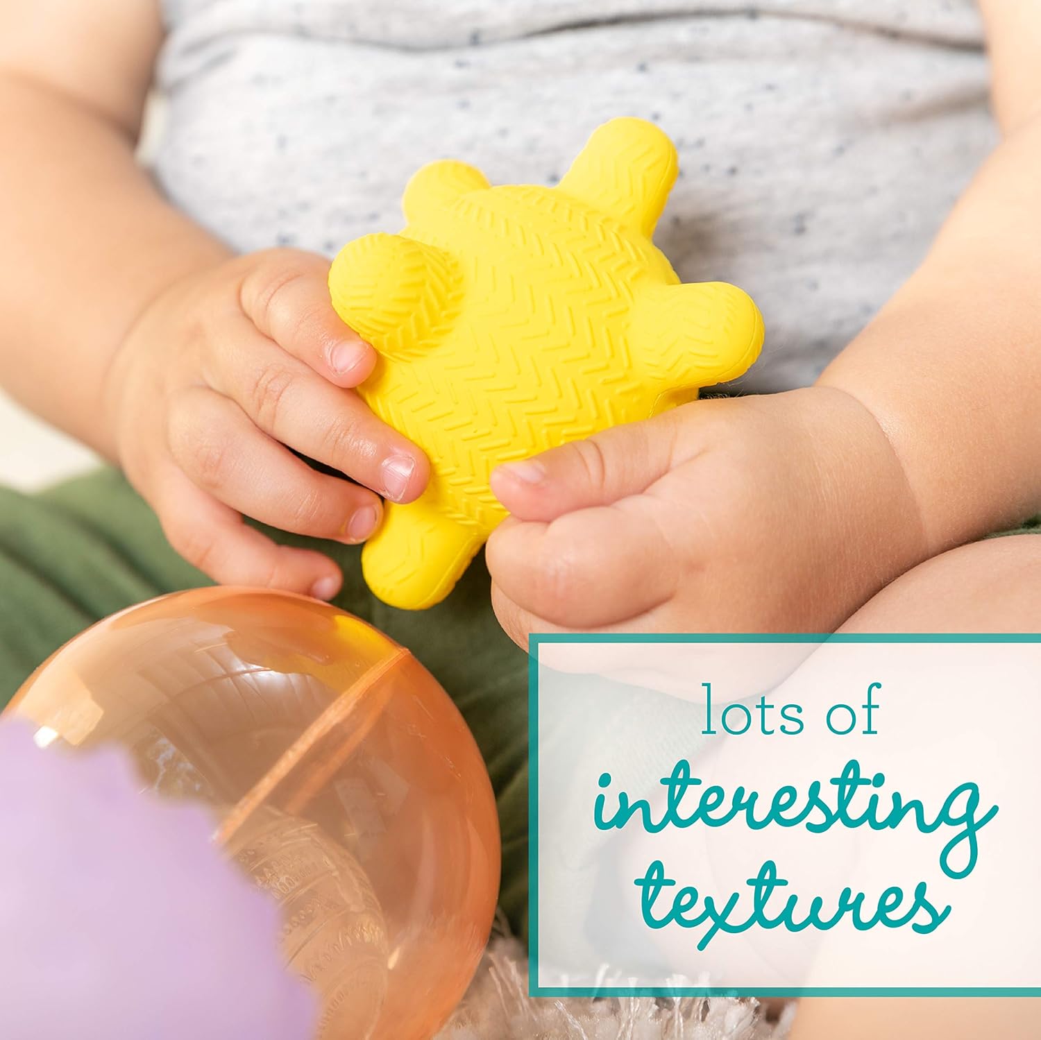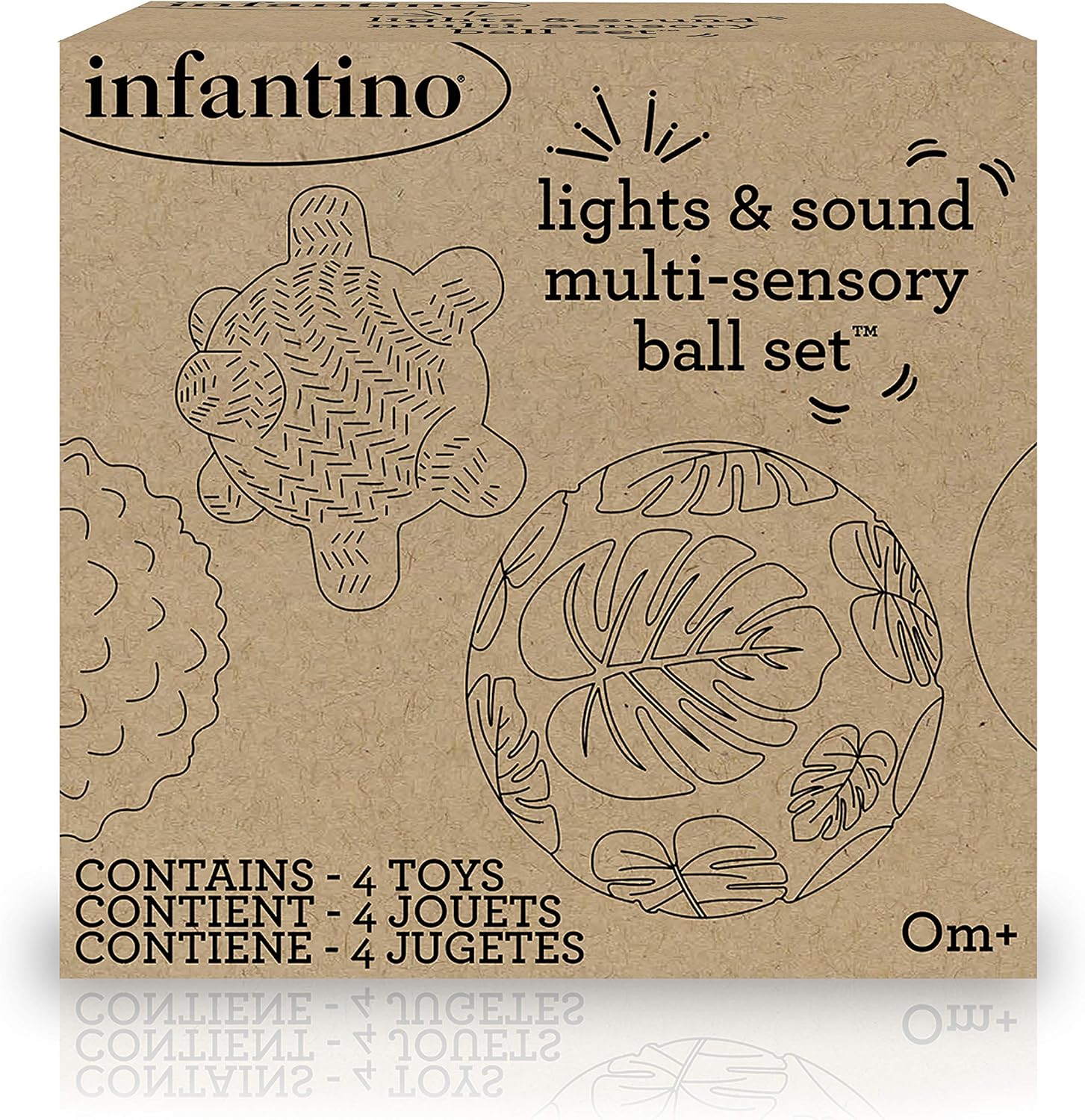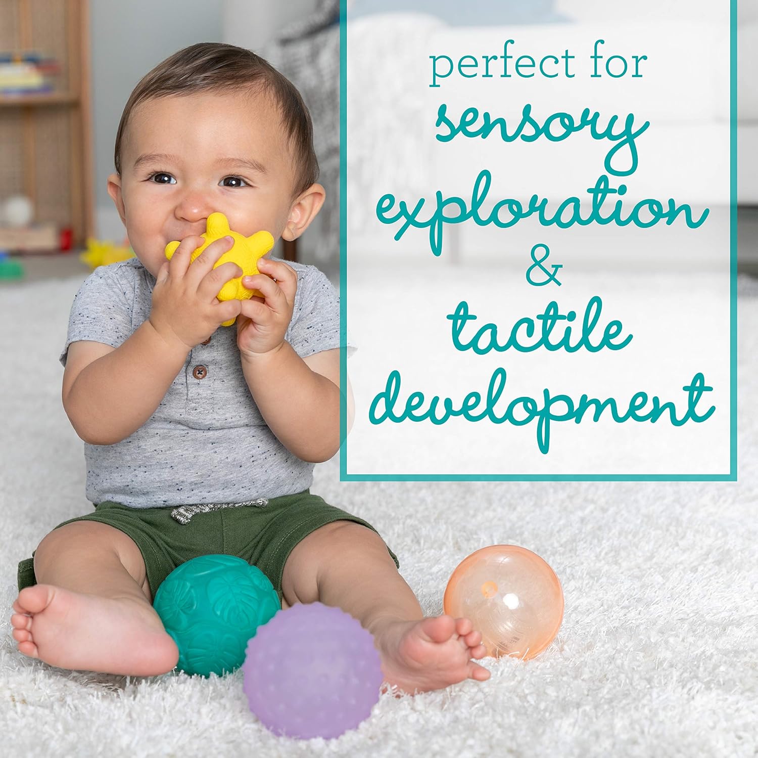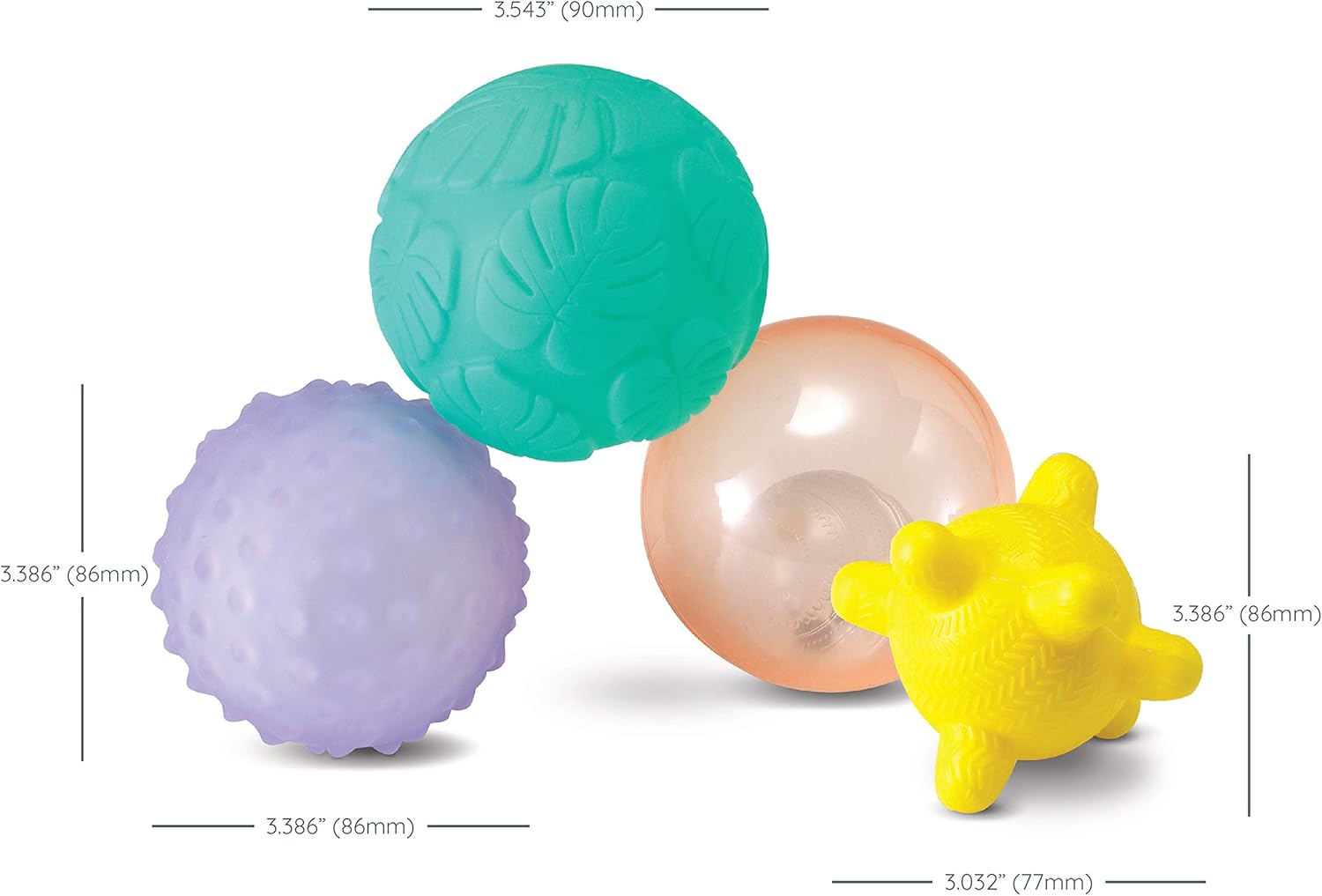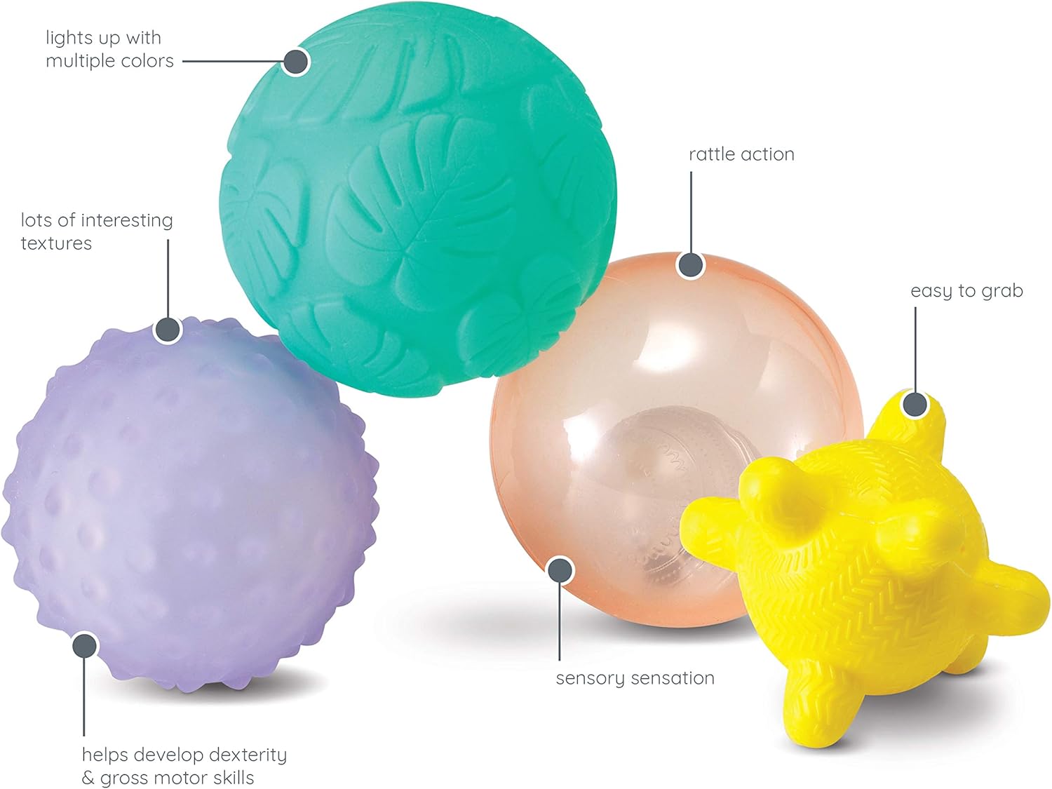 Design: ogni palla testurizzata in questo set è adatta per la dentizione e svolge una funzione unica, la palla irregolare supporta l'esplorazione tattile dei suoni mentre la palla luminosa mantiene il bambino intrattenuto Vantaggi dello sviluppo: incoraggia lo sviluppo delle abilità motorie lorde del bambino e il primo movimento traguardo con questo set coinvolgente e insegna loro causa ed effetto con la palla sonaglio facile da impugnareRPA2023222023 023Ottimo per Regalo: questo set di giocattoli sensoriali per bambini è confezionato in una confezione facile da avvolgere ed è un regalo adatto per ogni occasione, tra cui baby shower, compleanni, Natale, Pasqua e altro ancora Pulizia: Facile da pulire Infantino, prodotti dal design intelligente per genitori felici: Progettiamo in modo intelligente, ci divertiamo e siamo felicissimi quando un'idea evolve il cerchio completo in un prodotto amato e usato ogni giorno dai genitori ovunque Componenti inclusi: 4 palline multi-texture