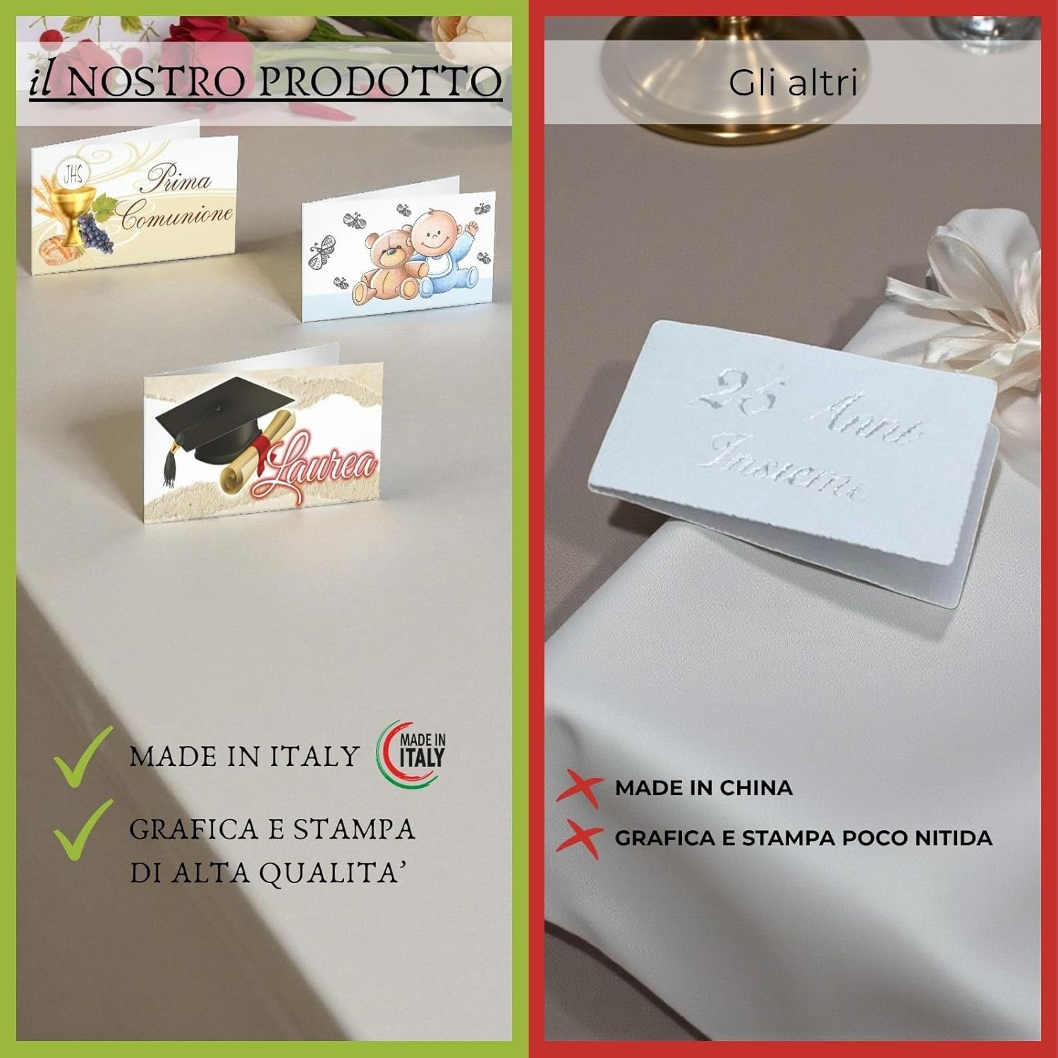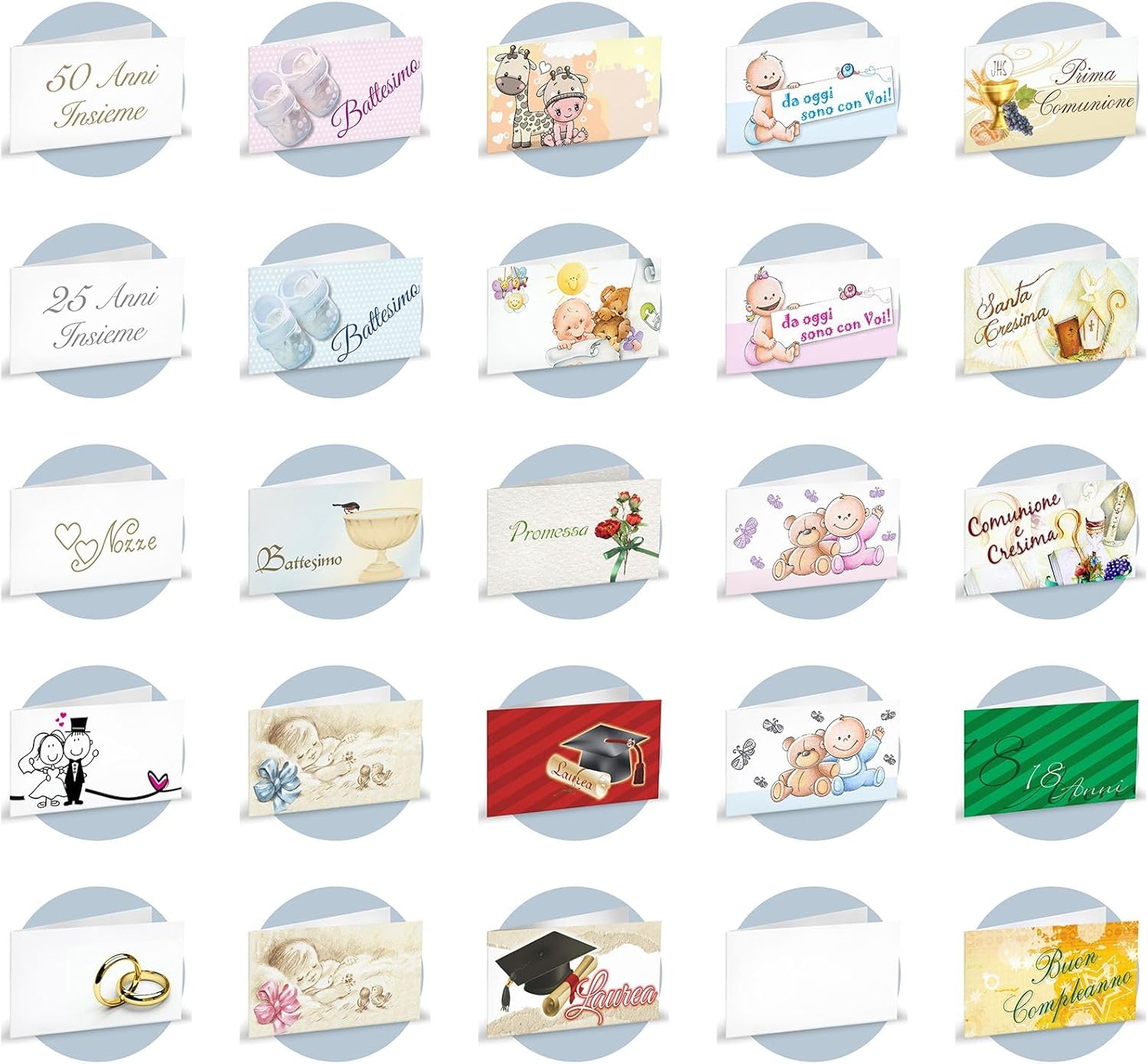 Biglietti personalizzabili adatti ad ogni tipo di celebrazione, in cartoncino stampato a colori. Le carte non vengono vendute in assortimento ma tutte dello stesso modello del codice scelto.