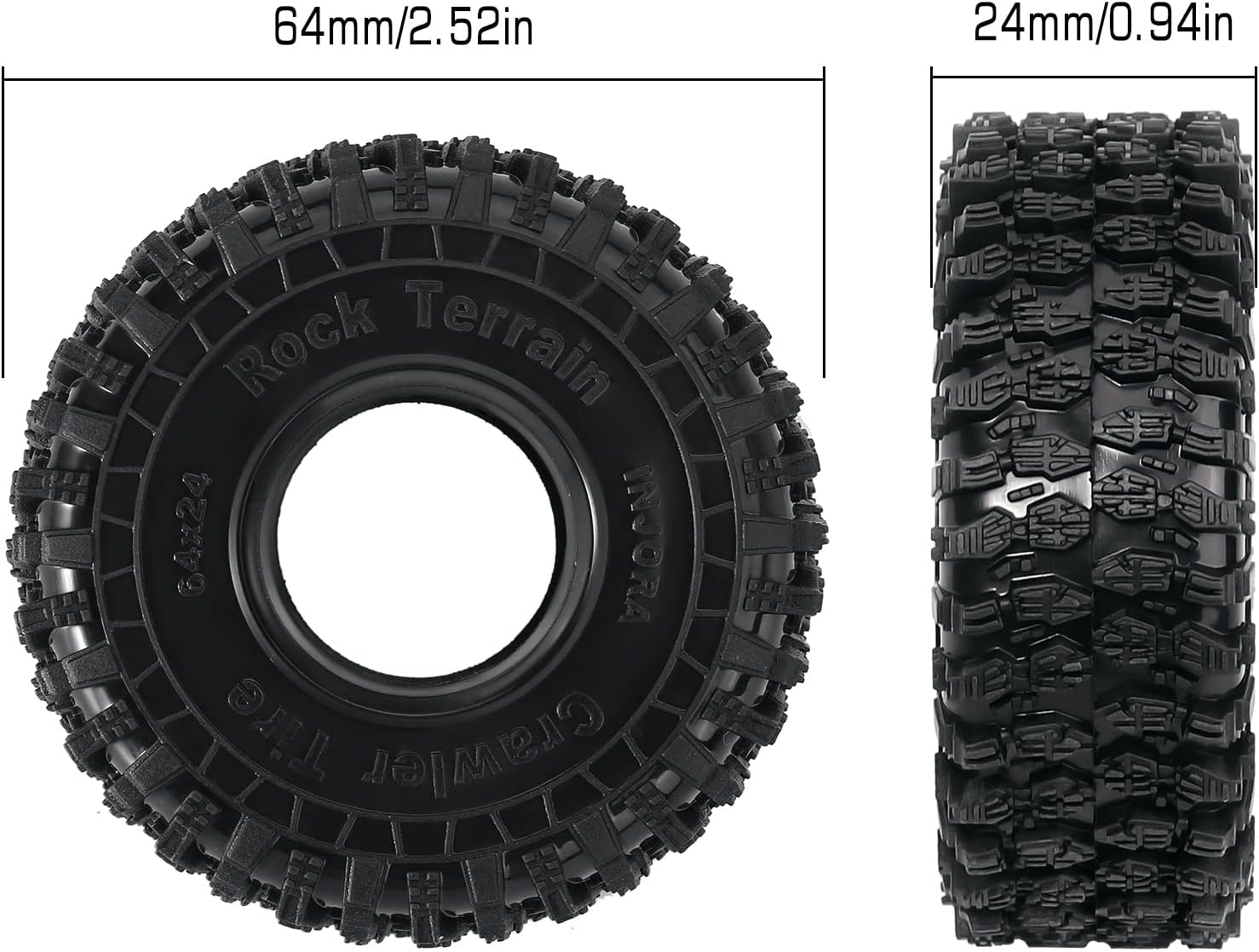 Realizzato in Super Soft & Sticky INJORA S5 New Compound. Blocchi stepped e Sipes multipli creano grip ineguagliato. Incredibile dettaglio in scala per look, affronta terreni difficili in stile scala. Questi pneumatici cingolati 1.0 offrono 64 * 24mm dimensione per la maggior parte delle ruote di beadlock 1.0. Adatto per TRX4M Defender, Bronco, High Trail K10 F150 SCX24 Gladiatore Bronco C10 JLU Deadbolt B17 e altri modelli di auto cingolate.