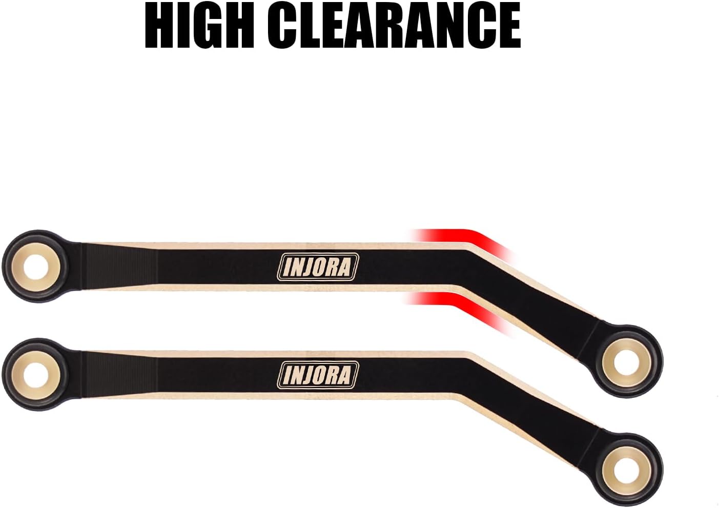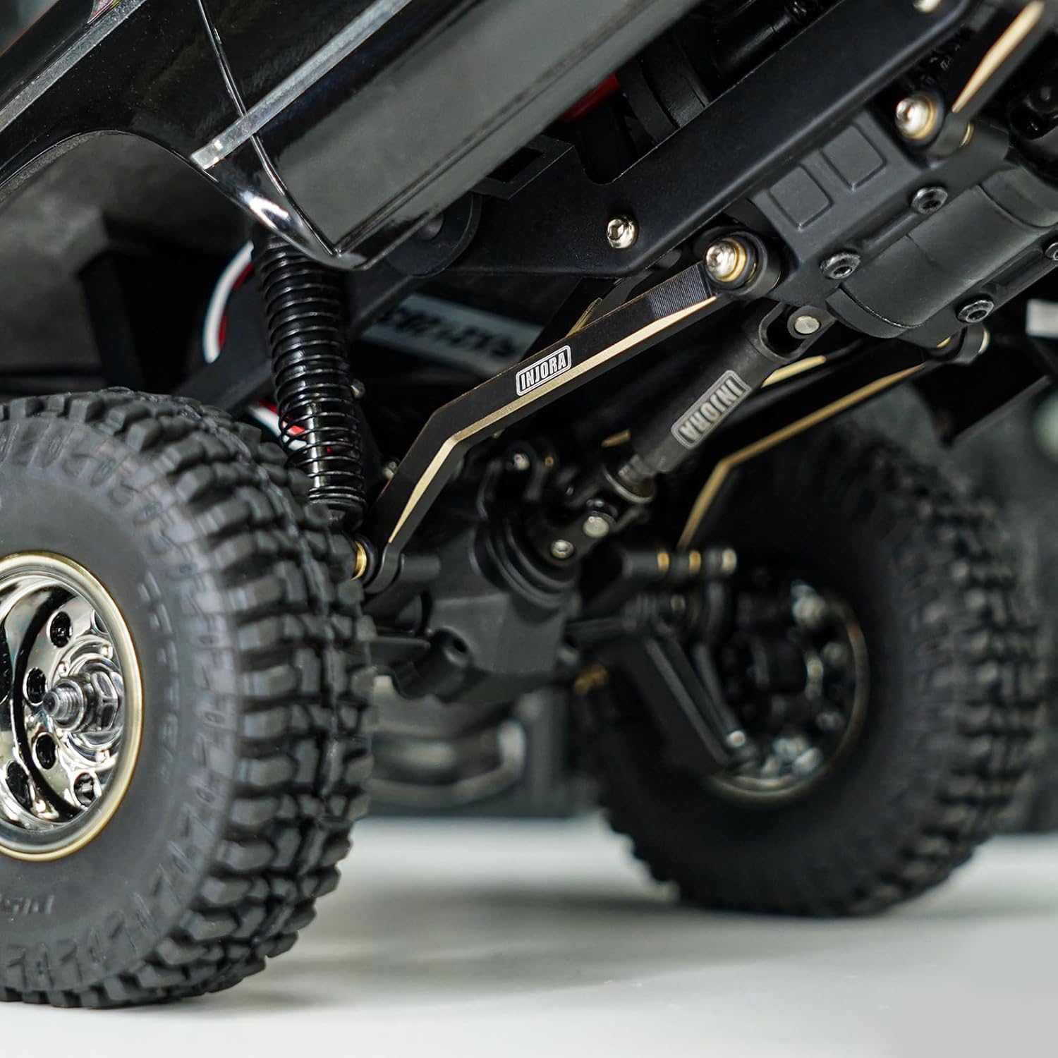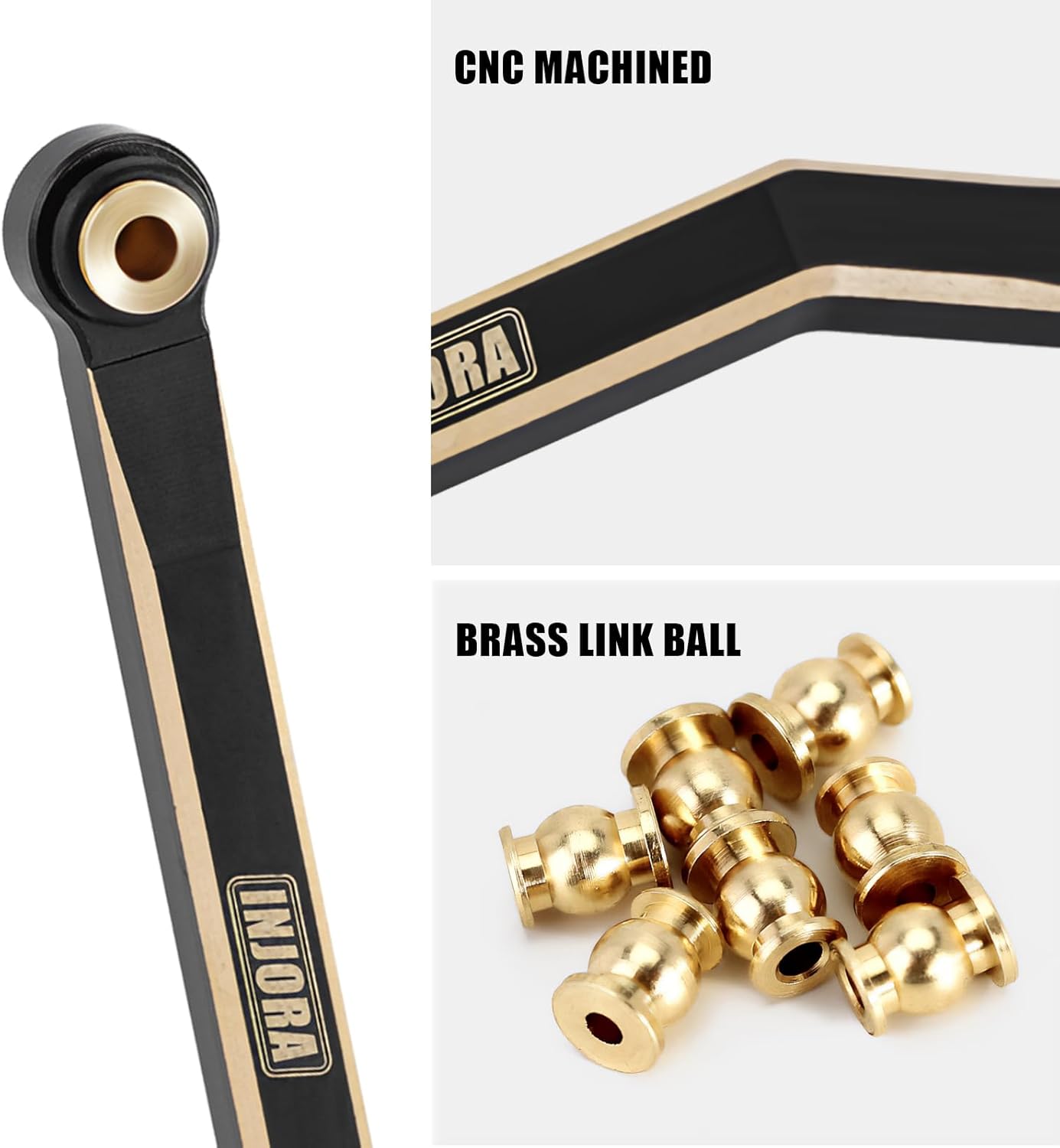 Inciso con il logo INJORA, maglie in ottone lavorate a CNC per la massima durata. Le maglie in ottone pesanti possono abbassare il baricentro per migliorare la stabilità. Sostituisci le maglie in plastica di serie FCX24, offrono una corsa più fluida. I collegamenti ad alta distanza eliminano l'avvolgimento dell'asse e lo sterzo indesiderato dell'asse e hanno una maggiore distanza in salita. Dotato di due dimensioni di sfere di collegamento, ammortizzatori di serie o di aggiornamento INJORA facili da installare.