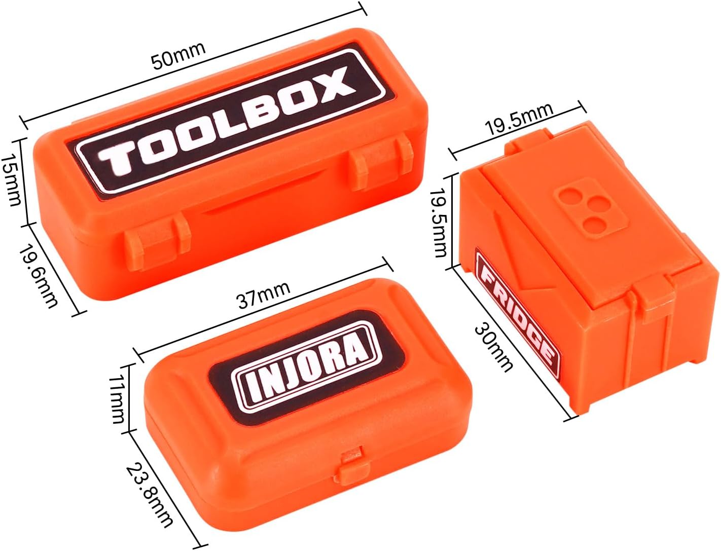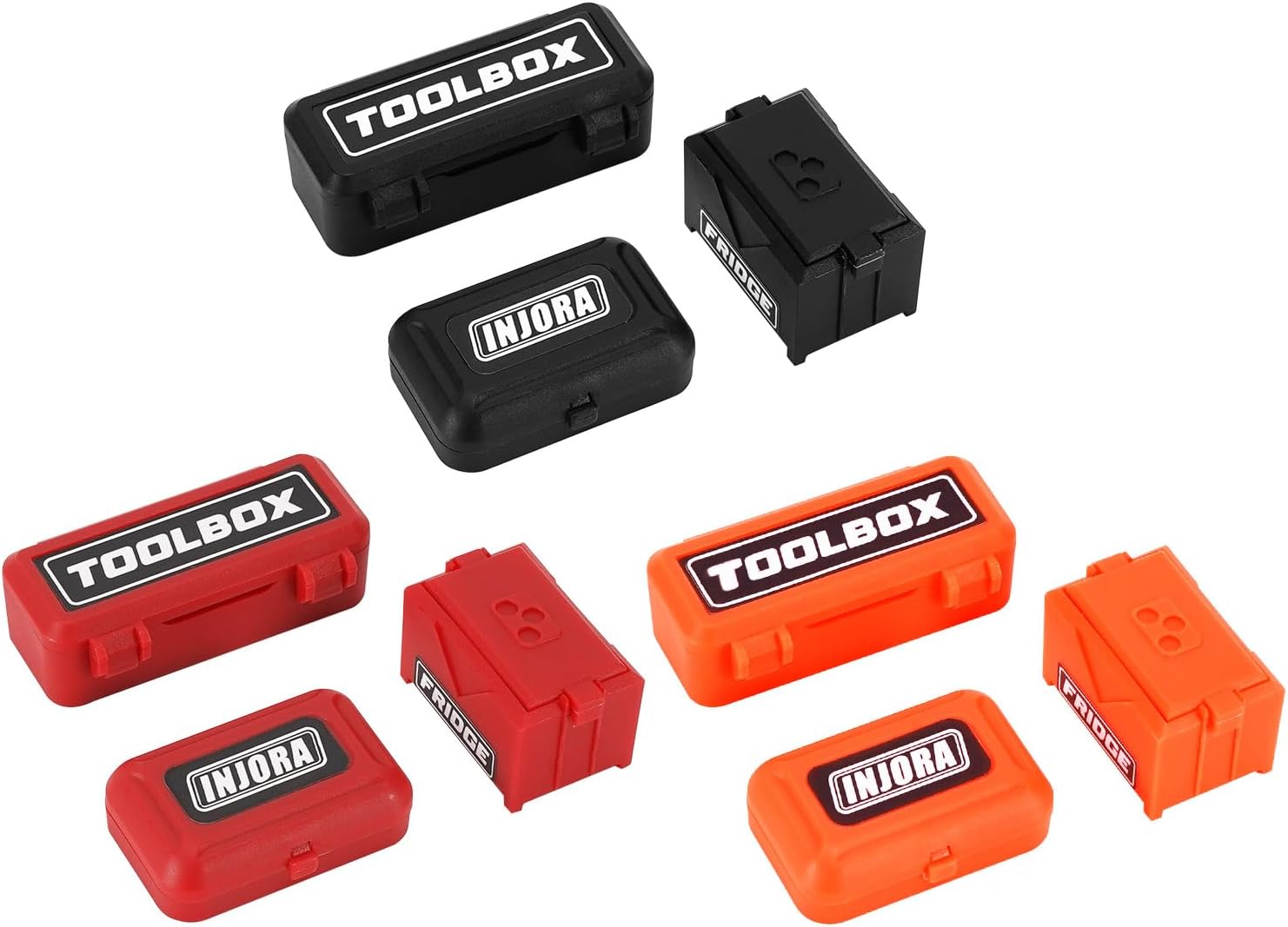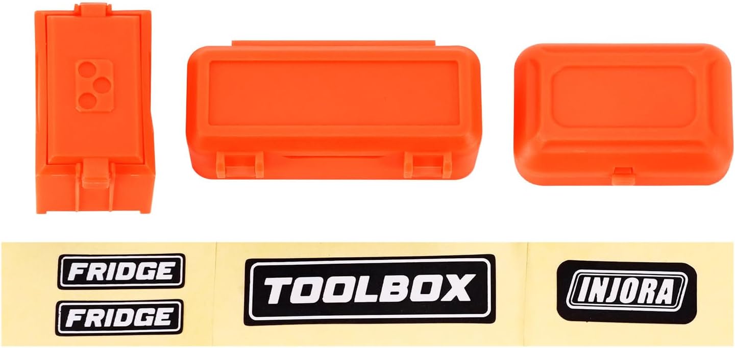 Queste cassette possono essere aperte e chiuse. Stampate a iniezione in plastica, più raffinate rispetto alla stampa 3D. Include adesivi INJORA, un ottimo modo per aggiungere dettagli eccellenti e migliorare l'aspetto del tuo micro veicolo. Peso: 13g (0,028lb), dimensioni: 50*19,6*15mm, 37*23,8*11mm, 30*19,5*19,5mm. Adatto per TRX4M SCX24 1/18 1/24 RC Crawler.