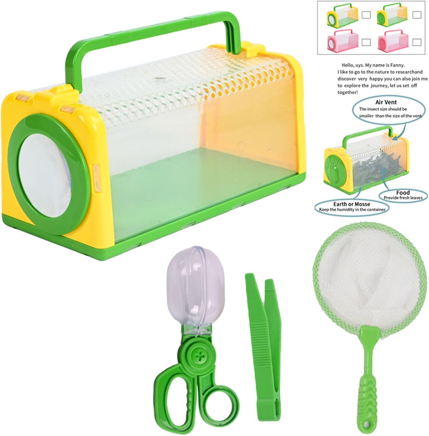 Ideale per l'uso in cortile, giardino o attività all'aperto scolastiche, questo kit di osservazione Insecta per l'apprendimento interattivo e le connessioni dei genitori del bambino Consenti al tuo bambino la curiosità sulla natura con i nostri kit di osservazione Insecta all'aperto per bambini, progettati per fornire un'esplorazione Insecta sicura e coinvolgente Utilizzare materiali ABS, questo kit include una gabbia di osservazione traspirante, lente d'ingrandimento, pinzette e una rete di cattura Insecta per un'esplorazione completa Incoraggia le mani e l'indagine scientifica con questo giocattolo educativo naturale, ideale per i giovani esploratori dei bambini per bambini dai 3 anni in su, in particolare quelli interessati all'Insecta e alle scienze naturali, favorendo lo sviluppo educativo precoce