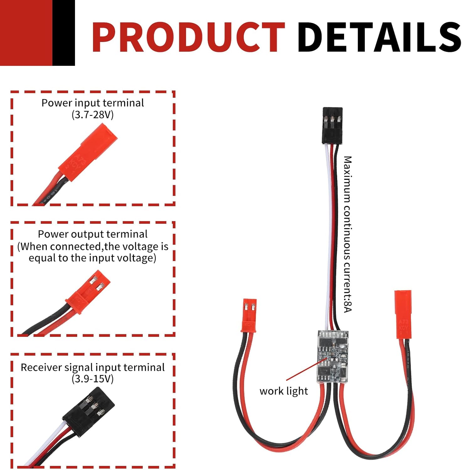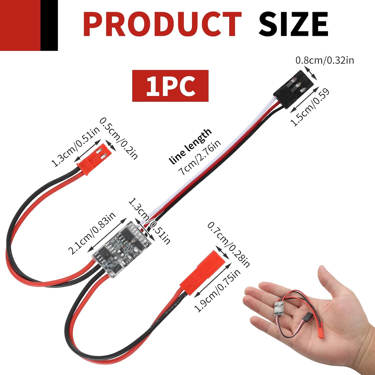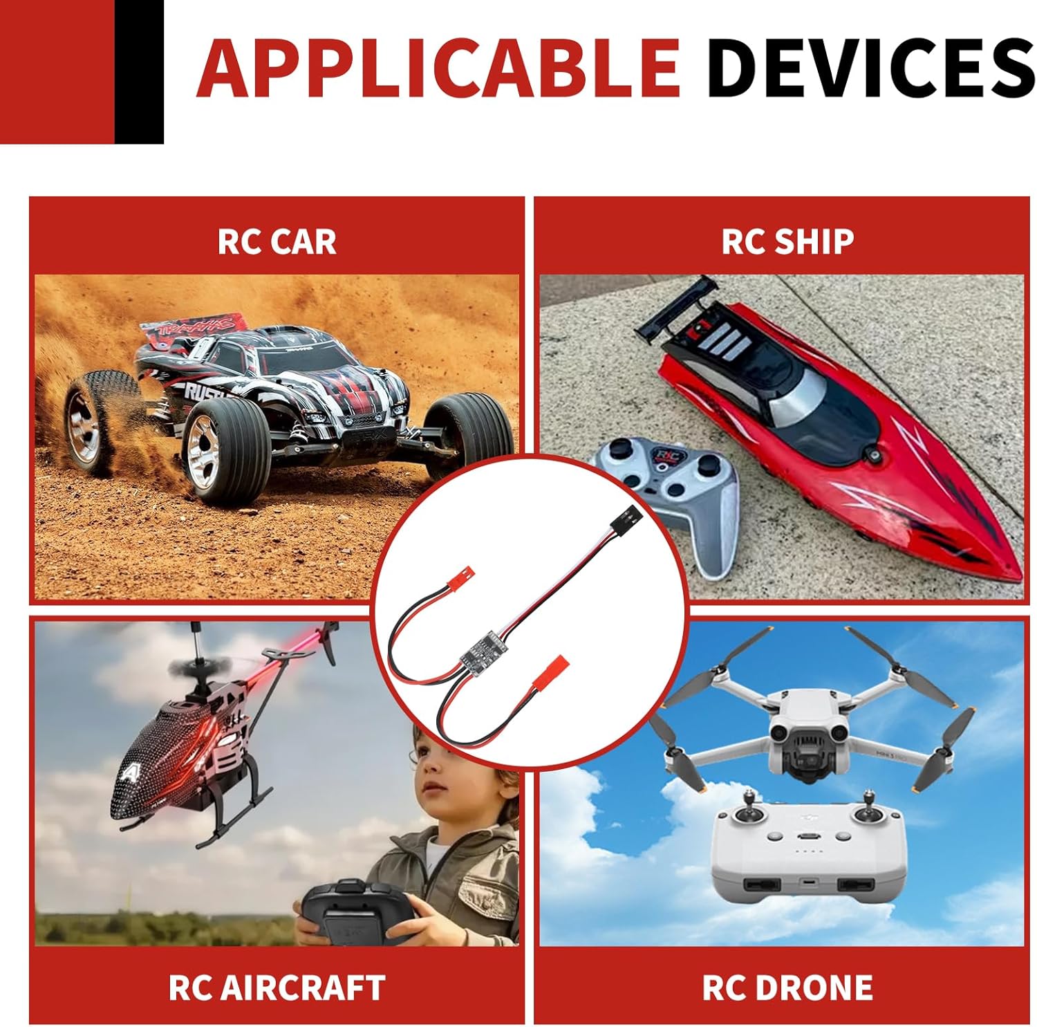 Contenuto della Confezione e Facilità di Installazione: La confezione include un interruttore RC insieme a cavi JST maschio e femmina. Questo interruttore può essere collegato facilmente al canale AUX del ricevitore o ad altri canali a tua scelta. Attivando l’interruttore corrispondente sul trasmettitore, l’interruttore RC si aprirà o chiuderà, offrendo un controllo immediato. Controllo Semplice di Accessori Vari: Utilizzando questo interruttore elettronico, puoi accendere o spegnere facilmente luci, sistemi di fumo, dispositivi di rilascio bombe e coperture per aerei tramite il telecomando. Questo ti permette di personalizzare l’esperienza di utilizzo dei tuoi modelli RC, rendendola più interattiva e divertente. Installazione Rapida Senza Configurazioni Complesse: L’installazione è estremamente semplice: basta collegare l’interruttore all’oggetto che desideri controllare, senza necessità di configurazioni complesse. Assicurati solo che il canale della tua radio sia impostato su +/- 100 % per garantire un funzionamento senza problemi, così da poter iniziare a divertirti subito. Compatibilità Estesa con Modelli RC: Questo interruttore è progettato per funzionare con una vasta gamma di modelli RC, tra cui auto, camion, aerei, elicotteri, quadricotteri e droni. La sua versatilità lo rende un accessorio indispensabile per appassionati e professionisti, adatto a molteplici applicazioni. Specifiche Tecniche Affidabili: Questo interruttore offre una tensione di ingresso di 3,7 - 28 V e una corrente di carico fino a 8A (corrente continua). Grazie alle sue specifiche robuste, è ideale per applicazioni RC che richiedono un funzionamento stabile e duraturo. Puoi contare su di esso per affrontare anche le sfide più impegnative.