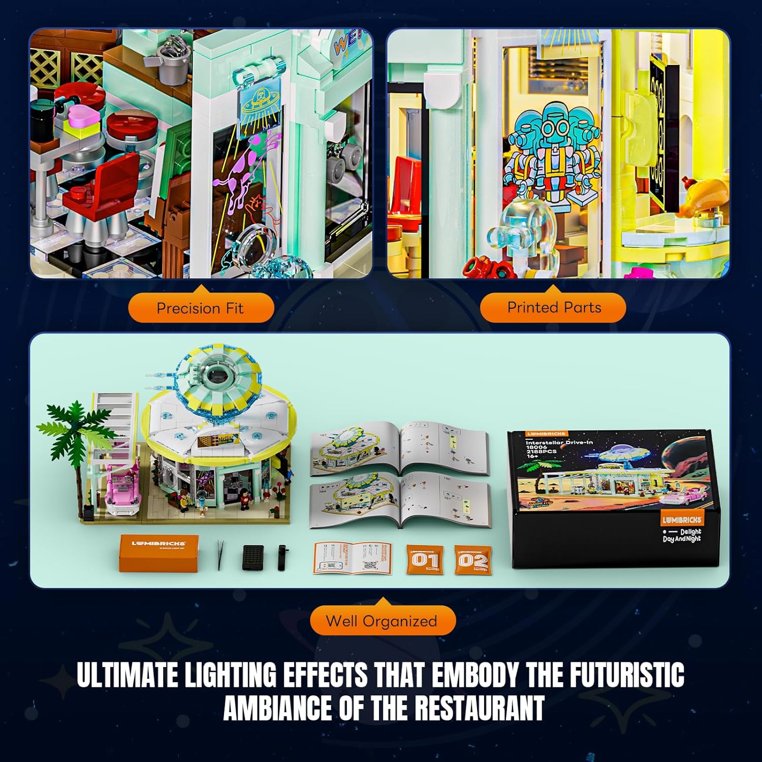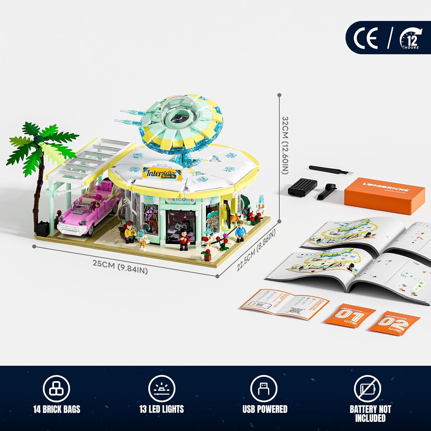 【Ristorante Drive-In Retro-Futuristico】 Ricrea un classico diner americano con tetto a disco volante futuristico, più posti auto e drive-thru, e architettura iconica in stile Googie – un pezzo da collezione straordinario per appassionati e amanti dei road trip. 【Struttura Modulare & Smontabile】 Il ristorante e le tettoie dei parcheggi possono essere facilmente assemblati, smontati e riorganizzati per creare scene personalizzate, offrendo infinite possibilità creative per il gioco e l’esposizione. 【Dettagli di Scena Immersivi】 Include area bar, finestre per ordinare, zona esterna, luci al neon ed elementi interni dettagliati come tavoli, sedie, jukebox e cibo, permettendo alle minifigure di interagire in scene realistiche da diner. 【Veicoli Classici & Interazione con le Figurine】 Include auto in stile retrò e quattro minifigure (barista/chef, due camerieri e un cliente elegante), portando vita all’Interstellar Drive-In – perfetto per collezionisti e esposizioni. 【Illuminazione LED Integrata & Garanzia 2 Anni】 14 punti luce LED evidenziano il disco volante e l’esterno del diner, integrando perfettamente luci e costruzione. Supportato da 2 anni di garanzia, ideale come regalo unico o pezzo da collezione.