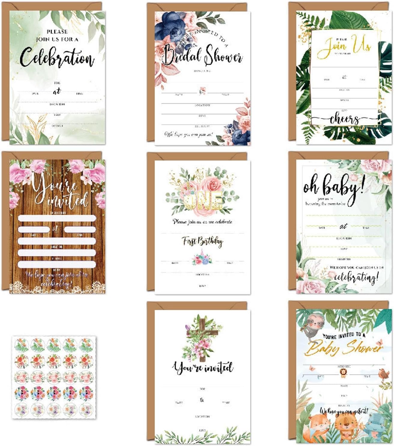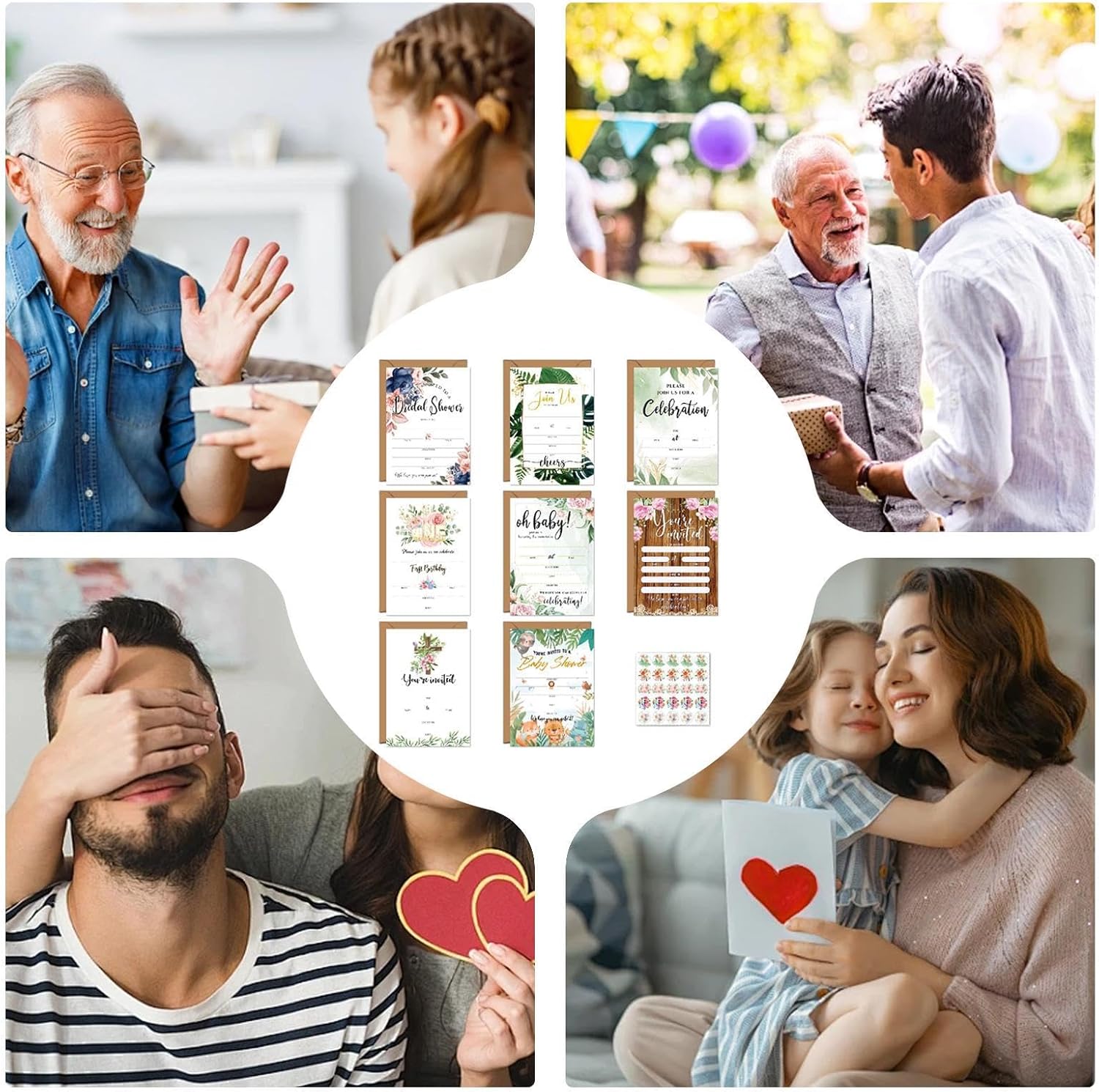 Advanced Craftsmanship: Our Invitation Card Set flaunts impeccable craftsmanship, providing a seamless experience for any event. The stunning design, adorned with intricate details, adds charm and excitement that can't be overlooked Variable Application: From weddings to anniversaries, our invitation card set can be used for multiple occasions, adding a touch of sophistication and charm to your event Strong and Dependable: Adopting advanced printing techniques and made with excellent paper, this creative invitation card set ensures lasting impressions Use Simply: Our invitation card set comes with 8 kraft envelopes with water-activated adhesive and 1 sticker, along with 8 varied invitation cards to create unique messages that inspire creativity Attractive Invitation Card: Leave a lasting impression recipients with this invitation card set's eye-catching and creative design, featuring bright colors and unique elements that are sure to attract attention and make your event even more memorable