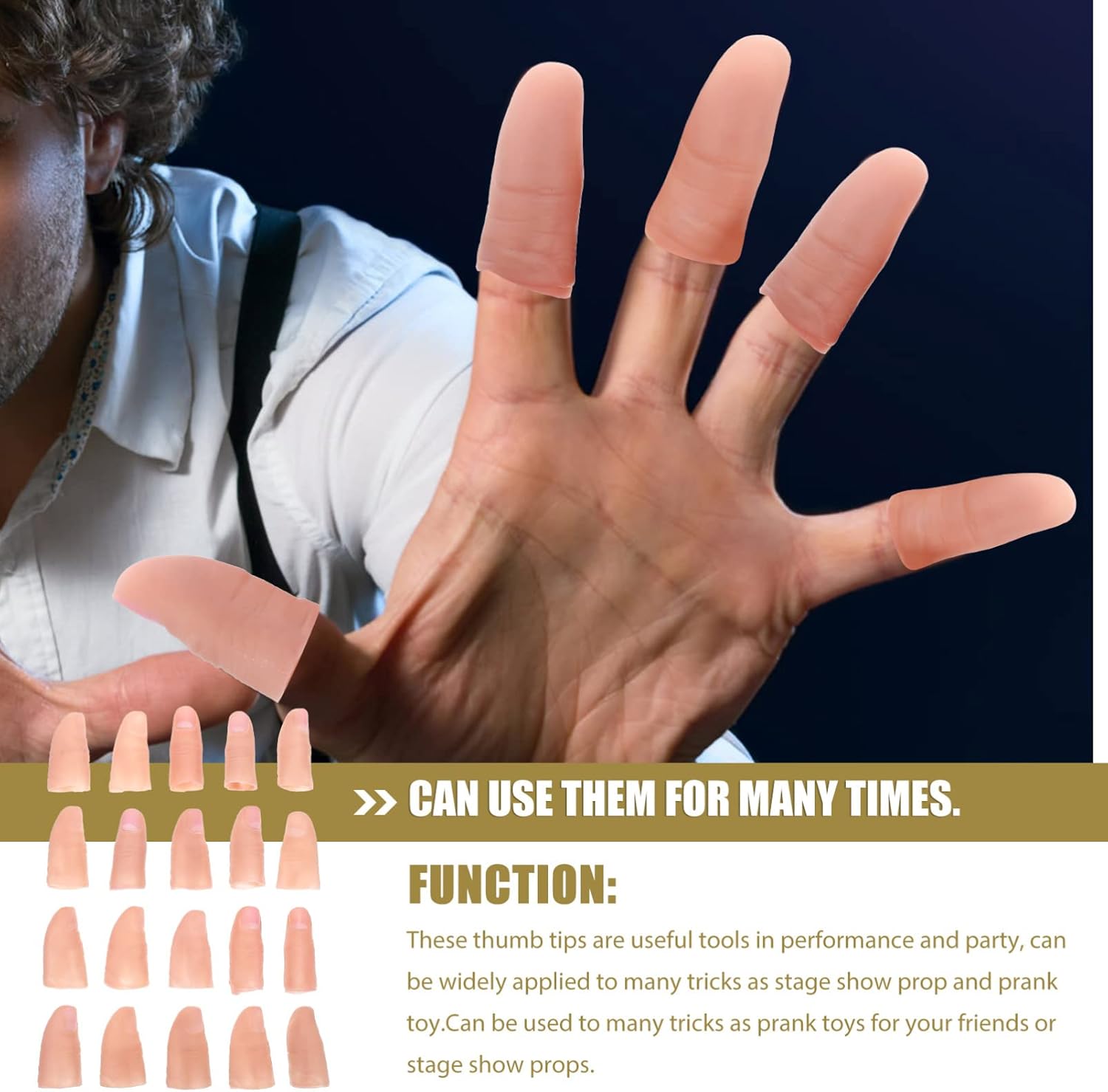 Realistic Design: Crafted with vinyl material, these fake fingers feature a lifelike appearance with realistic wrinkles and assorted colors, making them ideal for magician tricks and stage performances Versatile Usage: Perfect for conjure tricks props, these finger cot props can be used in various shows, pranks, and stage performances to create an engaging and entertaining atmosphere Compact and Lightweight: Measuring 0.98 inches and weighing only .06g, these supple finger covers are easy to carry and store, ensuring convenience for performers on the go Enhance Your Performance: These simulation finger sets are designed to seamlessly integrate into your magician tricks, allowing you to perform disappearing silk scarf acts and other creative illusions and Reusable: Made from sturdy vinyl material, these finger sleeve props are built to withstand repeated use, making them a reliable choice for and prank enthusiasts alike