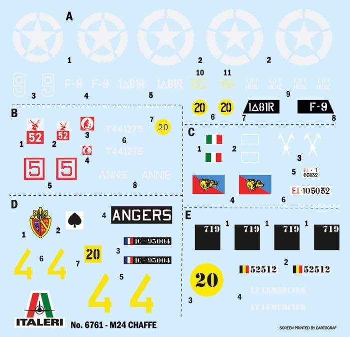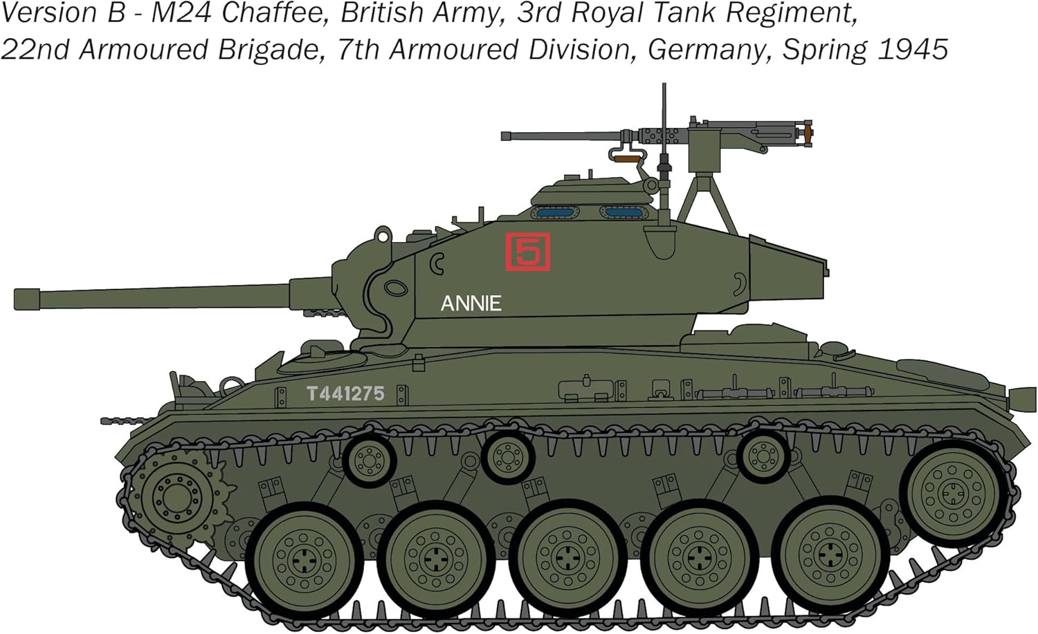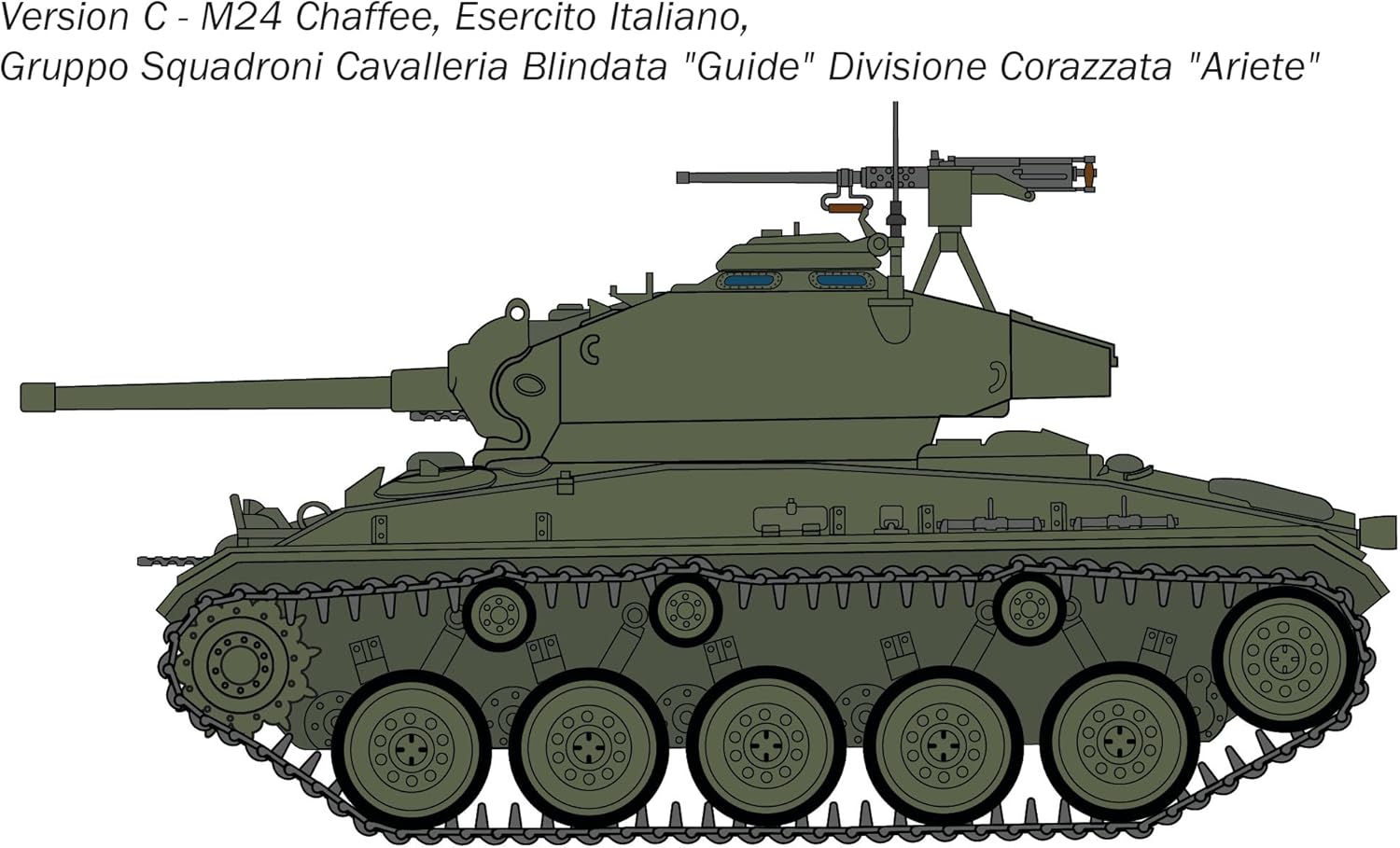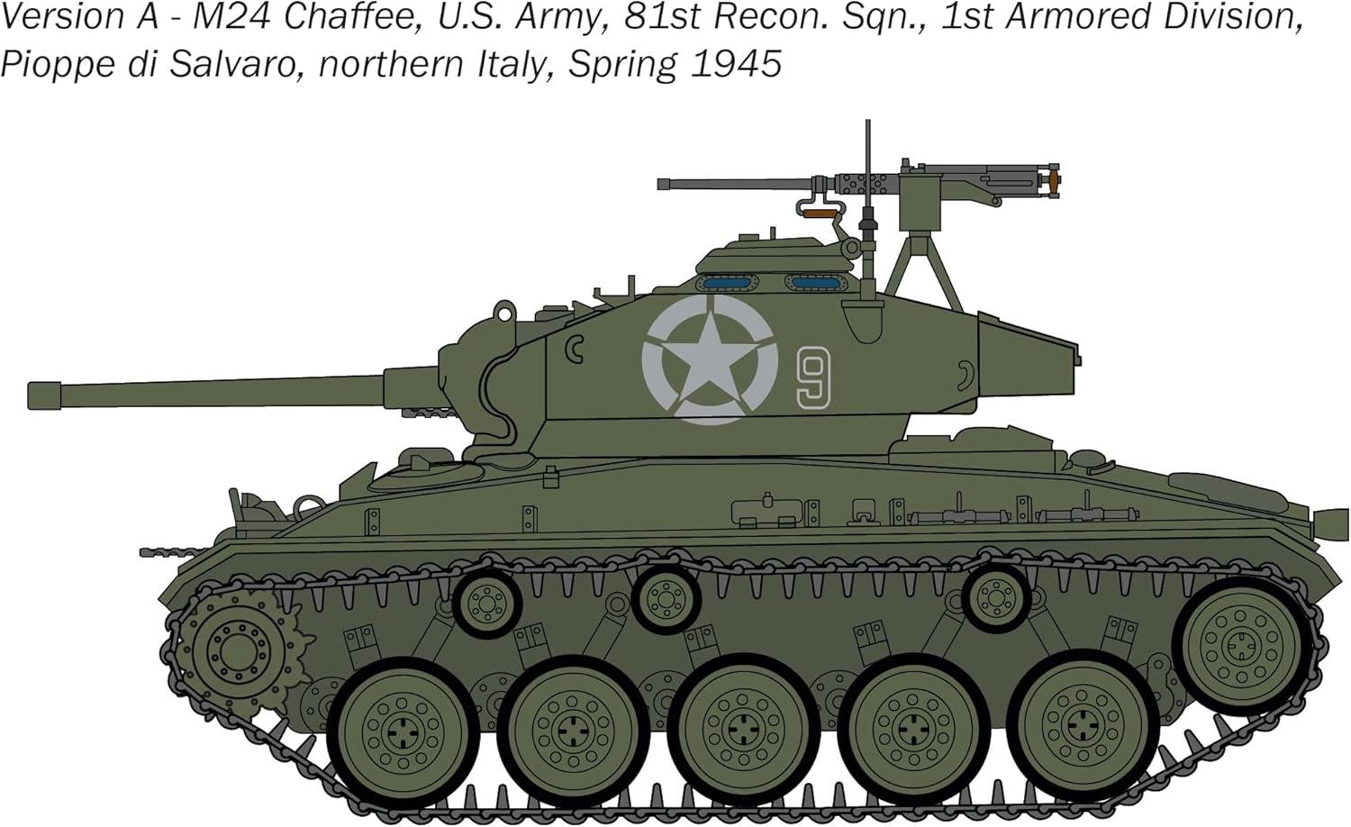 Fabbricato in Italia garanzia di qualità e precisione - Include modello da montare e pitturare, istruzioni a colori. Vernici e colla liquida per modellismo in plastica non inclusi. Include foglio decal per 5 versioni: oltre alle decal Americane, il kit include anche le decal dell’Esercito Italiano che ha utilizzato l’M-24 tra la fine degli anni ‘40 e gli anni ‘50. Include barra cannone in metallo per un maggiore livello di dettaglio. Include due tipologie di cingoli, in gomma morbida incollabile o in alternativa maglia per maglia in plastica. Istruzioni di montaggio a colori dettagliate e intuitive. Dimensione modello: 15,9 cm / Dimensione Box: 34,5 x 24 x 6 cm Skill (1 - 5) : 3