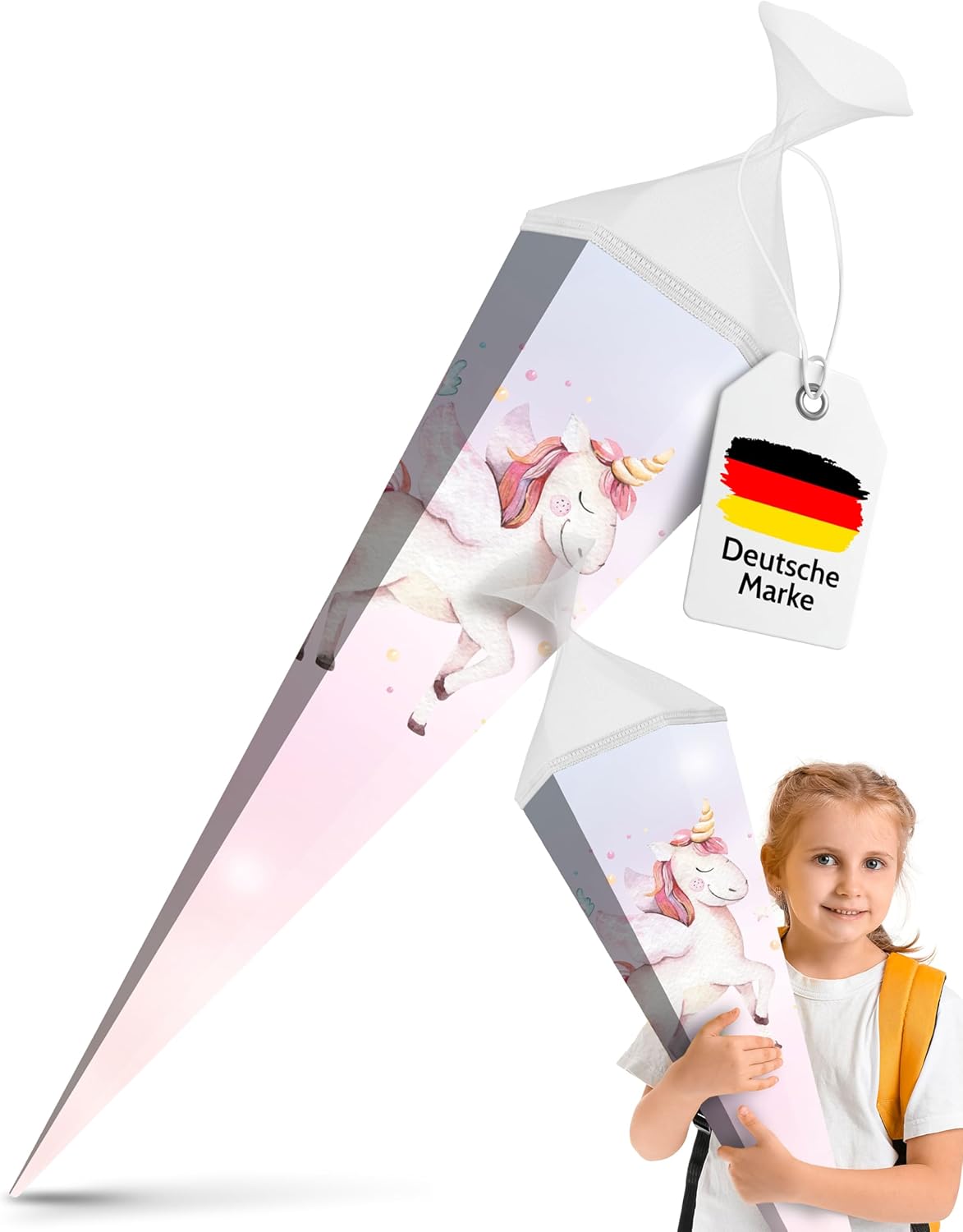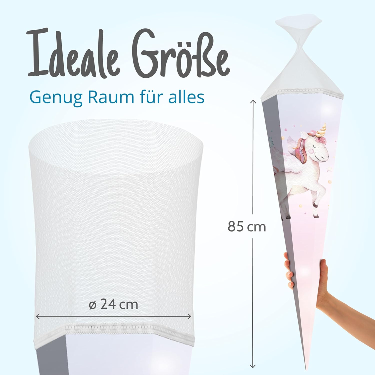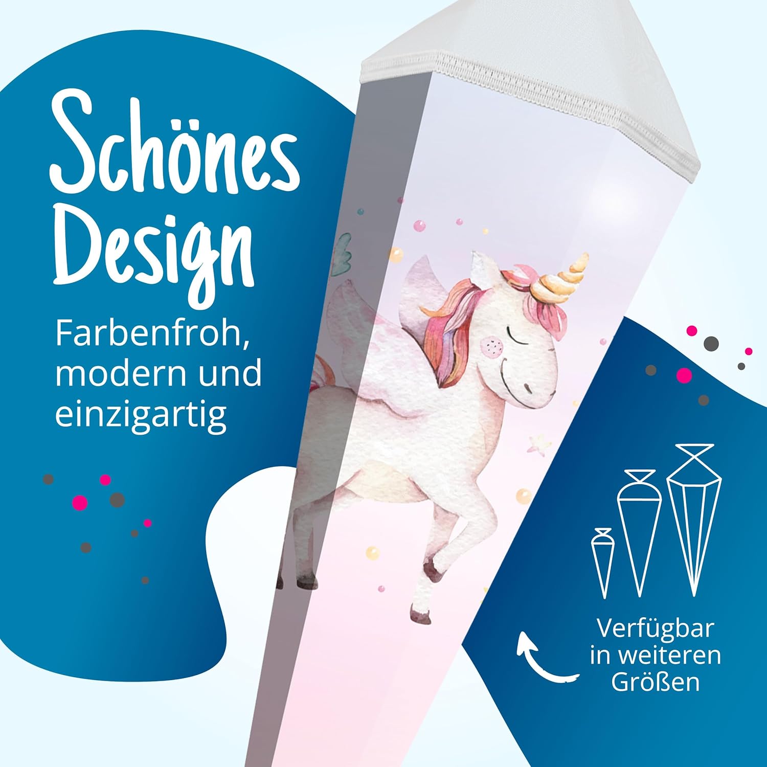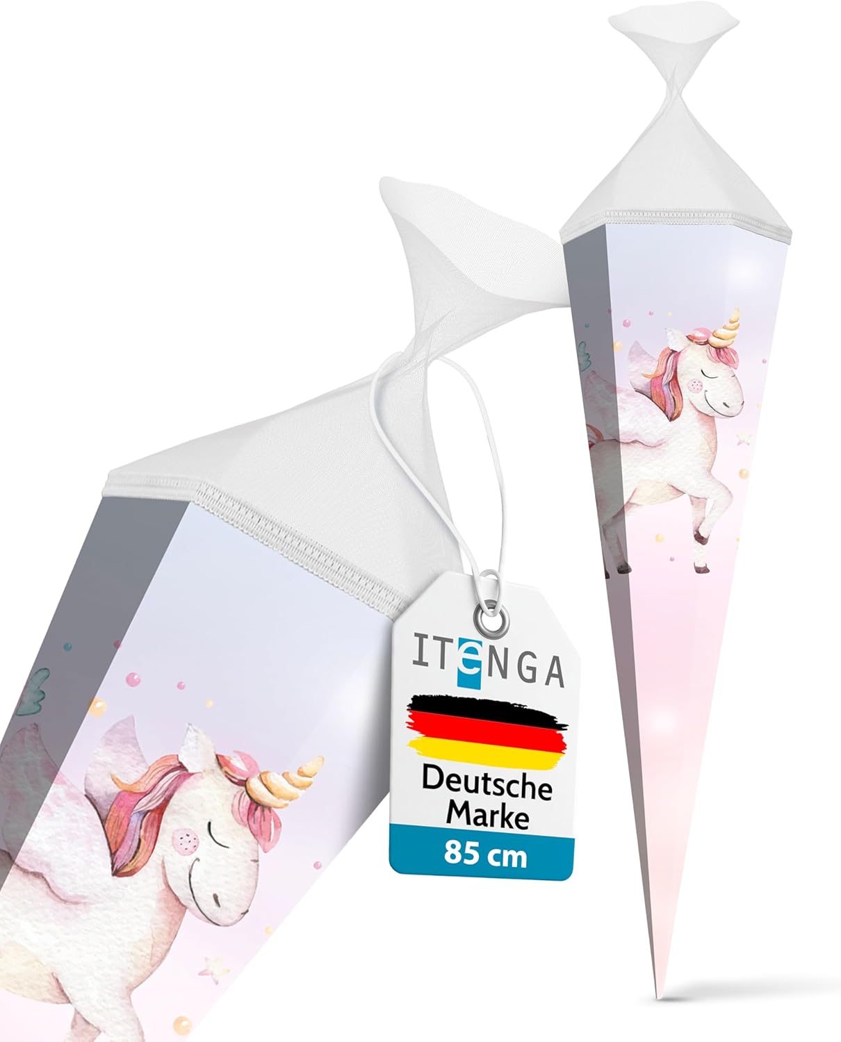 Cono scolastico rinforzato grande 85 cm esagonale con chiusura motivo unicorno design moderno adatto alle ragazze Ideale come regalo per l'inizio della scuola Spazio sufficiente per piccoli oggetti e dolcetti Fornitura: 1 cono scolastico itenga 85 cm Motivo: unicorno Materiale: cartone