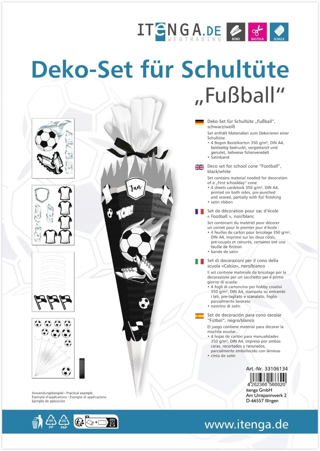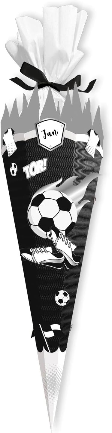 Con il set di decorazioni itenga è possibile creare qualsiasi cono per la scuola. Crea il cono della scuola nella combinazione di colori adatta alla tua squadra preferita Offriamo molte combinazioni di colori. In questo modo sono possibili tutte le combinazioni di colori dei top club tedeschi. Da nero giallo, blu bianco, rosso bianco, bianco nero, e rosso blu, tutto è possibile Nella confezione sono inclusi: 4 fogli di cartone per bricolage, stampati su entrambi i lati, pretagliati e scanalati (spessore: 350 g/m²), parzialmente glitterati o con finitura in pellicola Gli elementi pretagliati vengono forniti come bandiere e altri elementi decorativi Nastro di raso incluso Con questo set di decorazioni creerete un sacchetto di scuola personalizzato. Su un sacchetto vergine (non incluso) le fantastiche fustelle con motivo possono essere facilmente incollate. Altre parti stampate in diverse forme abbinate al tema, completano il set e garantiscono in seguito gli occhi luminosi dei bambini sul sacchetto di zucchero finito. Riceverete 4 fogli di cartoncino con uno spessore di 350 g/m². Questa è stampata su entrambi i lati, pretagliata e scanalata. Alcune parti sono glitterate o rifinite con un foglio. Inoltre è incluso un nastro di raso.