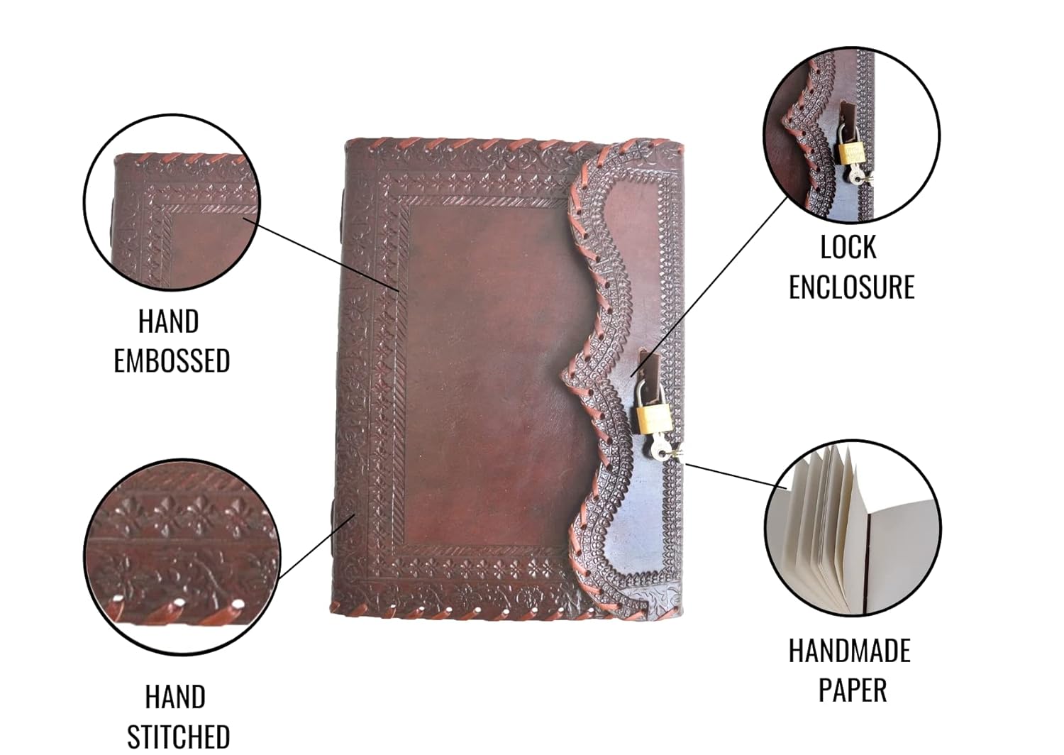 Vraiment superbe ! Cuir véritable légèrement souple, qui sent bon le vrai cuir, magnifiques reliures à la main, gravures sur la couverture idem, cadenas fourni, intérieur magnifiques belles pages écrues assez épaisses , je recommande c’est un magnifique grimoire !!