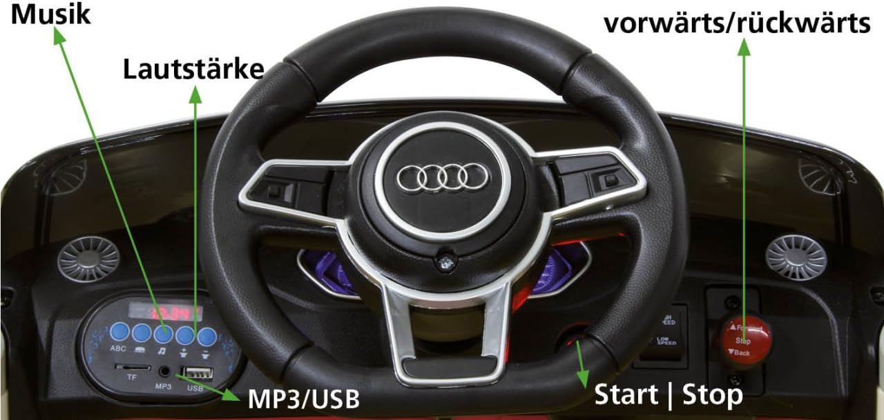 Avvio graduale, 2 velocità (lenta, veloce), ruote in gomma ultra-grip, avviamento senza chiave tramite pulsante di avvio, apertura e chiusura manuale delle porte. Porta Aux, porta USB Illuminazione, fari a LED, fanale posteriore, fanale posteriore, fanale posteriore a LED, illuminazione del cruscotto Clacson e suono del motore sul volante 2 potenti motori di azionamento e una potente batteria per lunghi tempi di guida (fino a 90 min.)