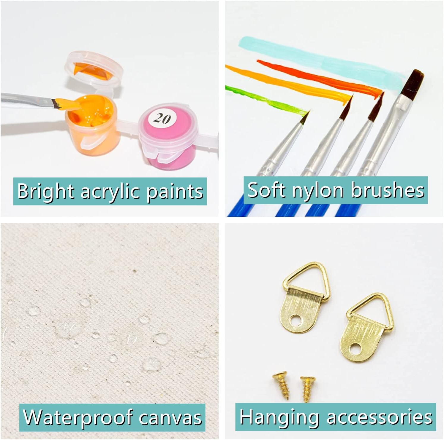 🎨【 Kit per dipingere con i numeri】: Sono inclusi tutti gli strumenti necessari, 1 tela testurizzata (senza cornice), 4 pennelli di qualità superiore, 1 set di pigmenti acrilici, 1 versione cartacea numerata per riferimento, 1 immagine del prodotto cartaceo, 2 set di viti metalliche e ganci per appendere. 🦌【Giocattoli didattici】: Con il nostro kit di pittura per numeri, puoi stare lontano dalle radiazioni dei giochi e dell'elettronica. È un buon giocattolo di apprendimento per i bambini. Un'ottima scelta per aiutare i bambini a migliorare la loro coordinazione cromatica e, una volta terminato, avranno un senso di realizzazione che è positivo per la loro intelligenza e fiducia in se stessi. ☃️【Alta qualità】: Tela spessa e resistente; Varie dimensioni di pennelli professionali, anche aree estremamente piccole possono essere dipinte facilmente; Vernici acriliche sicure sottovuoto non tossiche, colorate, ricche e piene, uno o due strati possono facilmente coprire figure e linee, impermeabili dopo l'essiccazione, possono essere conservate per lungo tempo. 🎄【Facile da dipingere】: I numeri e le linee della tela sono molto chiari, il pigmento corrispondente è accuratamente segnato dall'adesivo. Basta seguire le istruzioni, dipingere con i numeri uno per uno, Adatto a tutti i livelli adulti principianti e bambini. Per le persone con abilità pittoriche di base, è possibile mescolare la vernice da soli e completare il dipinto del proprio stile. 🎅【 Divertente e rilassante】: Dipingere con i numeri è un'attività rilassante e antistress. Il processo divertente allontana la mente dalla vita e dal lavoro, lontano dalle radiazioni dell'elettronica. Potete fare il set di pittura a olio con la vostra famiglia e i vostri figli per incoraggiare il legame genitori-figli e sviluppare le abilità pratiche e la creatività dei bambini.
