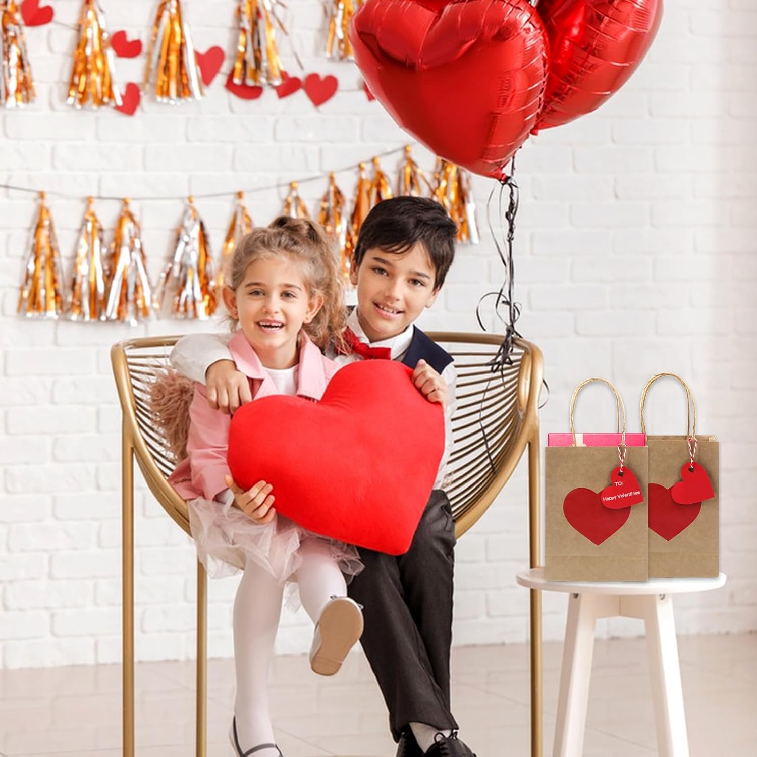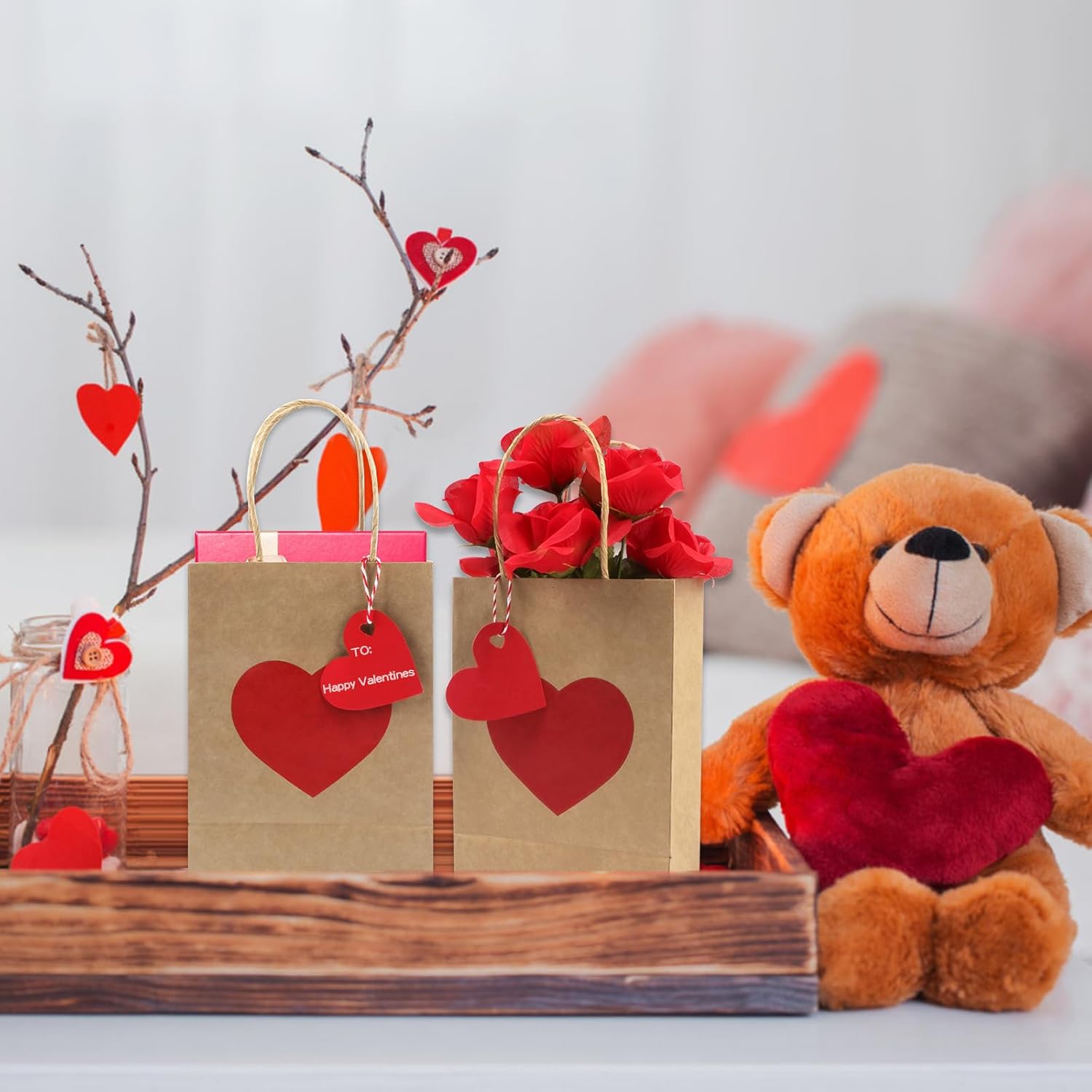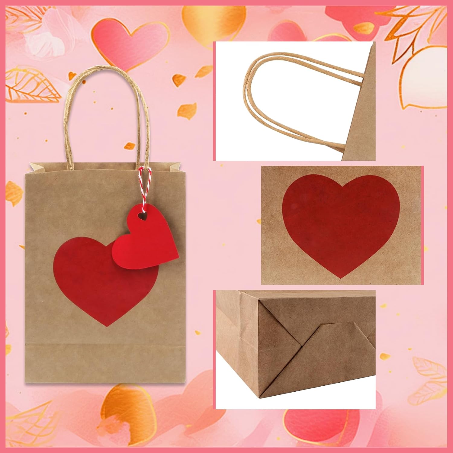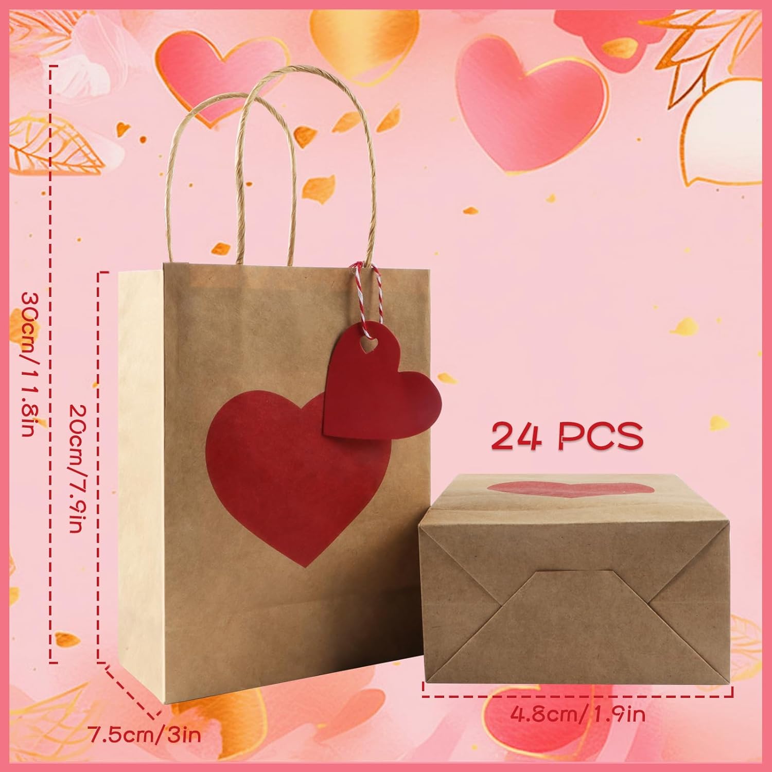 Sacchetti regalo di San Valentino: riceverai 24 sacchetti regalo di San Valentino, un rotolo di spago rosso e bianco e ogni sacchetto di carta kraft viene fornito con un'etichetta rossa a forma di cuore. Questi accessori rendono il tuo regalo più squisito e bello Design classico alla moda: questo sacchetto regalo di carta per San Valentino è dotato di un manico e il centro della borsa è stampato con un bellissimo motivo rosso a forma di cuore, che si abbina perfettamente alla classica carta kraft marrone. Dimensioni perfette: la lunghezza di ogni sacchetto di carta per San Valentino è di circa 15 cm, la larghezza è di 7,5 cm e l'altezza è di circa 20 cm (esclusi i manici). La dimensione dell'etichetta è di 5 cm e la lunghezza della corda è di 2,4 metri. Materiale di alta qualità: il sacchetto di carta di San Valentino è realizzato in carta kraft spessa di alta qualità, robusta e durevole, con stampa trasparente. Ogni sacchetto di carta ha due robuste maniglie che possono essere riutilizzate. Occasioni applicabili: i sacchetti di carta kraft di San Valentino possono essere utilizzati per feste di San Valentino, festa della mamma, matrimoni, addio al nubilato, feste di fidanzamento, feste di compleanno, anniversari. Questo sacchetto di carta kraft con amore a forma di cuore può contenere perfettamente gioielli, profumi, portafogli, cinture, ecc