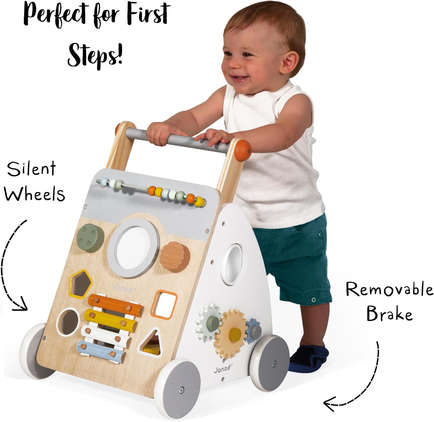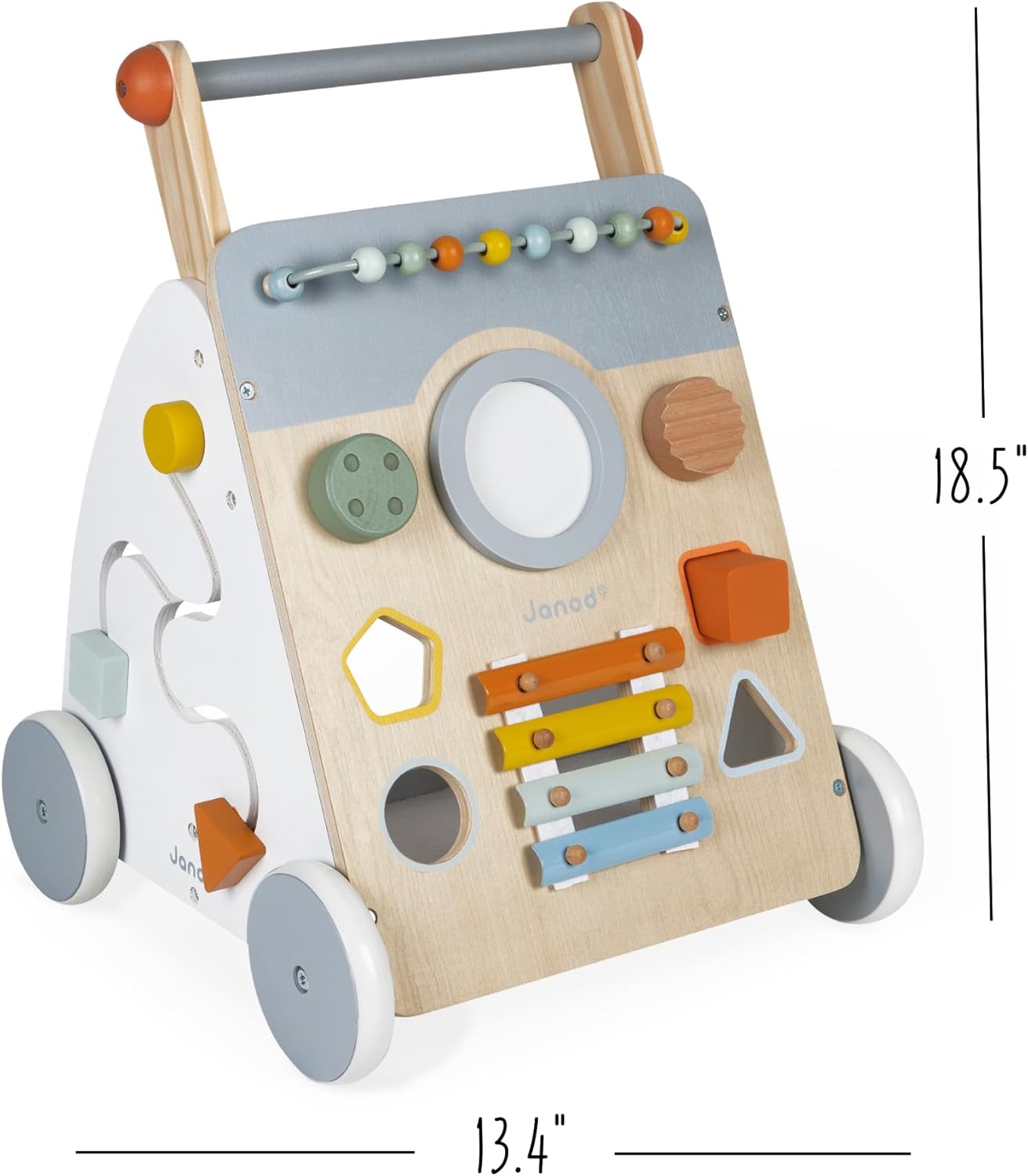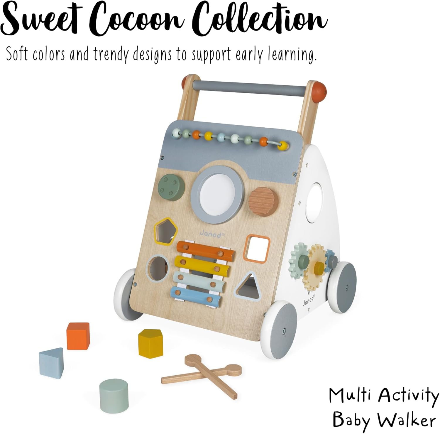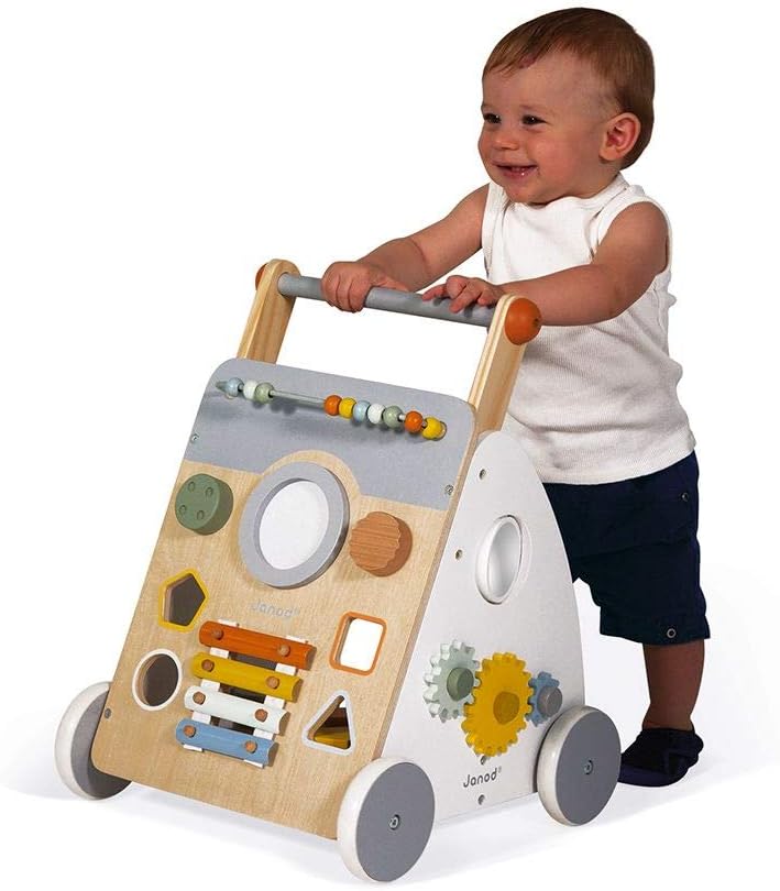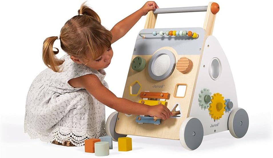 IL CARRELLO EVOLUTIVO CHE ACCOMPAGNA L’APPRENDIMENTO: questo splendido carrello è studiato appositamente per i bambini che imparano a camminare, a partire da 12 mesi. È munito di un freno, invisibile e rimuovibile, che permette di bloccare le ruote e liberarle progressivamente: in questo modo è possibile controllare la velocità del carrello per bambini in legno in tutte le fasi dell’apprendimento. UN GIOCATTOLO IN LEGNO COMPLETO DI 9 ATTIVITÀ: il carrello Janod multiattività è un giocattolo completo che offre al tuo bambino 9 attività per aiutarlo a sviluppare la motricità fine, nonché il senso musicale, divertendosi: pallottoliere, tamburo, “gratta-gratta”, pulsante sonoro girevole, scatola delle forme, xilofono in metallo, ingranaggi, specchietto ingranditore girevole, labirinto. CARATTERISTICHE: il carrello primi passi è stato progettato per garantire la sicurezza dei bambini e la serenità dei genitori! È dotato di ruote silenziose e di un tappeto di feltro per ridurre il rumore e ammortizzare la caduta dei cubi. Il carrello è realizzato in legno (compensato e legno massello MDF), feltro e metallo. Colori dipinti ad acqua. Misure: 34,5 x 37 x 47,5 cm. COLLEZIONE SWEET COCOON: la nostra collezione Sweet Cocoon è una gamma per la prima infanzia in delicate tonalità pastello, ispirate alle tendenze attuali, per accompagnare dolcemente i primi passi dell’apprendimento! DESIGN FRANCESE: i giocattoli Janod sono pensati in Francia, nel Giura, prestando particolare attenzione ai materiali impiegati, allo stile e ai colori. Giochi e giocattoli originali, audaci, educativi e studiati con cura per accompagnare i bambini nella loro crescita e nello sviluppo cognitivo, psicomotorio e socio-emotivo.