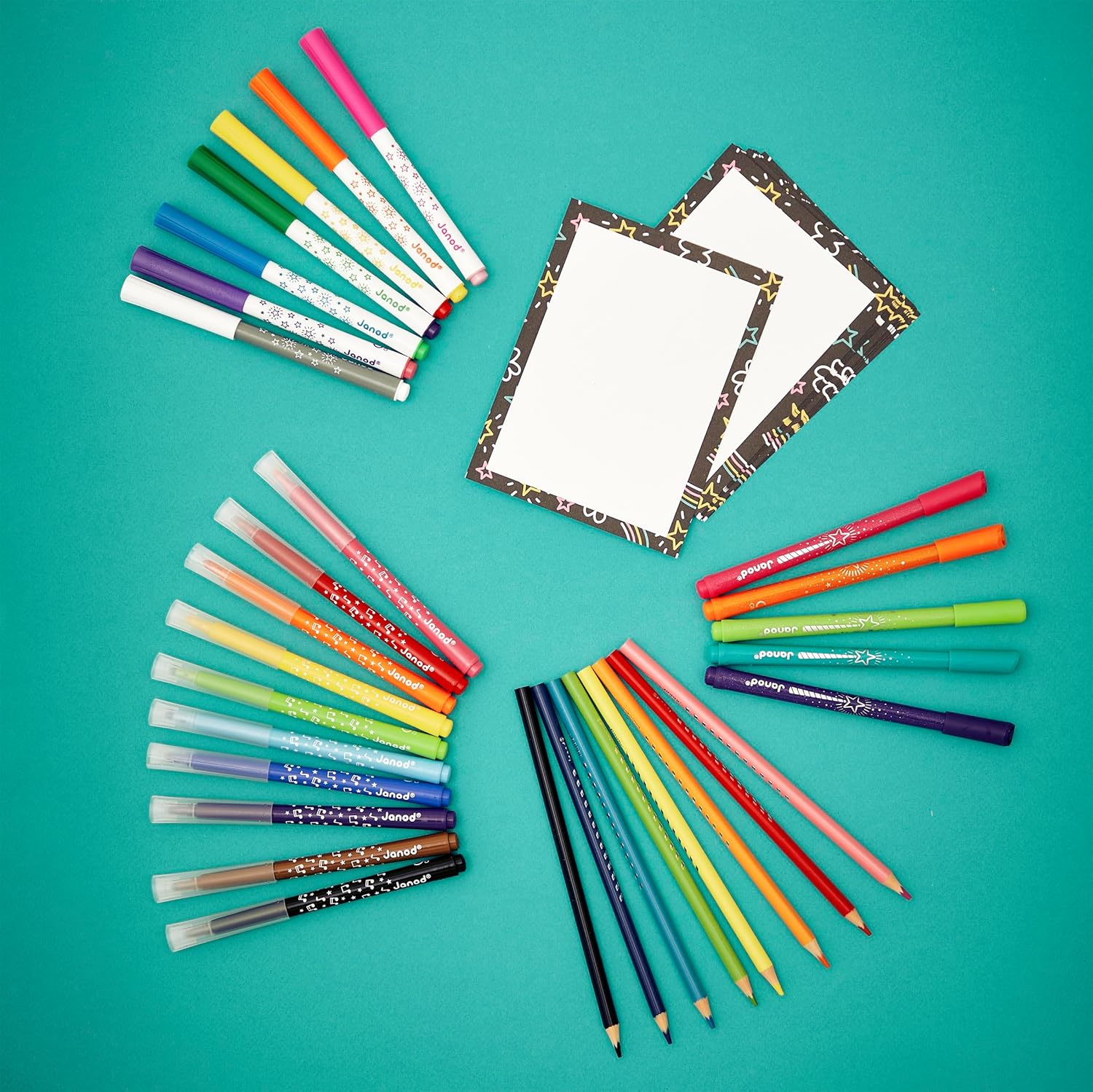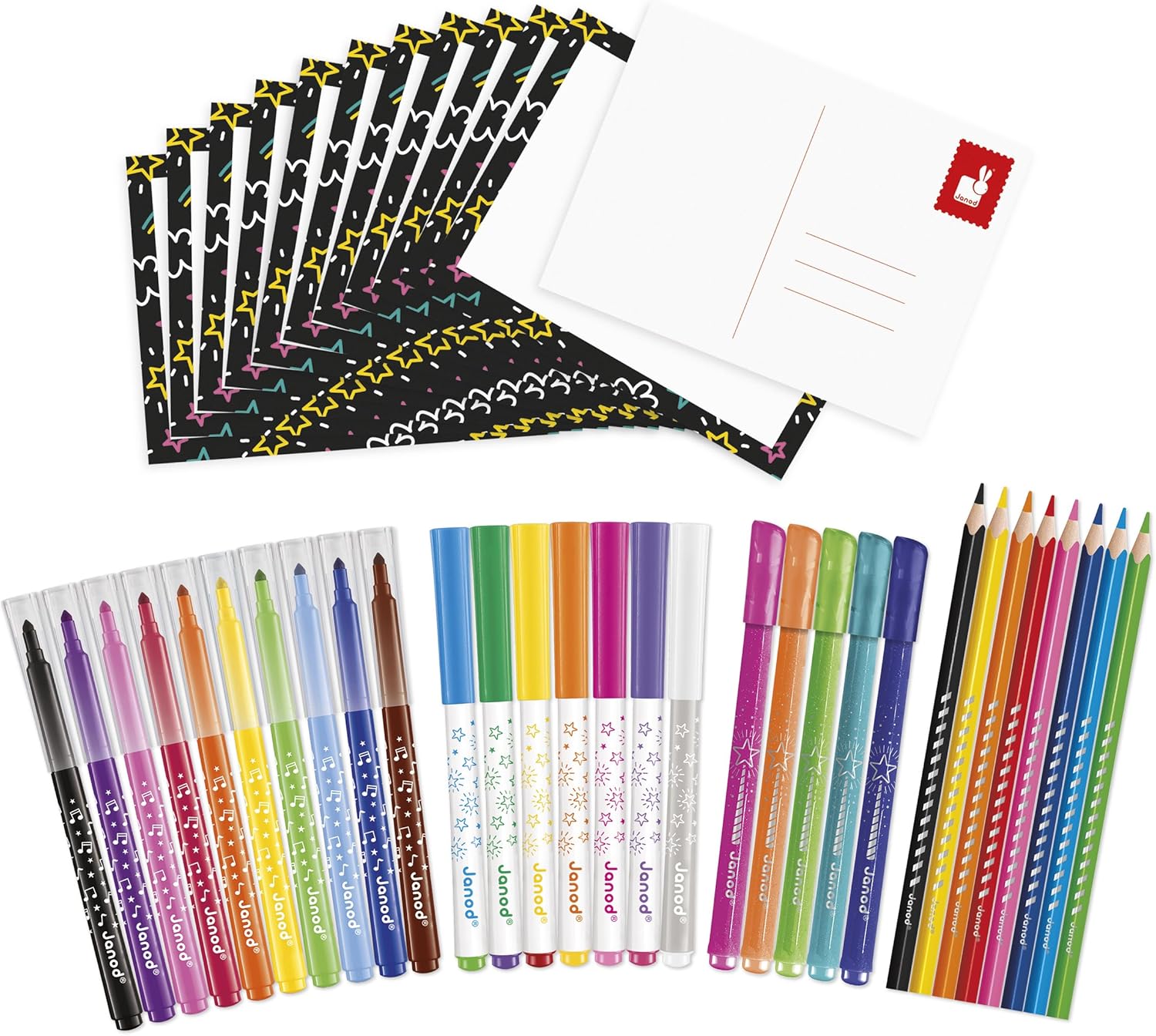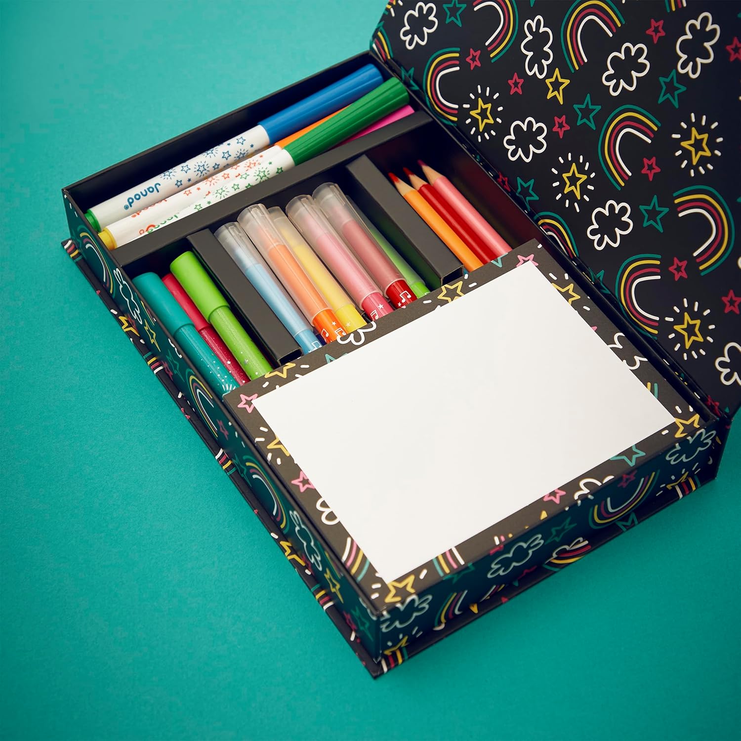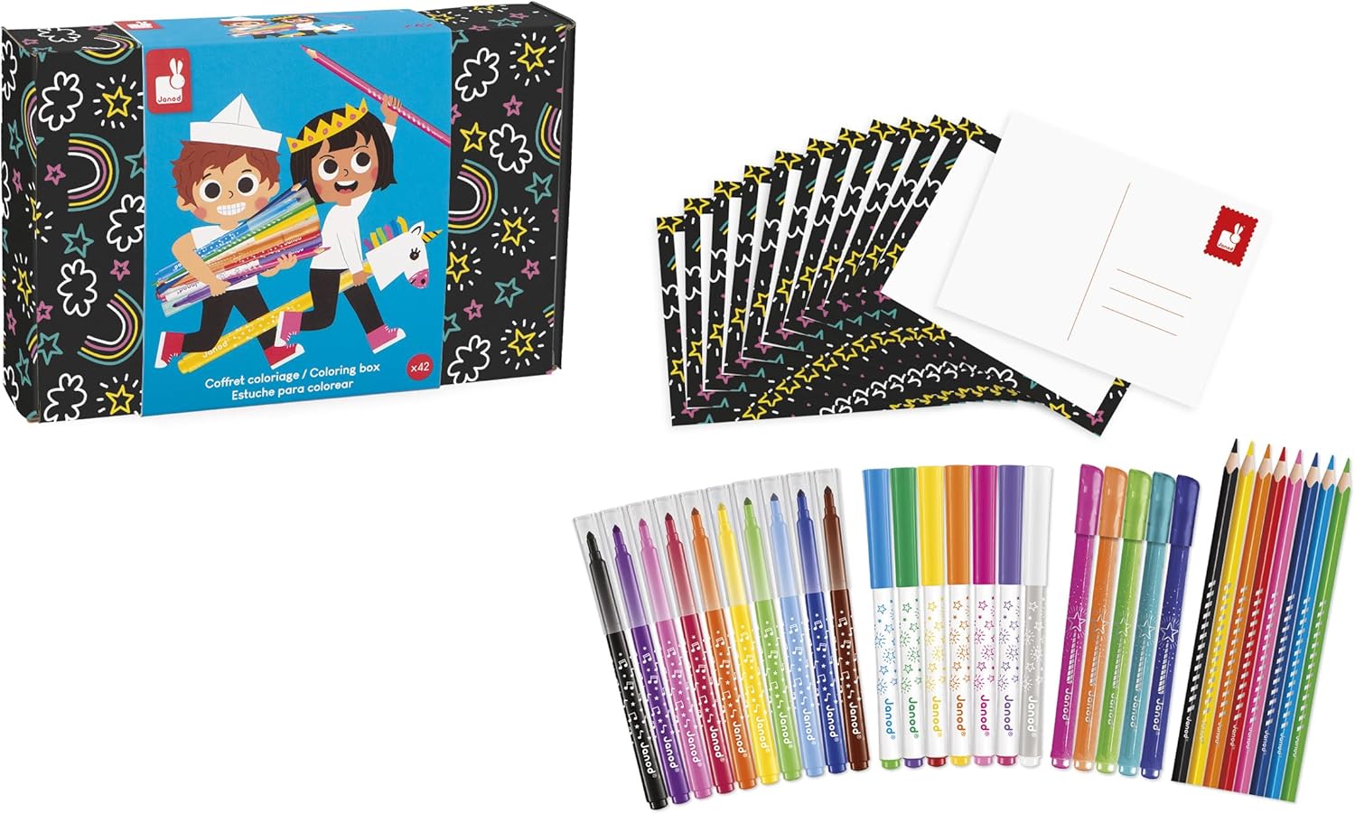 42 ACCESSORI INCLUSI: pronti per un turbinio di creatività? Questo cofanetto contiene 42 accessori per ore di divertimento: 10 pennarelli a lunga durata, 5 pennarelli glitterati per brillare, 7 pennarelli magici che cambiano colore e 12 cartoline da personalizzare! Progettato e adatto per la scuola materna, elementare e media. IL REGALO IDEALE PER I PICCOLI ARTISTI! Questo cofanetto trabocca di creatività con i suoi pennarelli, matite e cartoline da personalizzare. Perfetto per avvicinare gli artisti in erba a partire dai 3 anni e stimolare la loro voglia di creare, disegnare e sognare per ore! CONFEZIONE RIUTILIZZABILE: una confezione creativa che dura per sempre! Grazie alla scatola riutilizzabile, tutto rimane ben ordinato dopo ogni sessione di colorazione. I bambini danno libero sfogo alla loro immaginazione mentre sviluppano le loro capacità motorie. Pronti a colorare senza fine! CARATTERISTICHE: Contiene 10 pennarelli a lunga durata, 7 pennarelli magici, 5 pennarelli glitterati, 8 matite colorate, 12 cartoline da colorare. Dimensioni della confezione: L 123,4 x l 3,2 x H 15,2 cm. Dai 3 anni in su. COLORARE CON JANOD: Regalate ai vostri piccoli artisti momenti creativi pieni di colori con prodotti di qualità accessibili fin dalla più tenera età. Confezioni allegre e colorate che stimolano l'immaginazione e aggiungono un tocco di allegria alle vacanze e alle attività manuali!