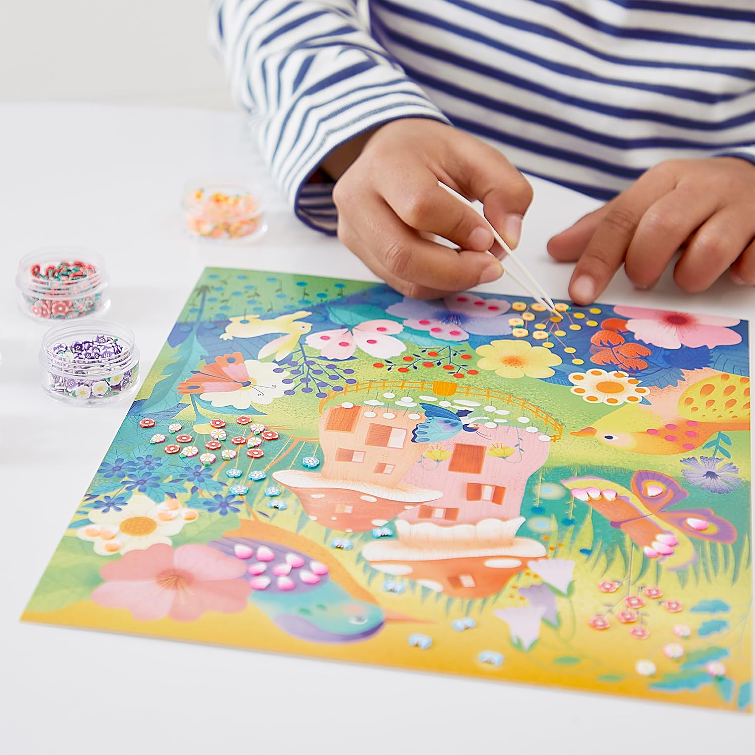 MINI BASTONCINI IN POLIMERO: Questo set creativo consente di creare 3 quadri con mini bastoncini (fette di pasta polimerica stampata) sul tema del giardino segreto! KIT CREATIVO INCANTATO: Con questo cofanetto creativo, i bambini possono dare vita a 5 quadri decorandoli con mini bastoncini. Queste delicate fettine di pasta polimerica a forma di fiori o farfalle aggiungono un tocco di magia ad ogni quadro! LA GIOIA DI CREARE: Vostro figlio può seguire le istruzioni del libretto esplicativo o lasciare libero sfogo alla sua creatività. Le realizzazioni in rilievo saranno di grande effetto; vostro figlio potrà presentarle con orgoglio o utilizzarle come decorazione. CARATTERISTICHE: Questo gioco Janod contiene 5 quadri, 870 mini-canes in pasta polimerica, 1 pinza e 1 libretto di istruzioni con i modelli. Tempo totale di gioco stimato a 2 ore e 30 minuti. Attività manuale per bambini dai 7 ai 12 anni. LES ATELIERS DU CALME: Questo kit creativo fa parte di una collezione sviluppata in collaborazione con le edizioni Hachette, rinomate per la loro competenza nel settore del tempo libero creativo per bambini e capaci di adattarsi alle esigenze e alle aspettative di ogni età.