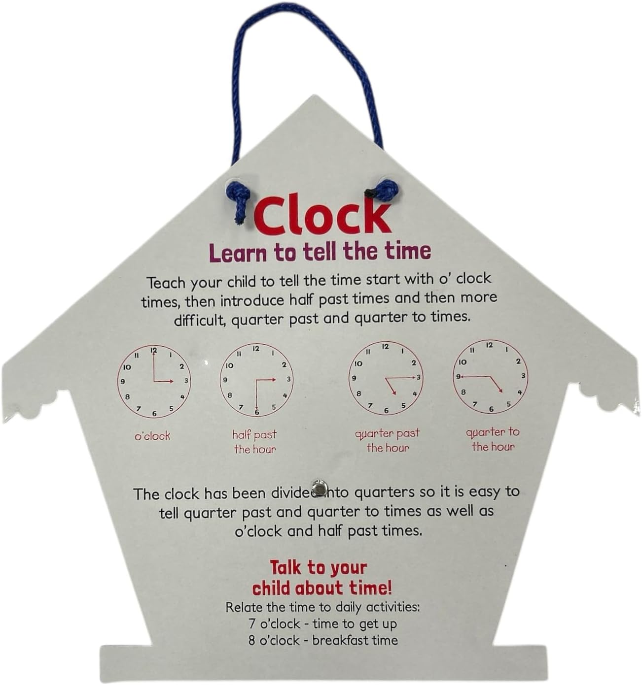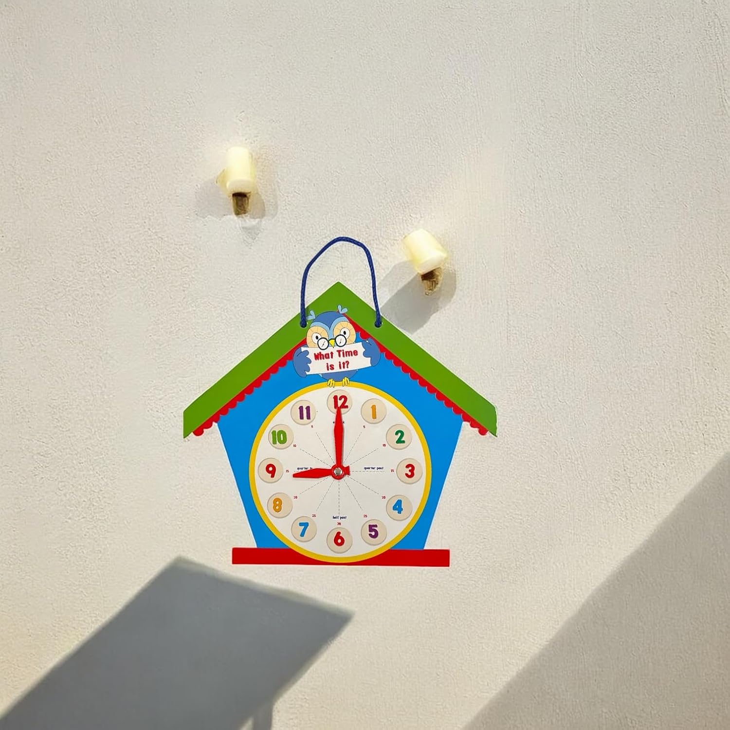 Questo divertente orologio con gufo è un ottimo modo per introdurre l'ora ai tuoi piccoli, con un design luminoso e lancette mobili. Il diametro del quadrante è di 17,5 cm. Viene fornito con un cordino per appenderlo in modo che possa essere facilmente visualizzato in una stanza dei giochi, nella camera dei bambini o in classe. Il quadrante dell'orologio è contrassegnato da intervalli di 5 minuti che rendono più facile per il bambino imparare. Mostra anche un quarto passato, un quarto a, mezzo passato e ora.