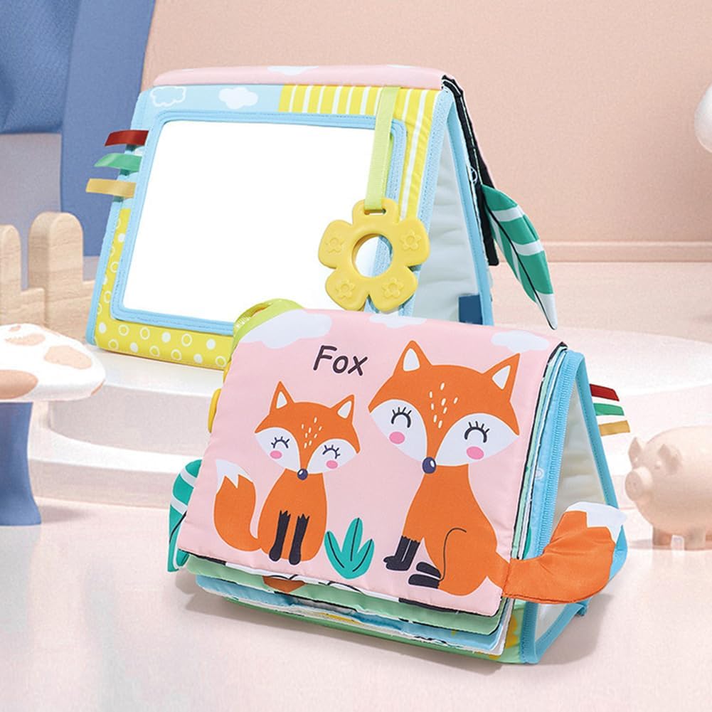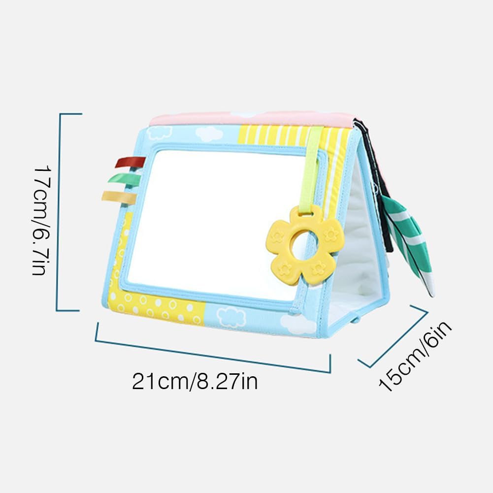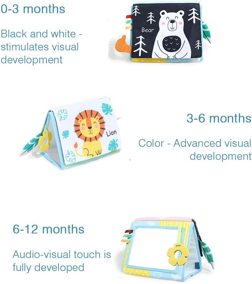 2-in-1 specchio da pavimento & baby book: Tummy Time Specchio giocattolo includono uno specchio sicuro per bambini con un libro Crinkle. Gli specchietti morbidi di sicurezza del bambino non danneggiano gli occhi del bambino, possono promuovere lo sviluppo visivo del bambino e sostenere l'auto-scoperta del bambino. Giocattoli per bambini a contrasto 0-6 mesi: i giocattoli Montessori sono progettati con colori contrastanti e motivi a cartoni animati, che possono facilmente attirare l'attenzione dei neonati e allenare la loro pancia. Il colore bianco e nero fornisce stimolazione sensoriale per i neonati, che supporta lo sviluppo precoce della vista del bambino di 0-6 mesi. Morbido e resistente agli strappi: il libro morbido per bambini è realizzato in materiale di poliestere di alta qualità, sicuro e non tossico, durevole e indeformabile, facile da tenere le mani dei bambini. È uno dei giocattoli necessari per bambini 0-12 mesi per esterni, in viaggio e a casa LIBRO DEL TEMPO DELLA CASA: questo diario del ventre è in posizione verticale per incoraggiare il gioco nel periodo addominale. Adatto per l'uso in fase addominale o in posizione seduta. Miglior regalo giocattolo per bambini da 0 a 6 mesi: per bambini di età compresa tra 0 e 6 mesi, questo libro di attività piegato con un set di specchietti di sicurezza per bambini è un regalo ideale per la pancia o per sedersi e giocare. Ogni pagina del libro per bambini ha un inserto di carta che emette un suono "frusciante" quando lo toccati, il che rende più divertente ed è il regalo perfetto per i neonati