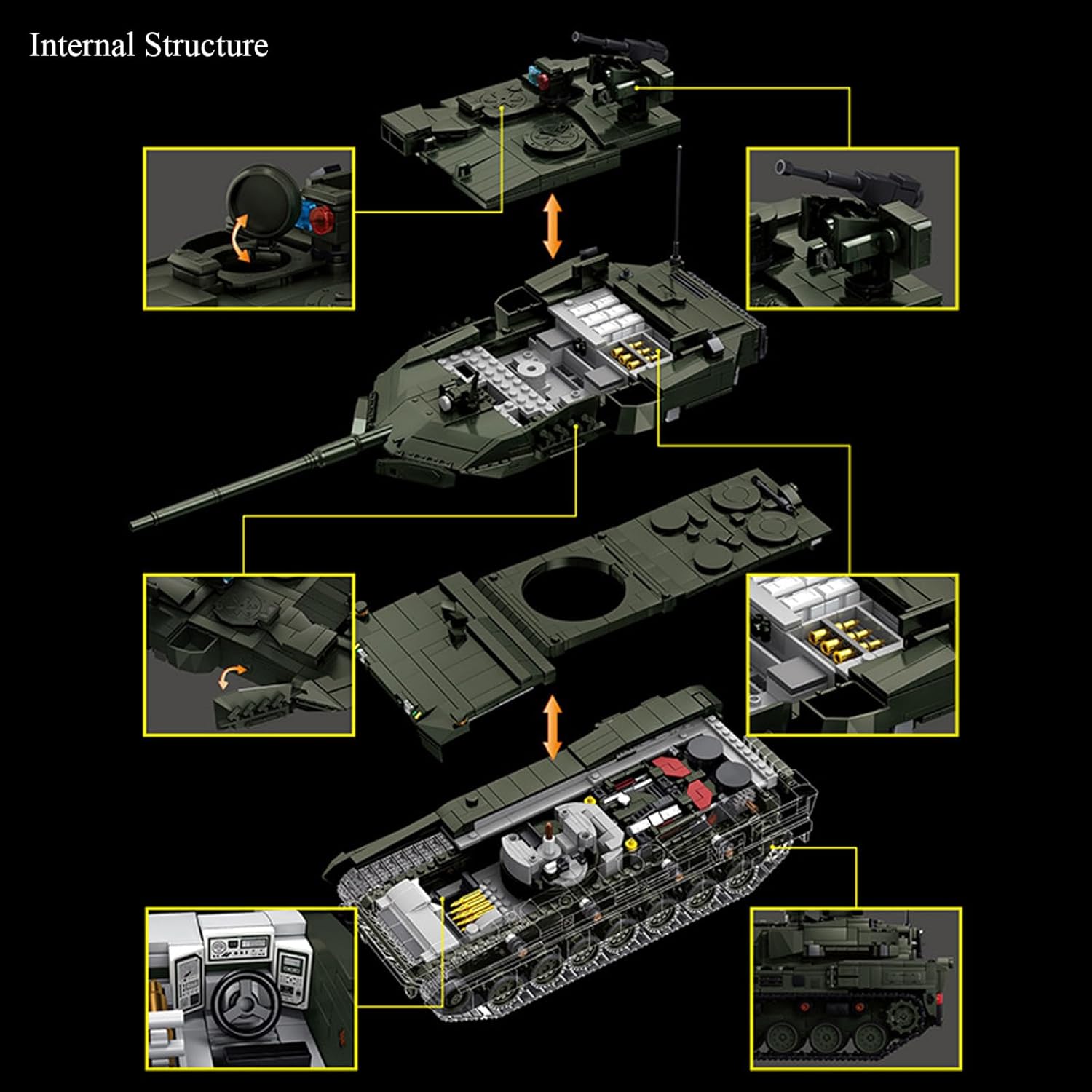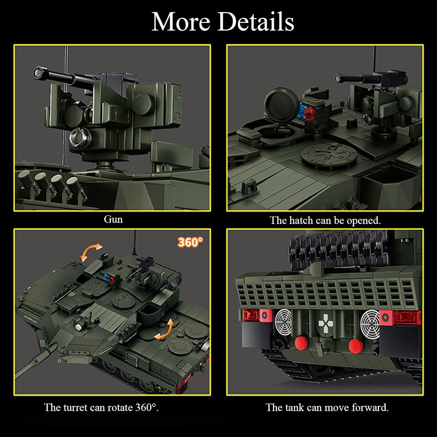 Ha caratteristiche che non puoi nemmeno immaginare. Ad esempio, la torretta può essere ruotata di 360°, il carro armato può spostarsi avanti e indietro, il portello può essere aperto, ecc. Ogni dettaglio può essere visto chiaramente, che si tratti dei cingoli, del motore, della canna del fucile, delle armi, dei soldati, ecc. - questo carro armato ti stupirà. La dimensione complessiva è di circa 42 x 17,5 x 15 cm (lunghezza x larghezza x altezza) Questo serbatoio contiene elementi costitutivi di parti del serbatoio, un totale di 2306 pezzi, uno dettagliato Istruzioni cartacee e una confezione Vieni a ottenere set di elementi costitutivi più divertenti nel mio negozio