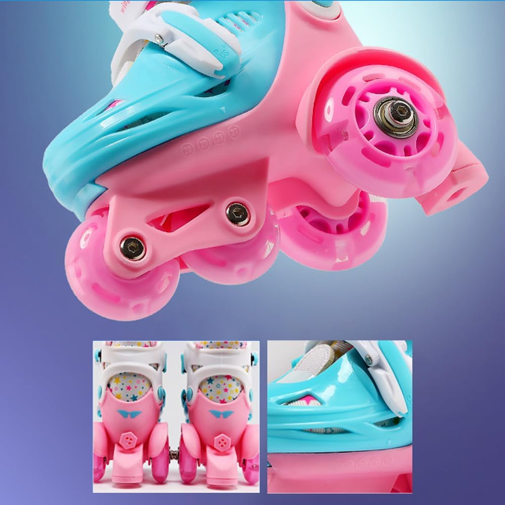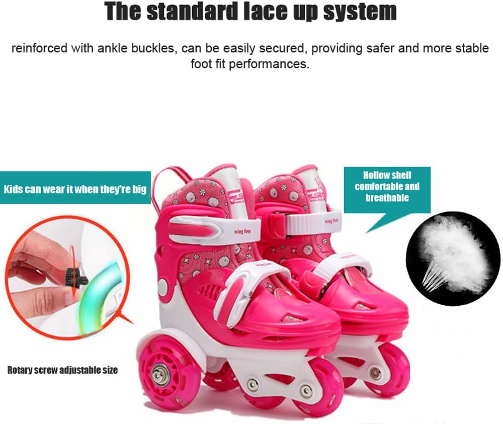 Il rivestimento interno può essere smontato e lavato. Il corpo dei pattini è contrassegnato con quattro misure di scarpe per consentire una facile regolazione alla misura di scarpa desiderata. Design del freno basso a doppio piede, più sicuro. Rendi difficile ai bambini cadere e ferirsi durante l'apprendimento. L'operazione è semplice e conveniente. Rinforzo della parte ispessita, lavorazione di alta qualità e modellatura integrata. Elevata resistenza, resistenza alla corrosione, forte resistenza alla trazione, resistente all'usura e robusto. La punta della scarpa è ispessita per evitare calci e garantire sicurezza alle dita dei piedi dei bambini.