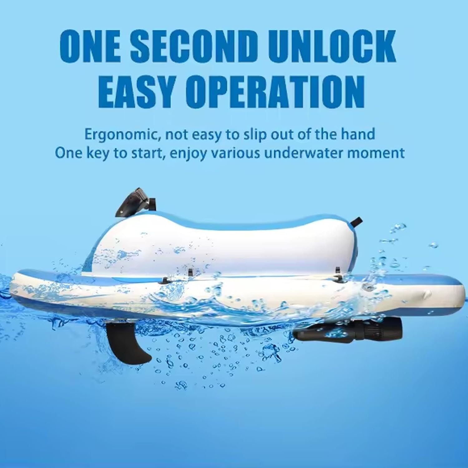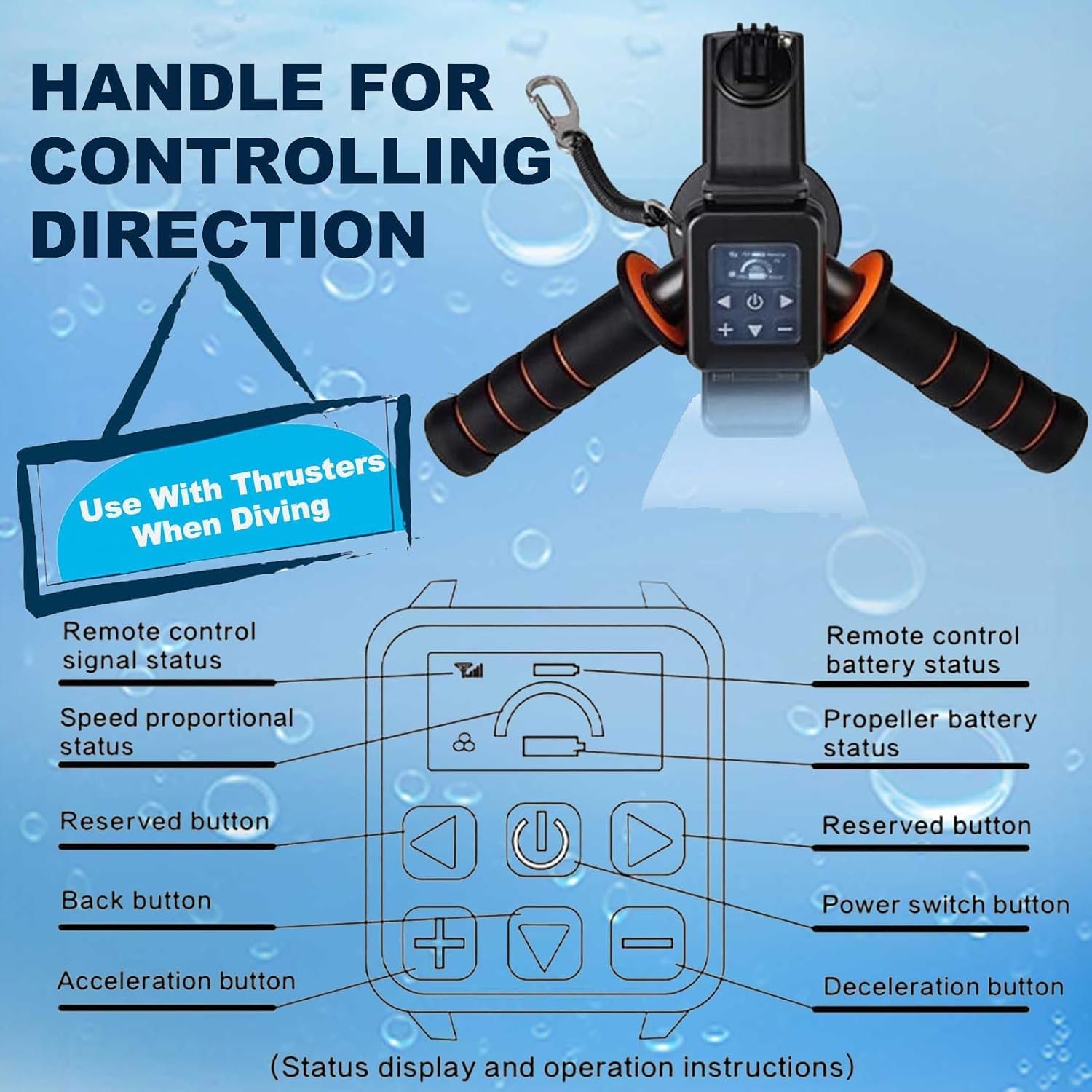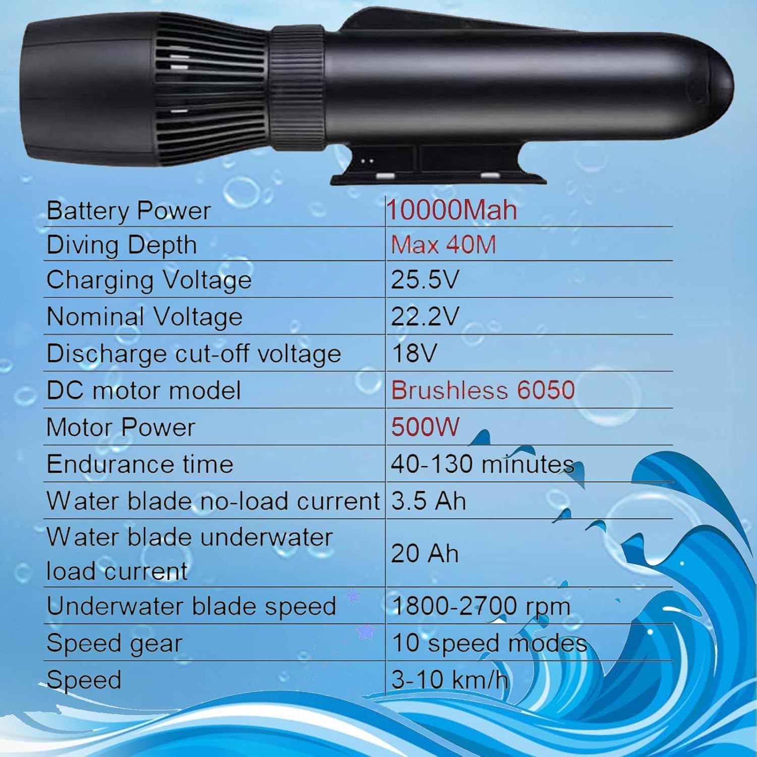 【COMANDO A DISTANZA CON FACILITÀ】 Guida senza sforzo il tuo gommone o scooter utilizzando il telecomando portatile! Regola istantaneamente 3 marce e passa da avanti a indietro da seduto: perfetto per i bambini che imparano la sicurezza in acqua o per gli adulti che gestiscono lunghe sessioni di snorkeling. 【CONQUISTA LE CORRENTI CON UNA POTENZA DI 500 W】Sperimenta velocità emozionanti e stabili (3-10 km/h) grazie a un motore brushless professionale da 500 W e pale fluidodinamiche. Spinta ineguagliabile per l'assistenza con il paddle board, il traino del kayak o rapide manovre di immersione: ideale per principianti e professionisti. 【GIOCA PIÙ A LUNGO】Autonomia fino a 2 ore: Massimizza le avventure acquatiche con 40-130 minuti di divertimento continuo! La batteria ad alta capacità da 10000 mAh supporta lunghe escursioni di snorkeling, giochi in piscina per famiglie ed esplorazioni costiere senza interruzioni. 【COSTRUZIONE RESISTENTE ALL'ACQUA SALATA】Esplora oceani e piscine senza timore! Materiale spazzolato ad alta resistenza migliorato, resistente agli strappi e alle forature, ingegneria a prova di rottura! Guscio stampato a iniezione resistente a urti, cadute e corrosione dell'acqua di mare: essenziale per i nuotatori abituali in mare e sufficientemente resistente per i bambini che lo maneggiano in modo aggressivo, così puoi nuotare a tuo piacimento senza preoccuparti della sua longevità. 【MANIGLIA REGOLABILE A 360° PER UN CONTROLLO TOTALE】Personalizza all'istante la tua presa! La maniglia dello scooter subacqueo a sgancio rapido ruota di 360° per un perfetto posizionamento ergonomico in qualsiasi immersione. Gli adulti trainano facilmente l'attrezzatura, mentre i bambini mantengono una presa sicura durante le lezioni di nuoto.