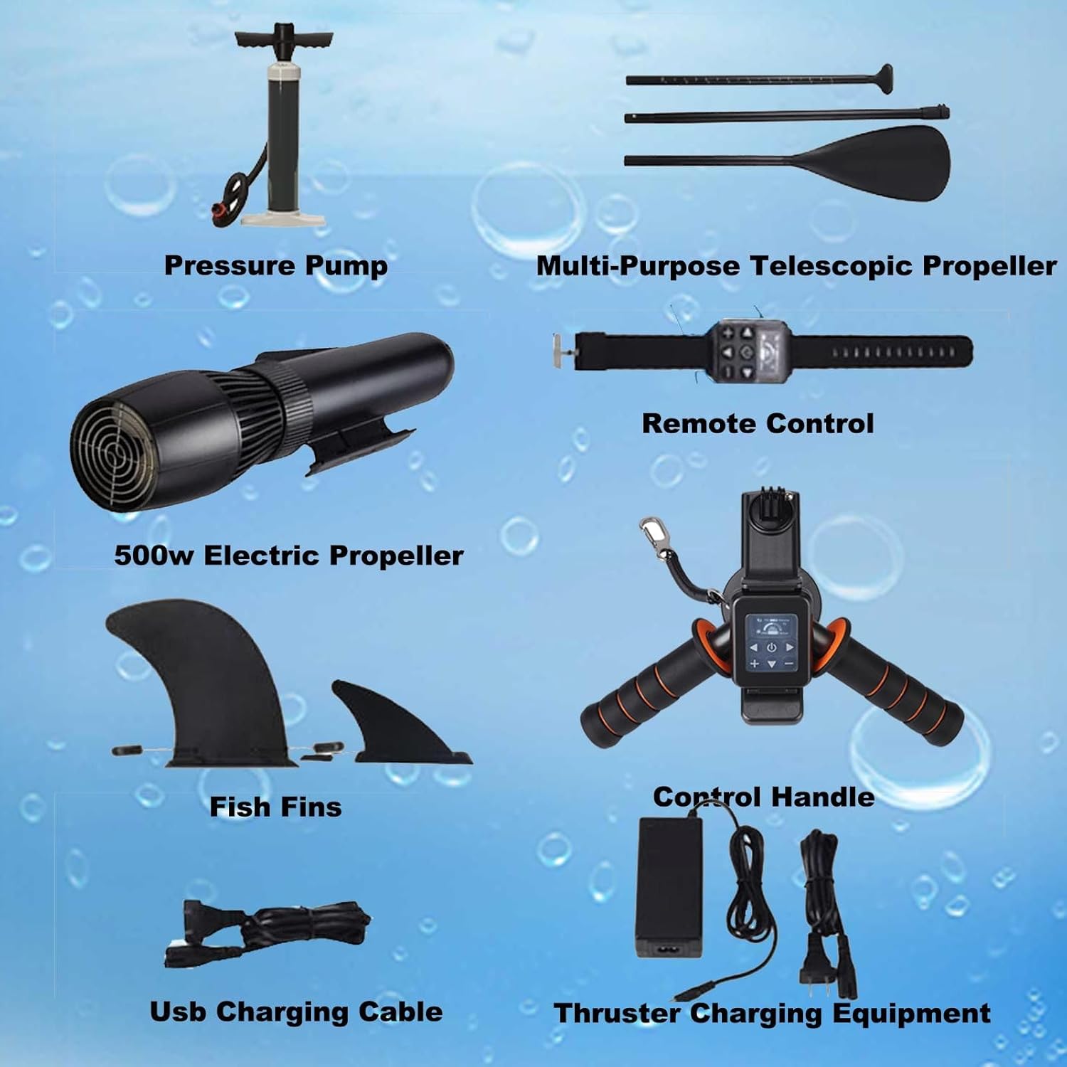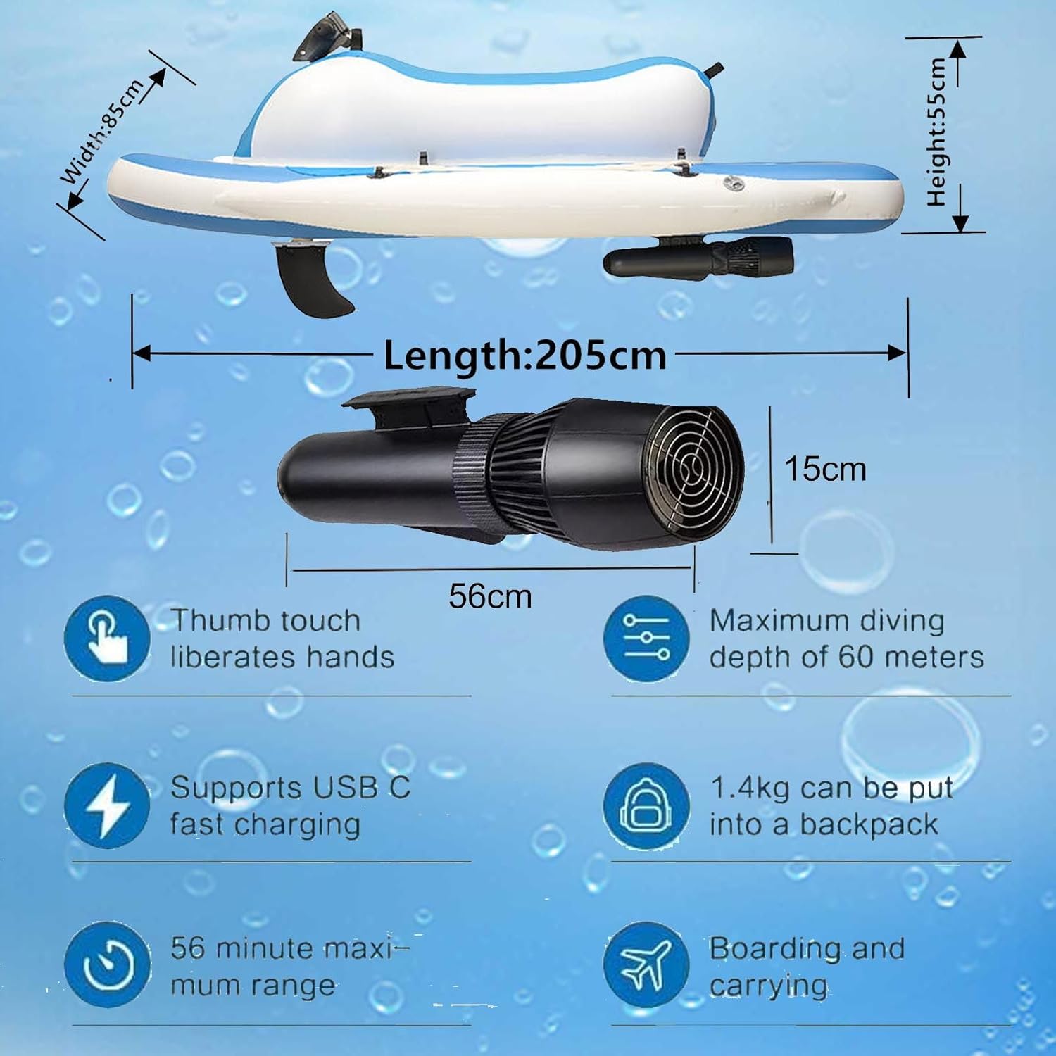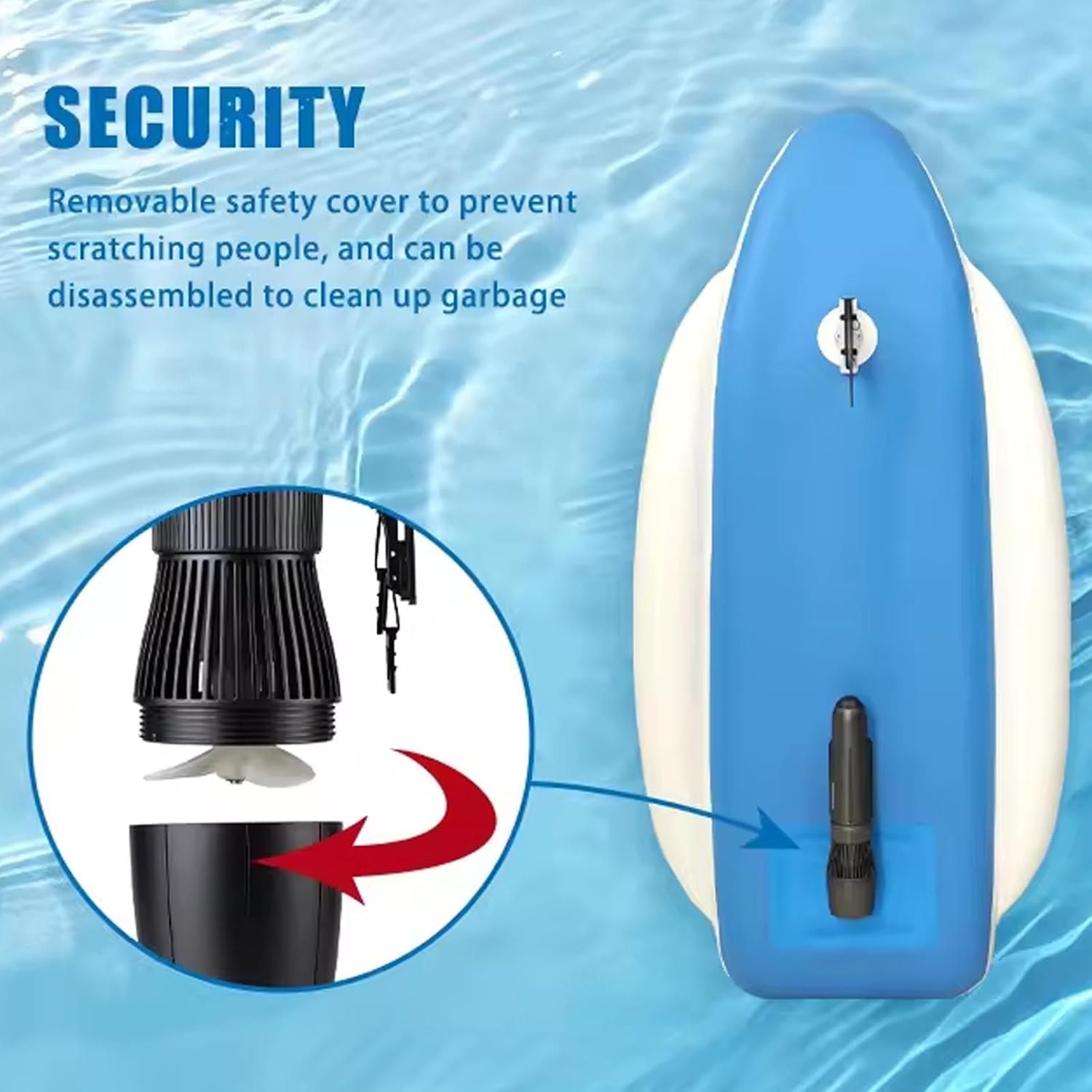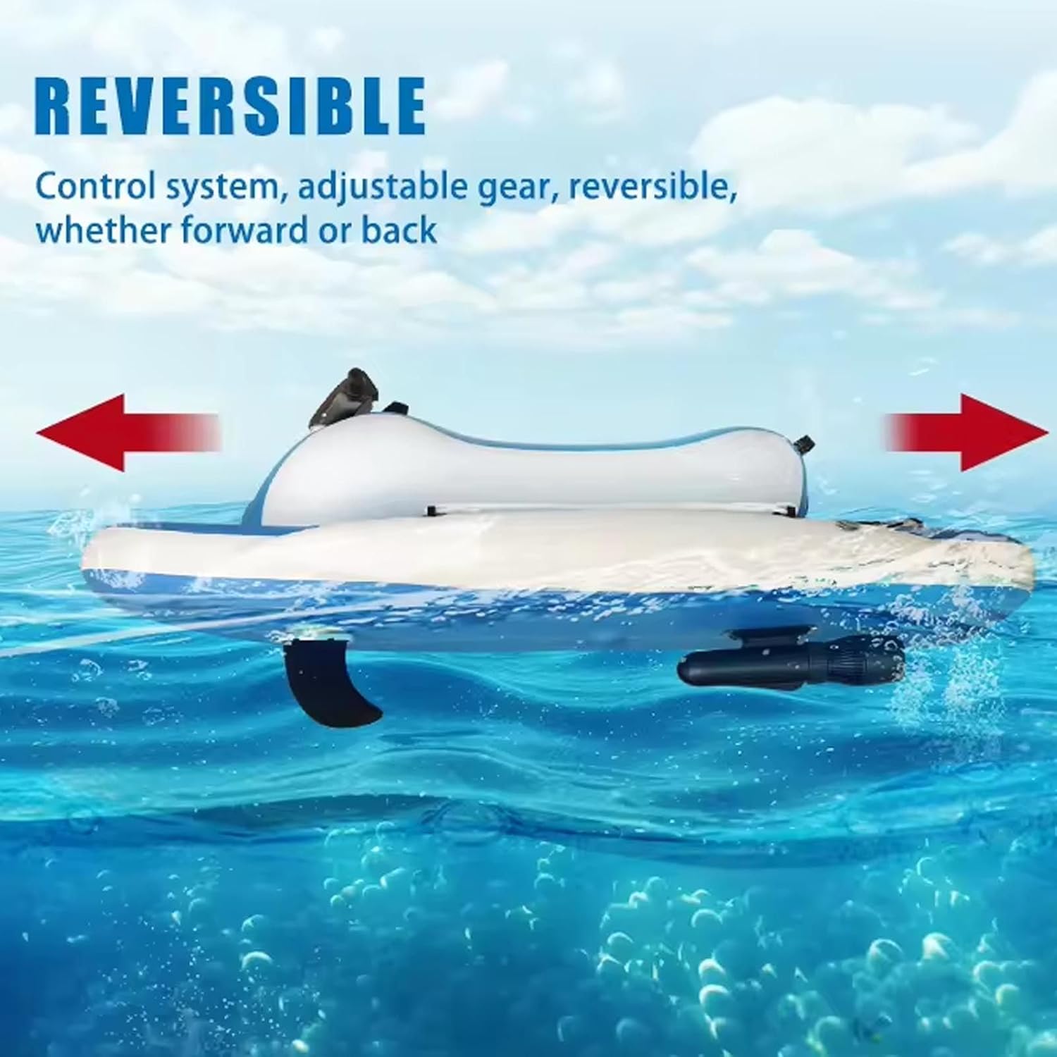 【COMANDO A DISTANZA CON FACILITÀ】 Guida senza sforzo il tuo gommone o scooter utilizzando il telecomando portatile! Regola istantaneamente 3 marce e passa da avanti a indietro da seduto: perfetto per i bambini che imparano la sicurezza in acqua o per gli adulti che gestiscono lunghe sessioni di snorkeling. 【CONQUISTA LE CORRENTI CON UNA POTENZA DI 500 W】Sperimenta velocità emozionanti e stabili (3-10 km/h) grazie a un motore brushless professionale da 500 W e pale fluidodinamiche. Spinta ineguagliabile per l'assistenza con il paddle board, il traino del kayak o rapide manovre di immersione: ideale per principianti e professionisti. 【GIOCA PIÙ A LUNGO】Autonomia fino a 2 ore: Massimizza le avventure acquatiche con 40-130 minuti di divertimento continuo! La batteria ad alta capacità da 10000 mAh supporta lunghe escursioni di snorkeling, giochi in piscina per famiglie ed esplorazioni costiere senza interruzioni. 【COSTRUZIONE RESISTENTE ALL'ACQUA SALATA】Esplora oceani e piscine senza timore! Materiale spazzolato ad alta resistenza migliorato, resistente agli strappi e alle forature, ingegneria a prova di rottura! Guscio stampato a iniezione resistente a urti, cadute e corrosione dell'acqua di mare: essenziale per i nuotatori abituali in mare e sufficientemente resistente per i bambini che lo maneggiano in modo aggressivo, così puoi nuotare a tuo piacimento senza preoccuparti della sua longevità. 【MANIGLIA REGOLABILE A 360° PER UN CONTROLLO TOTALE】Personalizza all'istante la tua presa! La maniglia dello scooter subacqueo a sgancio rapido ruota di 360° per un perfetto posizionamento ergonomico in qualsiasi immersione. Gli adulti trainano facilmente l'attrezzatura, mentre i bambini mantengono una presa sicura durante le lezioni di nuoto.