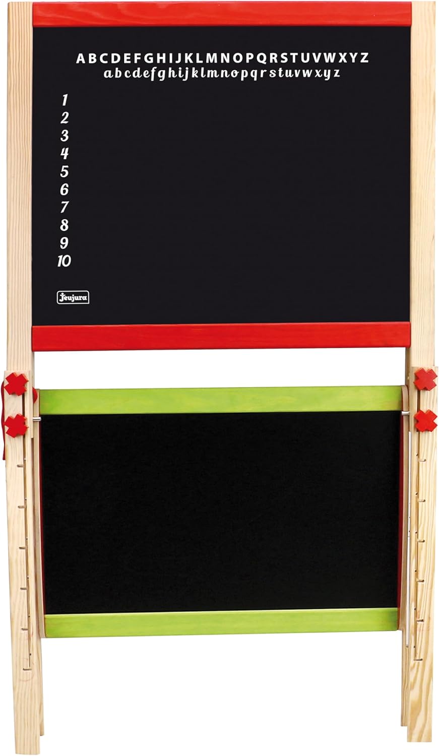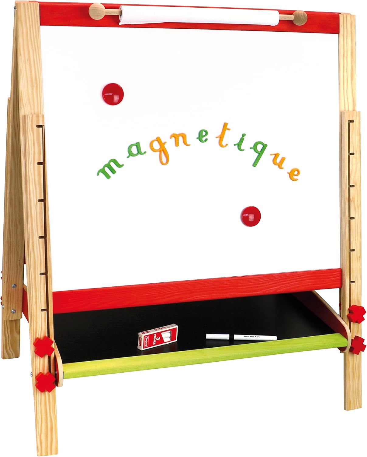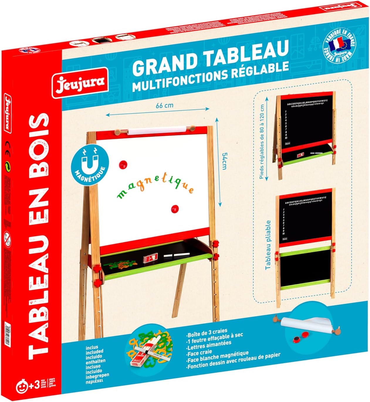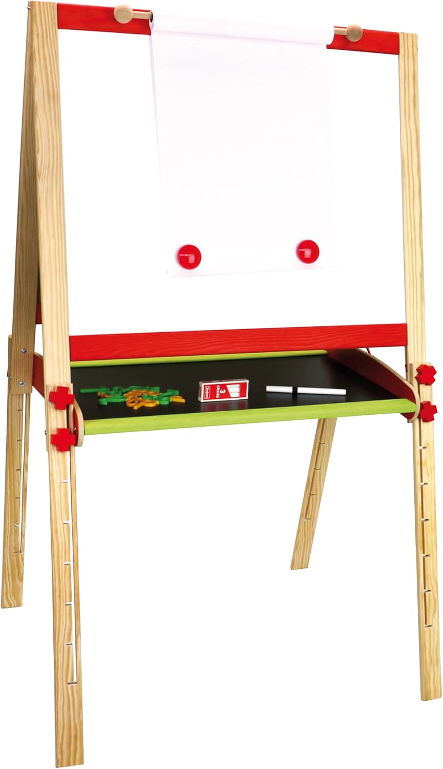 Lavagna multifunzionale grande regolabile Dimensioni del prodotto lavagnette 66 x 54 cm - altezza da 80 a 120 cm Due lavagnette una lavagnetta per scrivere con il gesso una lavagnetta bianca magnetica per feltro e lettere magnetiche Ripiano portaoggetti Accessori rotolo di carta 2 magneti scatola per lettere magnetiche con gesso e feltro Età minima 3 anni Fabbricato in Francia