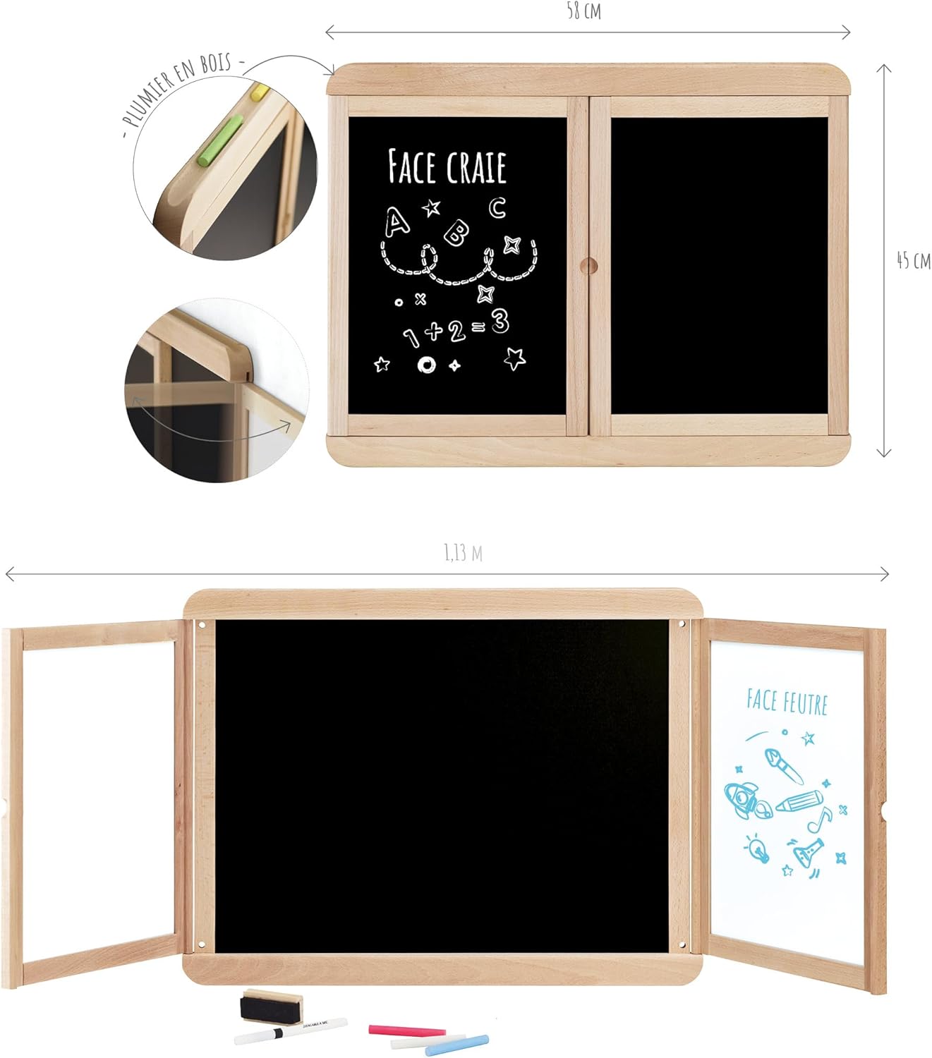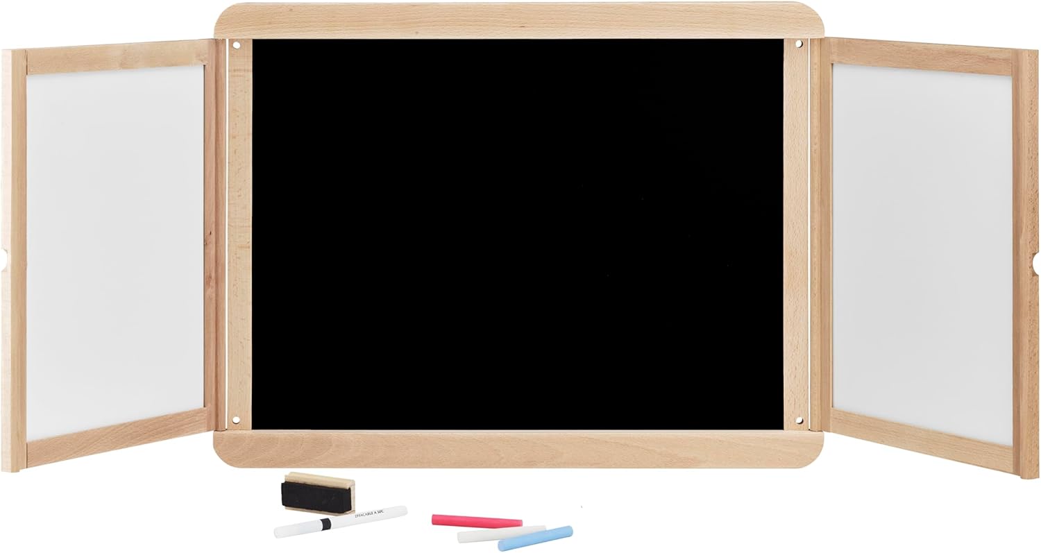 INDISPENSABILE: Un grande classico dei giochi di imitazione, questa tavola in legno ti permetterà di dare libero sfogo alla tua fantasia e descrivere tutti i tuoi messaggi... CORNICI IN LEGNO NATURALE: Una lavagnetta centrale per scrivere con il gesso e due pannelli con un lato bianco e un lato per scrivere con il gesso. TANTISSIMI ACCESSORI: scatola da 3 gessetti colorati, pennarello cancellabile e pennello da lavagna in legno DIMENSIONI LAVAGNA APERTA: 113 x 45 (ht) cm. Chiuso: 58 x 45 (ht) cm IDEA REGALO: Giocattolo Made in France. Ideale a partire dai 3 anni, grandi e piccini potranno divertirsi disegnando e scrivendo