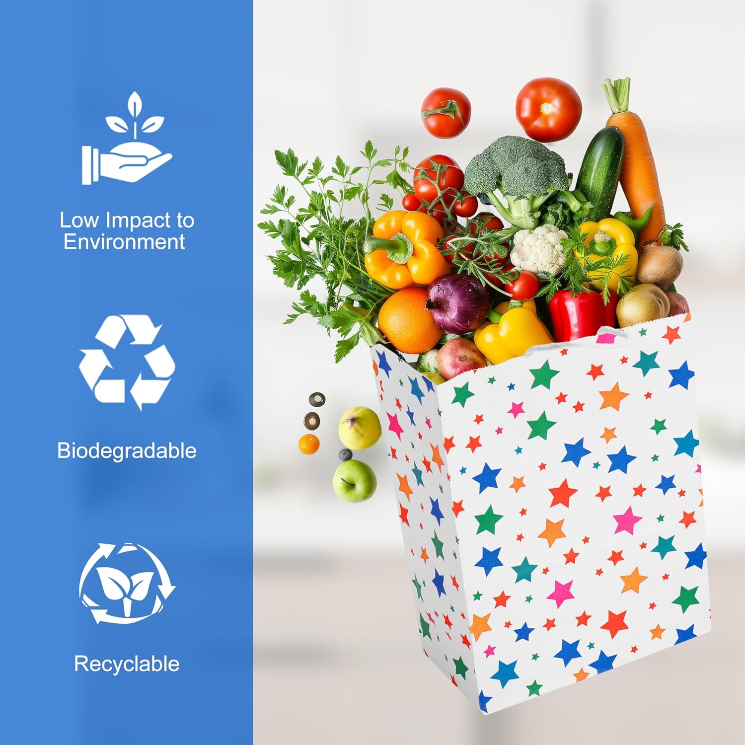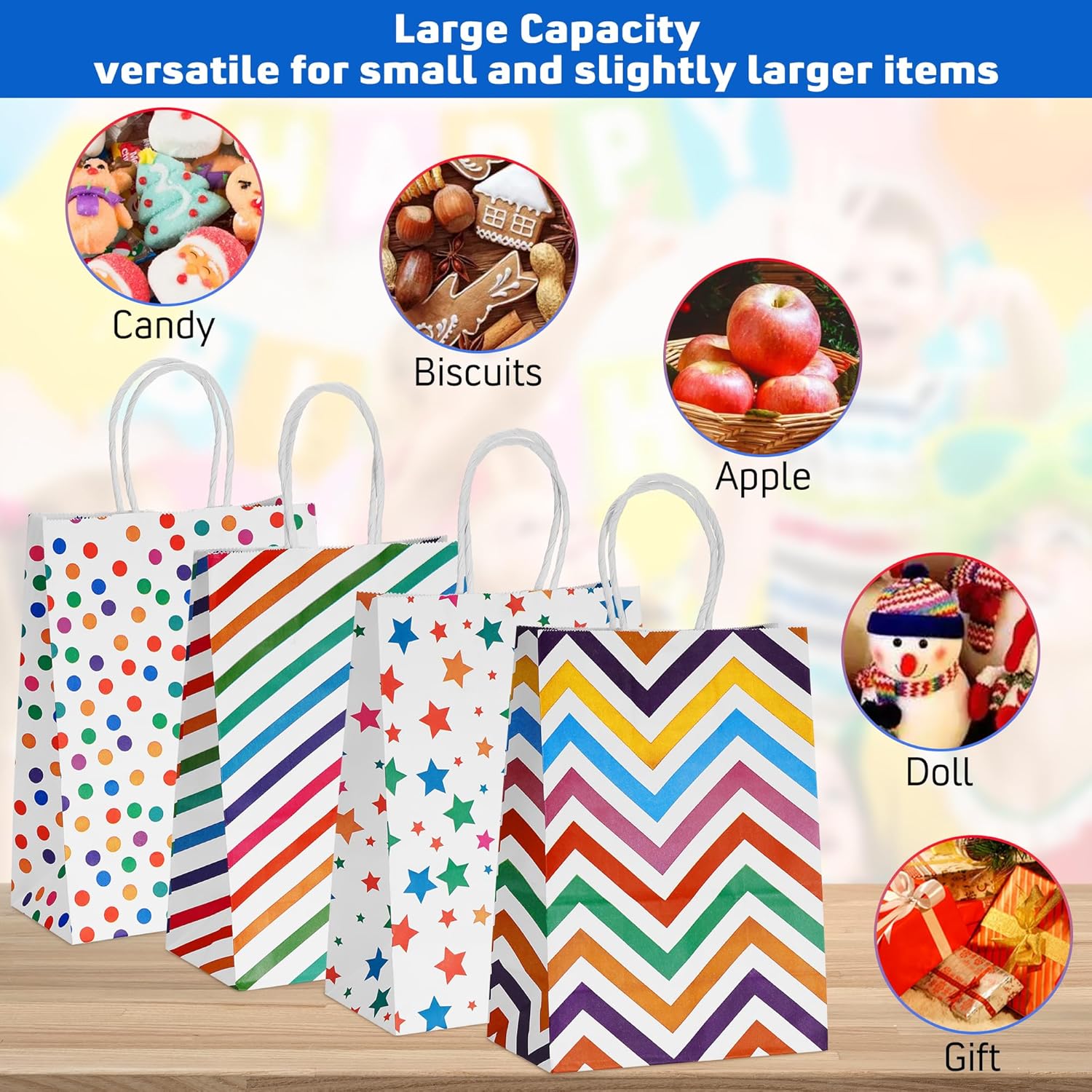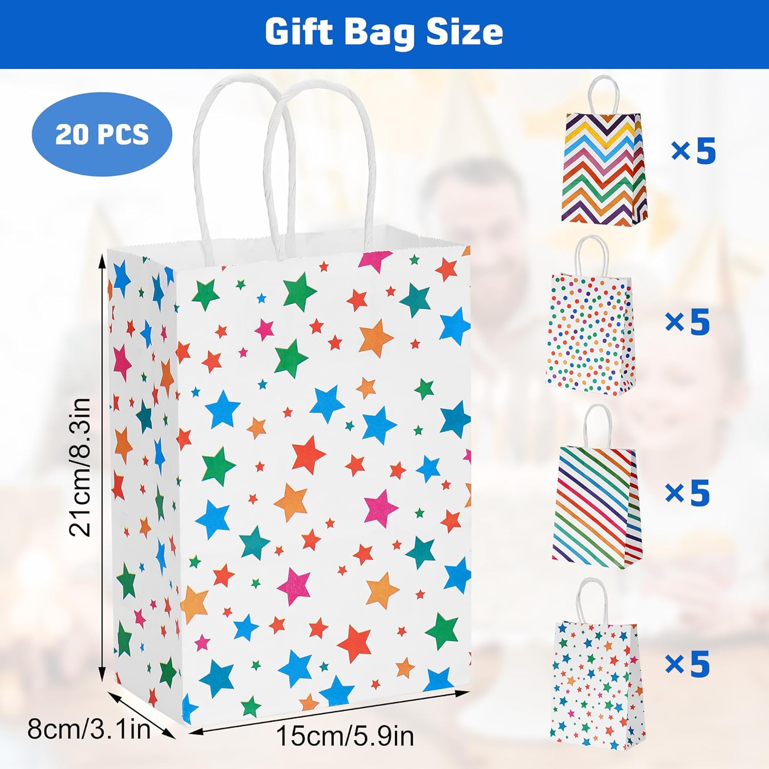 Quantità e dimensioni sufficienti: la confezione contiene 20 sacchetti di carta kraft, sufficienti per l'uso quotidiano. E le dimensioni sono 15 cm x 8 cm x 21 cm, il che lo rende versatile per oggetti piccoli e leggermente più grandi. Ideale per vendita al dettaglio e uso personale, offre grande valore e convenienza. Resistente: ciascuna delle nostre borse regalo resistenti con manici può contenere fino a 15 libbre e offre un'eccezionale resistenza allo strappo e durata. Ideale per trasportare regali pesanti senza il rischio di strapparsi e fornire un'esperienza di trasporto affidabile. Ecologici e riutilizzabili: i nostri sacchetti di carta kraft sono realizzati con materiali riciclabili di alta qualità e non sono solo ecologici ma anche riutilizzabili. Aiutano a ridurre l'impatto ambientale, rendendoli la scelta perfetta per chi cerca soluzioni sostenibili. Design semplice: i nostri sacchetti regalo bianchi sono disponibili in quattro modelli colorati tra cui pois colorati, stelle, strisce e strisce ondulate, aggiungendo un tocco festoso a ogni occasione e rendendo i tuoi regali davvero unici e personali. MULTIUSO - Questi sacchetti per feste in carta, minimalisti e pratici, sono adatti per una varietà di occasioni, tra cui matrimoni, feste di compleanno, shopping e celebrazioni stagionali. Funzionano bene come confezioni regalo, borse per la spesa al dettaglio o per l'uso quotidiano.