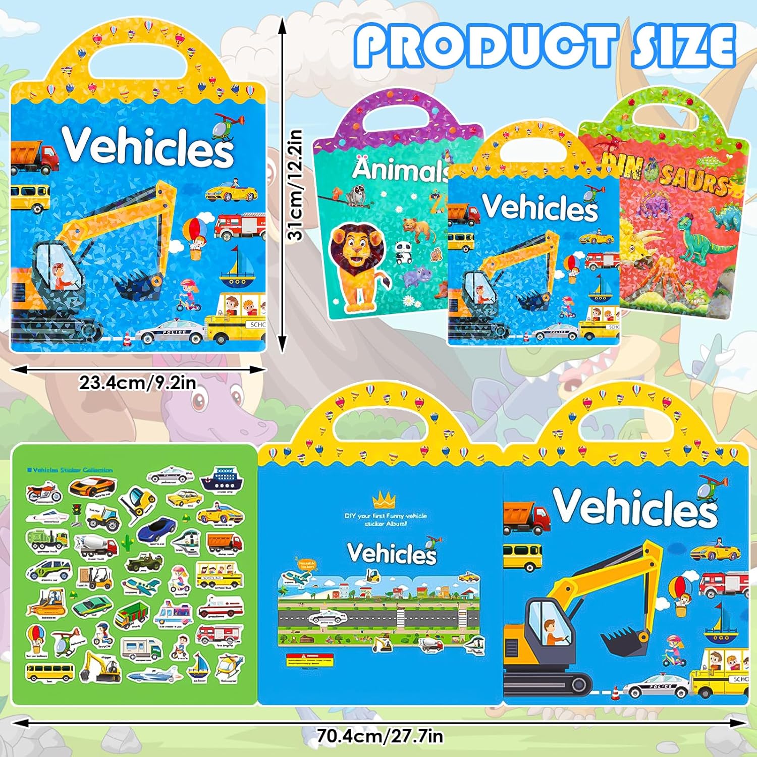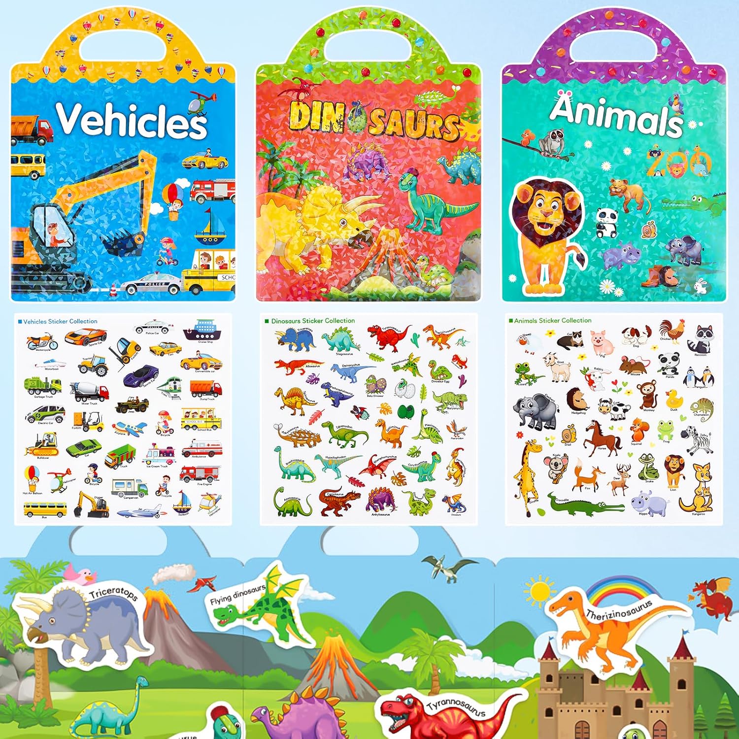 💕【Set di libri di adesivi】Questi libri di adesivi per bambini piccoli sono dotati di 3 temi: adesivi di dinosauri, adesivi per veicoli, adesivi per animali dello zoo. Ogni libro di adesivi viene fornito con adesivi da 2 pagine. Giocattolo educativo e di apprendimento per i bambini che usano la loro immaginazione per aggiungere adesivi ovunque nel libro. 💕【Design con maniglia e divertimento fai-da-te】I libri di adesivi per bambini dai 3 ai 6 anni con maniglia portatile, perfetti per i bambini in movimento. Questi adesivi per bambini sono abbastanza facili da attaccare su finestre, superfici lisce come vetro, specchio, acquario, frigorifero, ecc. 💕 【Libro di adesivi riutilizzabile】 Il libro di adesivi riutilizzabile è realizzato in PVC autoadesivo, nessuna traccia dopo la rimozione e lavabile. Inoltre, gli adesivi per bambini non danneggeranno finestre, mobili o dispositivi elettrici. 💕 【Regali significativi per i più piccoli】 Adesivi per tesi per bambini con carta dai colori brillanti fronte-retro, motivi vivaci e borsa con manico, sarà uno dei giocattoli educativi più interessanti al momento. Fantastici regali di compleanno e Pasqua per libri di adesivi per bambini. 💕 【Giocattoli educativi per bambini piccoli】 La prima infanzia è un momento critico per lo sviluppo intellettuale. Il nostro libro di adesivi riutilizzabile per bambini è adatto ai bambini in età prescolare per imparare presto un vocabolario semplice e riconoscere diversi modelli di animali. Svilupperà l'immaginazione e la concentrazione, allenerà la cooperazione occhio-mano, abilità pratiche, pazienza.