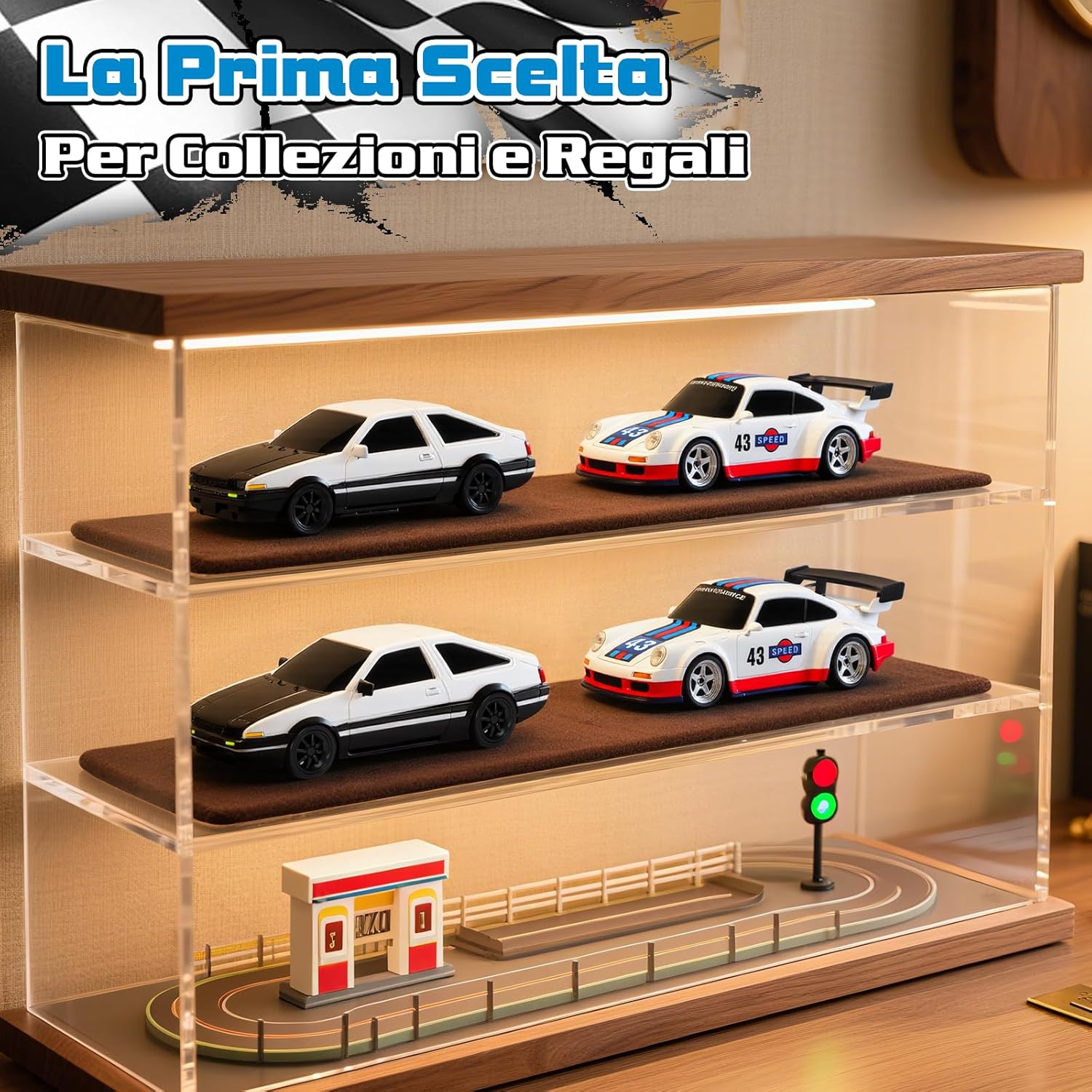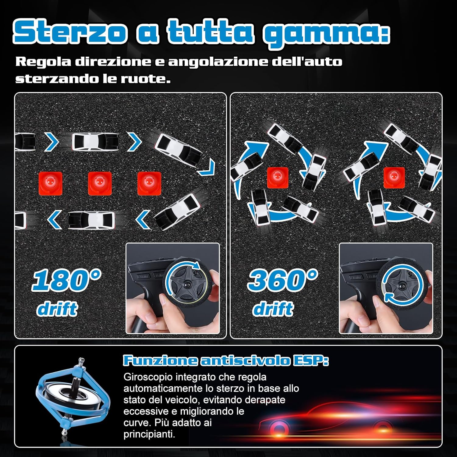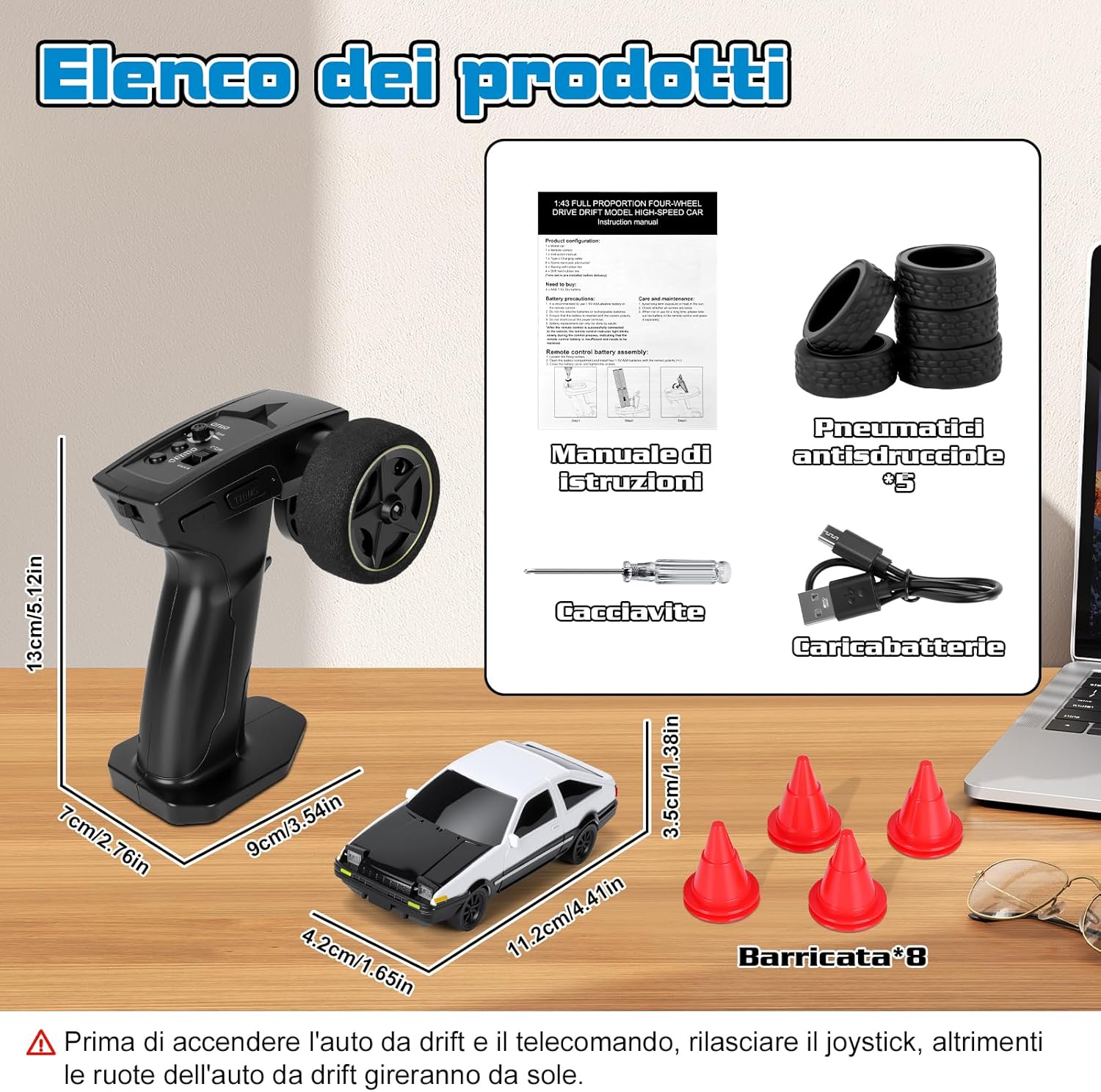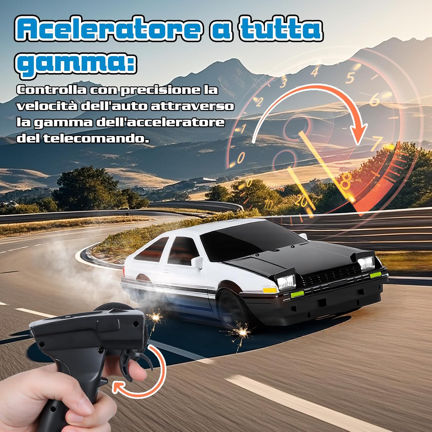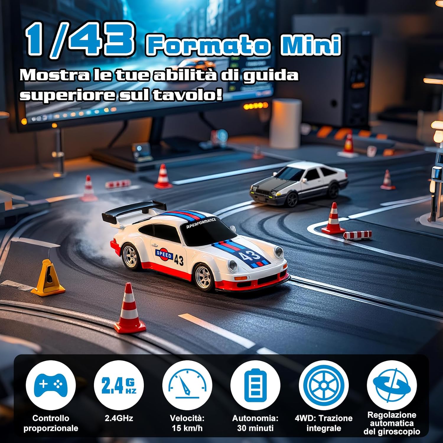 🚗【Modello 1:43 Accattivante】 Questa macchina telecomandata drift in scala 1:43 ha un look accattivante. Piccola quanto mezza mano, vanta un design da corsa completo. La carrozzeria in PVC di alta qualità è lucida, flessibile e resistente agli urti. Con fari anteriori e posteriori, si distingue anche di notte. Ideale da esporre o far derapare sulla scrivania, regala un'esperienza visiva e di guida sorprendente. 🚗【Auto Drift RC a Controllo Proporzionale】 Questa macchina telecomandata drift adotta un sistema di controllo proporzionale che offre un'esperienza di guida realistica. L'accelerazione aumenta gradualmente con il movimento del joystick, garantendo fluidità; anche l'angolo di sterzata varia in base al comando, permettendo curve e derapate precise. È una scelta ad alte prestazioni, ideale per principianti e appassionati di Auto Telecomandata Drift. 🚗【Giroscopio di Precisione Integrato (Versione Pro)】 Il giroscopio integrato con sistema di regolazione automatica corregge la direzione in base al movimento, evitando sbandate e ribaltamenti, migliorando le tue derapate. Con trazione integrale e motore potente, raggiunge i 15 km/h con ottima aderenza. Autonomia di circa 30 min, ricarica comoda via USB Type-C. 🚗【Sistema di Controllo Remoto a 2,4 GHz】 Con sistema wireless a 2,4 GHz, consente a più rc car di correre insieme senza interferenze. Il telecomando gestisce avanti/indietro, sterzata destra/sinistra, controllo luci e calibrazione ruote anteriori, utile per mantenere la traiettoria e migliorare l’esperienza di drifting. Richiede 4 batterie AAA da 1,5 V (non incluse). 🚗【Regalo Perfetto】 Questa drift car è un’ottima idea regalo, adatta ad adulti e ragazzi sopra i 14 anni. Compatta e ideale per l’uso indoor. Con 8 coni inclusi, puoi creare una pista su tavolo o pavimento e liberare la tua creatività. Acceleratore e sterzo proporzionali offrono una vera sensazione di drift. Non è solo un giocattolo, ma una mini arena di drifting tutta per te!