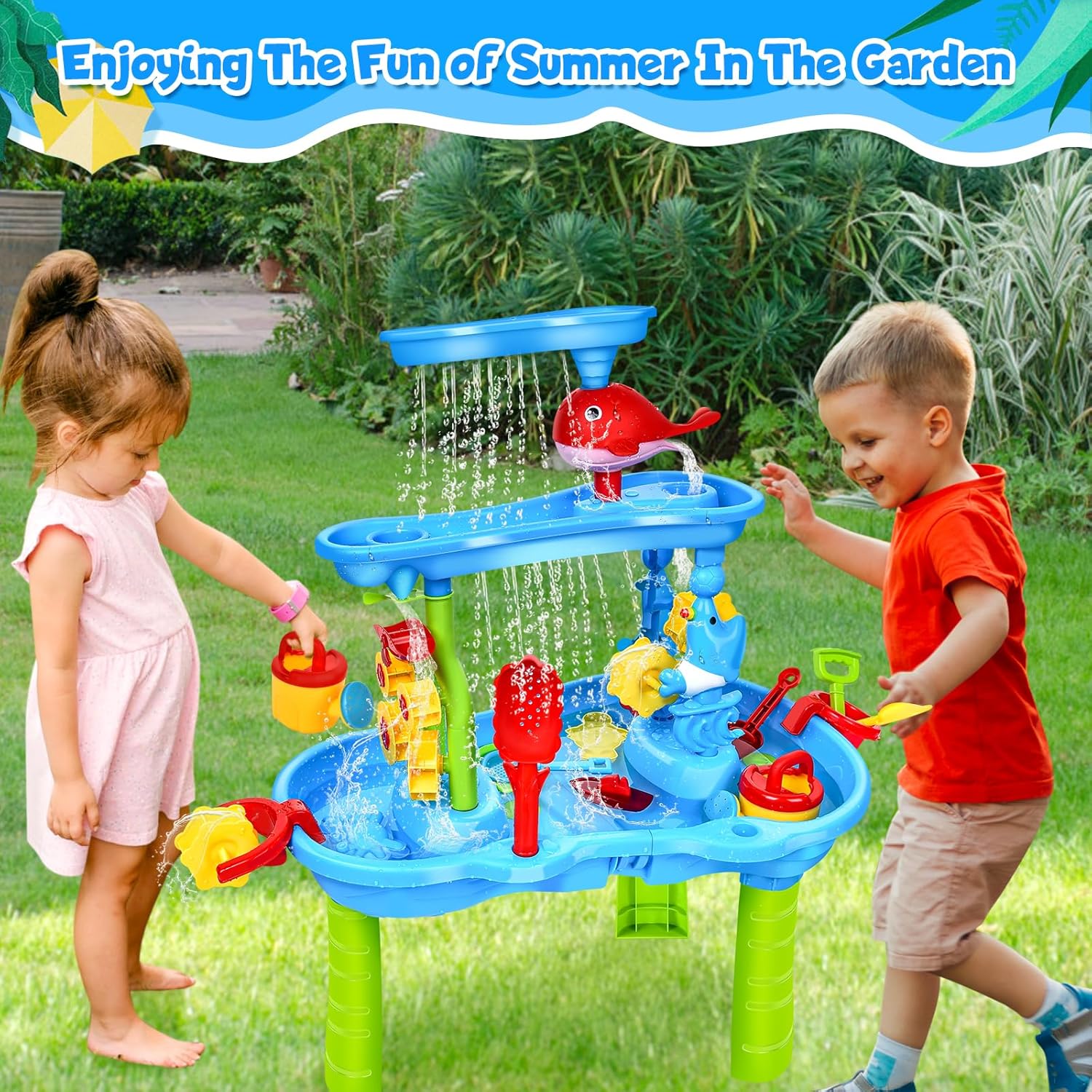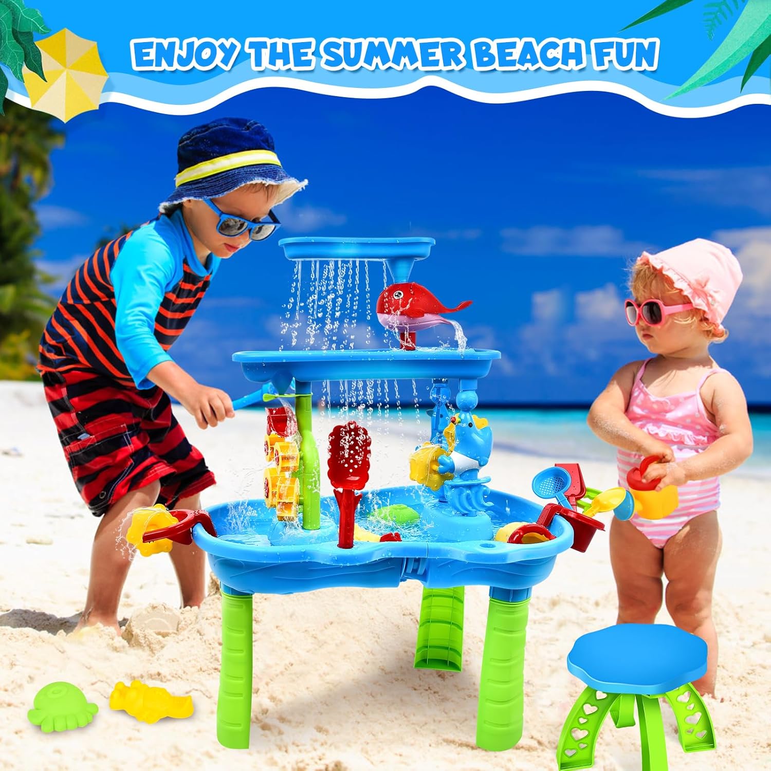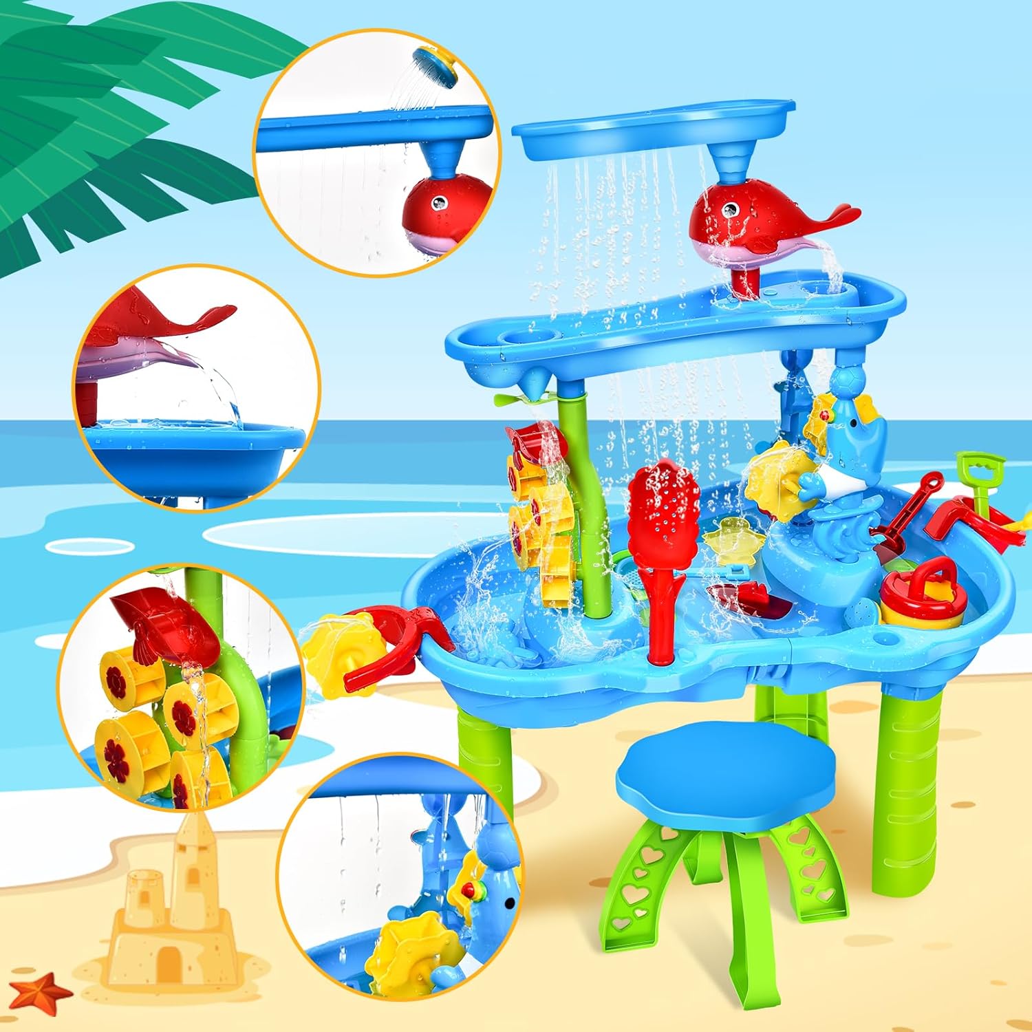 Grande tavolo da acqua con sabbia a 3 livelli con sedia: questo tavolo per attività con sabbia e acqua misura 85 cm*63 cm*42,5 cm. La parte superiore di questa falda a tre livelli di sabbia e acqua è collegata da un piccolo delfino. Quando l'acqua viene versata nel bacino dell'acqua, forma una cascata e ruota con il mulino ad acqua quando installato. Molteplici opzioni di gioco che ospitano acqua, sabbia, neve, terra o qualsiasi cosa tu possa immaginare per molteplici esplorazioni sensoriali. i nostri tavoli da gioco da spiaggia faranno sempre divertire e divertire i vostri bambini! Tavolo da spiaggia con tanti accessori: questo giocattolo da esterno per i più piccoli è dotato di accessori colorati e ricchi per creare più divertimento e creare un regno da sogno per i bambini. Comprende un tavolo, un annaffiatoio, una tartaruga, un polipo, una pala, un rastrello, una barca, un mulino ad acqua, un colino e un piccolo sgabello, uno stampo per la sabbia a forma di granchio e coccodrillo, ecc. Le diverse forme possono soddisfare la curiosità dei bambini. I colori vivaci incoraggiano la sensibilità dei bambini ai colori. Accessori perfetti per spiagge interne ed esterne, piscine, prati, cortili, ecc. Giocattolo da spiaggia multifunzionale: può essere utilizzato come tavolo per la sabbia, falda freatica e tavolo da attività per bambini, ecc. Usato. I bambini possono usarlo come una piccola piscina o una mini spiaggia che li farà divertire per ore! Il tavolo da gioco acquatico è il giocattolo estivo ideale. Questo tavolo da gioco acquatico incoraggia il tuo bambino a svolgere attività più tattili, migliora la coordinazione occhio-mano e l'immaginazione dei bambini. I bambini possono giocare sulla spiaggia e in acqua con una varietà di giocattoli e accessori da spiaggia. Facile da montare e pulire: con istruzioni di installazione illustrate (sulla scatola). Questa sabbiera è facile da montare, robusta, dai colori vivaci e ha un design fantastico. I bambini possono esplorare e costruire insieme con l'aiuto dei genitori e possono essere facilmente puliti e riposti dopo il gioco. Basta sciacquare con acqua e pulire con un panno umido. Un regalo ideale per il giardino: il tavolo da sabbia può essere portato ovunque, come spiaggia, piscina, giardino, cortile, parco, prato, ecc. È adatto sia per interni che per esterni. Il tavolo da sabbia è progettato appositamente per i bambini, gli angoli arrotondati e la superficie liscia proteggono i tuoi bambini. I colori sono vivaci e gli accessori numerosi. Regalo ideale per l'estate. I bambini potranno giocare con questi giocattoli da spiaggia anche nella vasca da bagno o in piscina, per rendere i giochi in acqua ancora più divertenti.