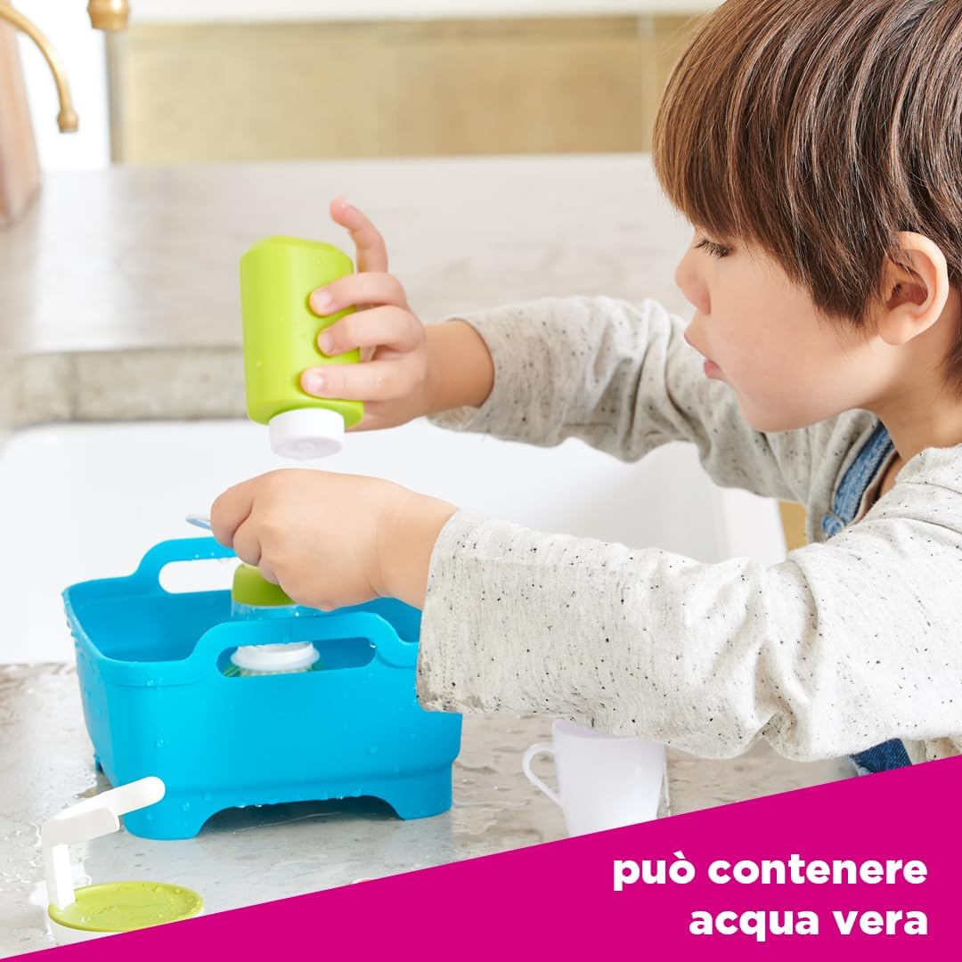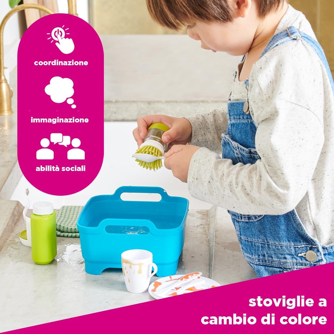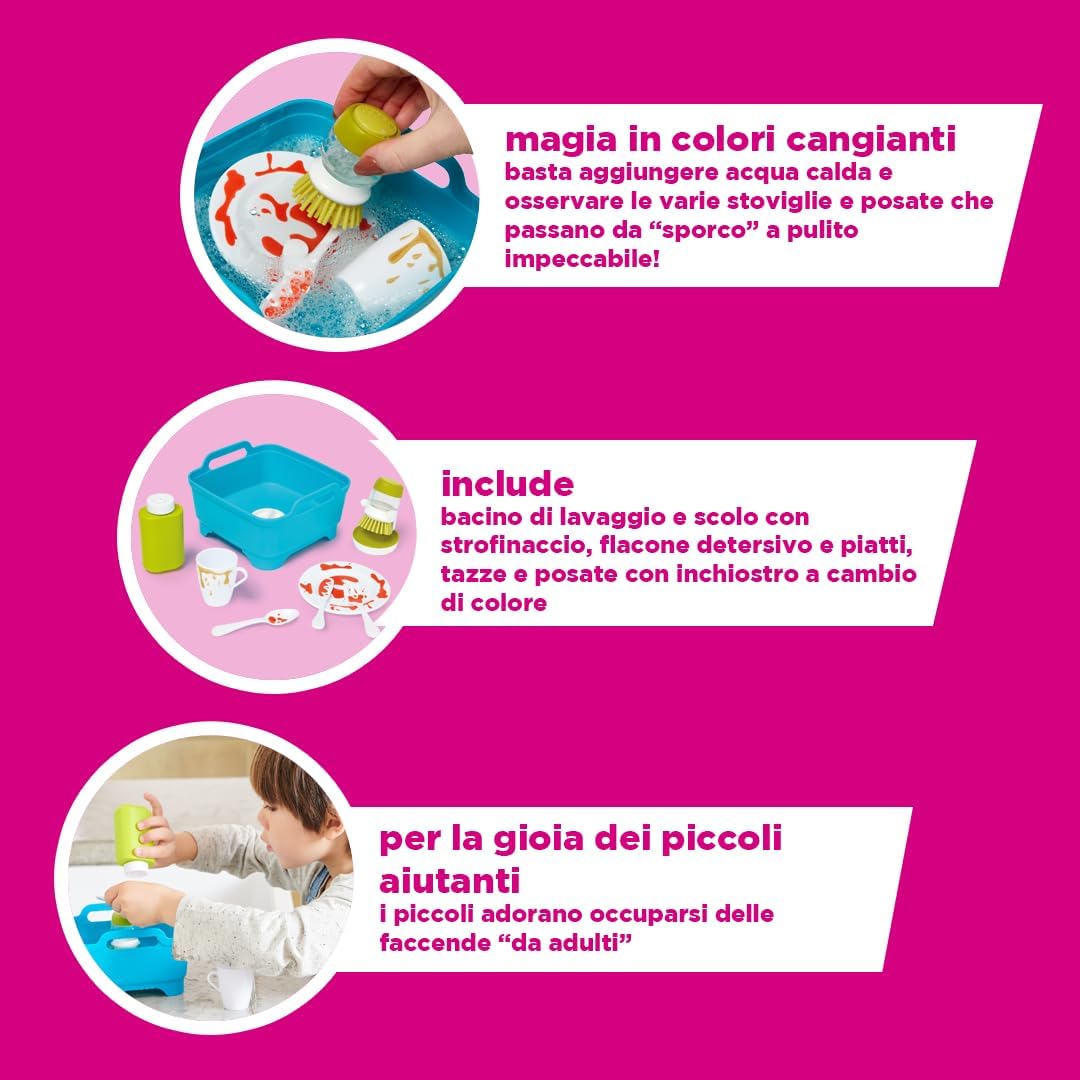 DIVERTIMENTO IN TANTISSIMI ELEMENTI: dal riempire la vaschetta del bucato al pulire i piatti che cambiano colore, ci sono tantissimi modi per giocare! EMOZIONI CHE CAMBIANO COLORE: Basta aggiungere acqua calda per vedere le stoviglie e le posate passare da "sporche" a pulite! PERFETTO PER IL GIOCO DI RUOLO: i più piccoli adoreranno essere coinvolti in compiti "da adulti", acquisendo un vero senso di realizzazione. INCLUDE: Vaschetta di lavaggio e scarico con scrub per palme, flacone di sapone e piatti, tazze e posate con inchiostro che cambia colore. ADATTO A PARTIRE DA 3 ANNI IN SU: Non sono necessarie batterie.