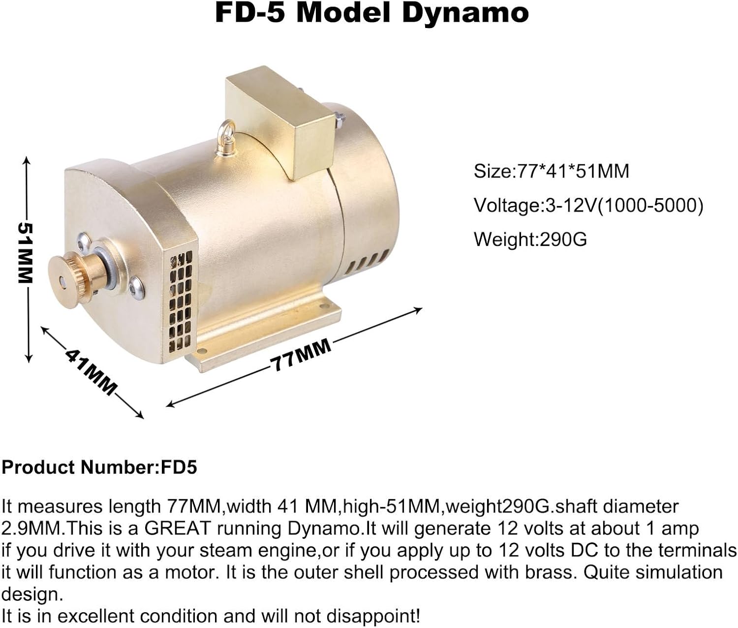 【Dimensioni】Questo accessorio misura 7,7 x 4,1 x 5,1 cm (L x P x A) e pesa solo 290 grammi ed è adatto per una varietà di modelli di motori a vapore o a combustione interna e sistemi fai-da-te. 【Versatile】 Supportando l'uso del motore a vapore, genererà una tensione di 12 V con una corrente di circa 1 A e verrà utilizzato come motore se ai terminali viene applicata una tensione di 12 V CC. 【Materiale durevole】 L'alloggiamento è realizzato in ottone di alta qualità per garantire durata e stabilità ai motori a vapore e ai motori a combustione interna. 【Scenari applicabili】 Adatto per motori a vapore, motori a combustione interna, esperimenti didattici, modellismo fai-da-te e altri usi. Strumento ideale per gli appassionati di sistemi di alimentazione e gli sperimentatori di fisica. Facile da installare: progettato per l'integrazione diretta nelle configurazioni del modello, è adatto per un'ampia gamma di macchine, garantendo un funzionamento regolare, mantenendo l'energia cinetica e prestazioni affidabili.