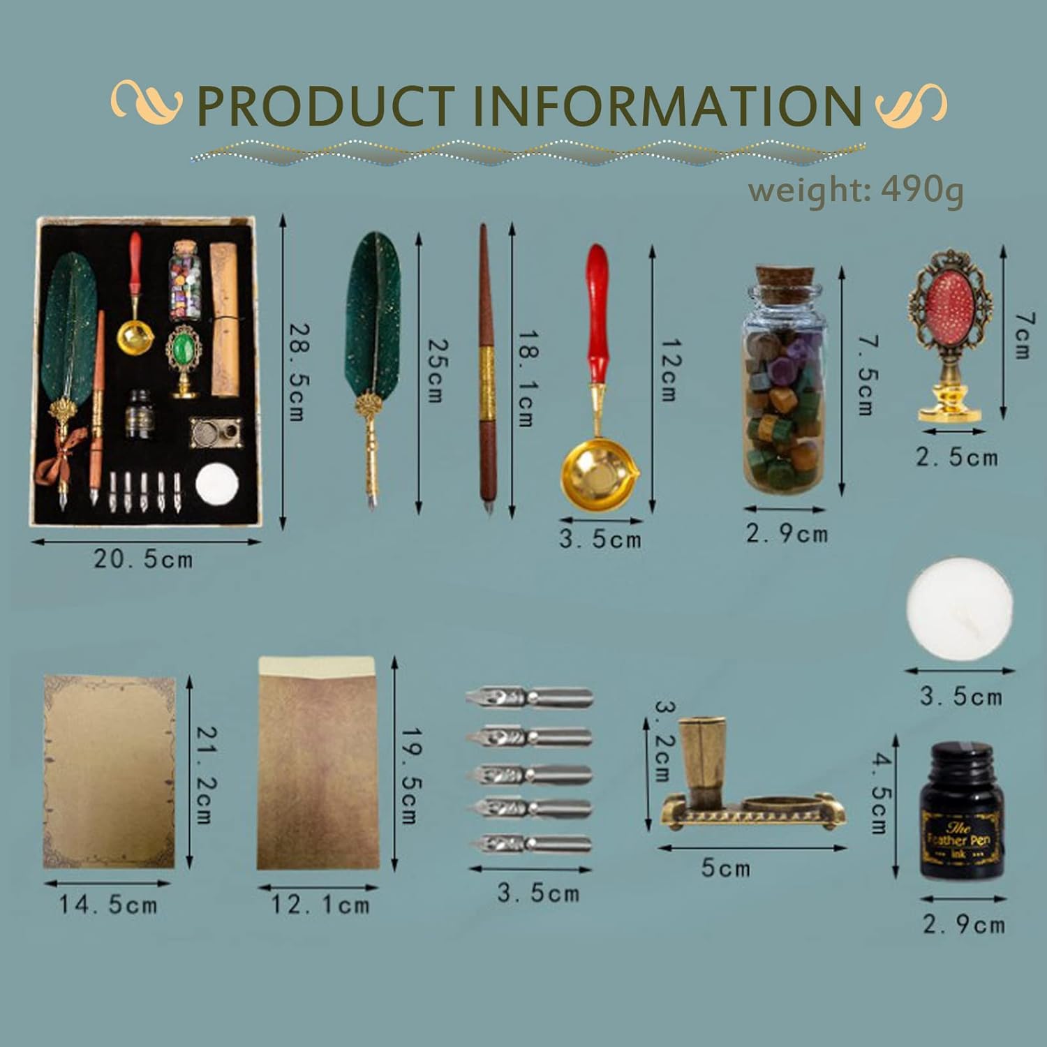 Set di penne a penna con confezione regalo: il set di penne e inchiostro vintage Joyeee include penna a immersione in legno, bottiglia da 15 ml di inchiostro nero, basi portapenne, perline di ceralacca, candelina, cucchiaio per sigillo di cera, carta stazionaria vintage e buste, squisita scatola regalo retrò, dimensioni 29 x 21 x 4 cm (lunghezza x larghezza x altezza). Progettato per l'uso quotidiano: il nostro recinto per calligrafia è realizzato in piume naturali con antiche tinte e sgrassate per mantenere una lucentezza della seta permanente, e decorato con potere dorato lucido, rendendo la penna molto bella visione da ogni vista. 5 punte intercambiabili in metallo per una facile pulizia e un uso a lungo termine. Set di penne a penna per scrittura scorrevole: il corpo della penna lungo e ben bilanciato offre un'esperienza di scrittura confortevole. Il pennino di alta qualità offre un controllo e una stabilità eccellenti. È una scelta ideale per praticare vocabolario, disegno, studio della Bibbia, scrivere lettere, cartoline, inviti, biglietti di auguri, documenti e sigilli regalo. Elegante decorazione per la casa: il set di penna e inchiostro per calligrafia non è solo un set di strumenti di scrittura, ma un'opera d'arte. Il paesaggio unico e bello sia che sia posizionato su una decorazione da scrivania, tavolino da caffè o da utilizzare per l'arredamento della libreria. Sono penne perfette per matrimoni, eventi o feste. Ottimo regalo di compleanno per scrittore: sono ottimi Natale, Pasqua, festa della mamma, festa del papà, compleanno, stagione di laurea idea regalo per tutti gli artisti, illustratori, scrittori, calligrafi, insegnanti e amanti dello stile retrò gotico.