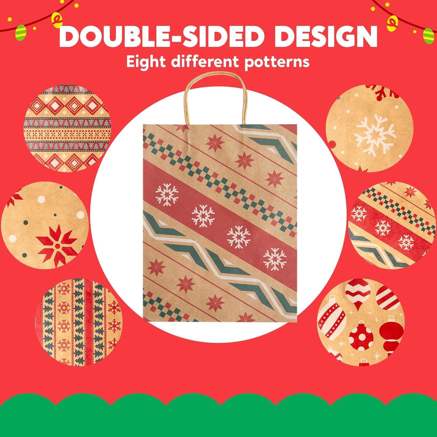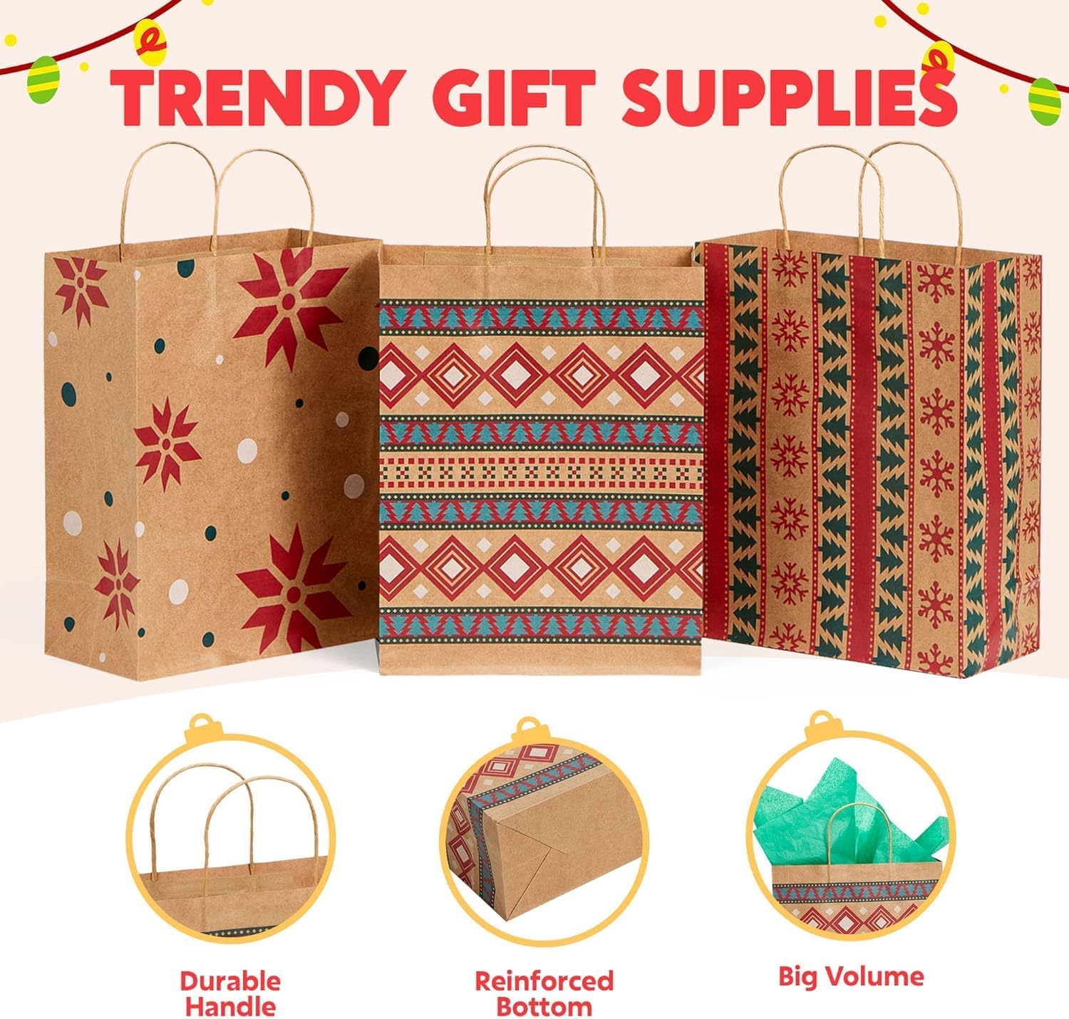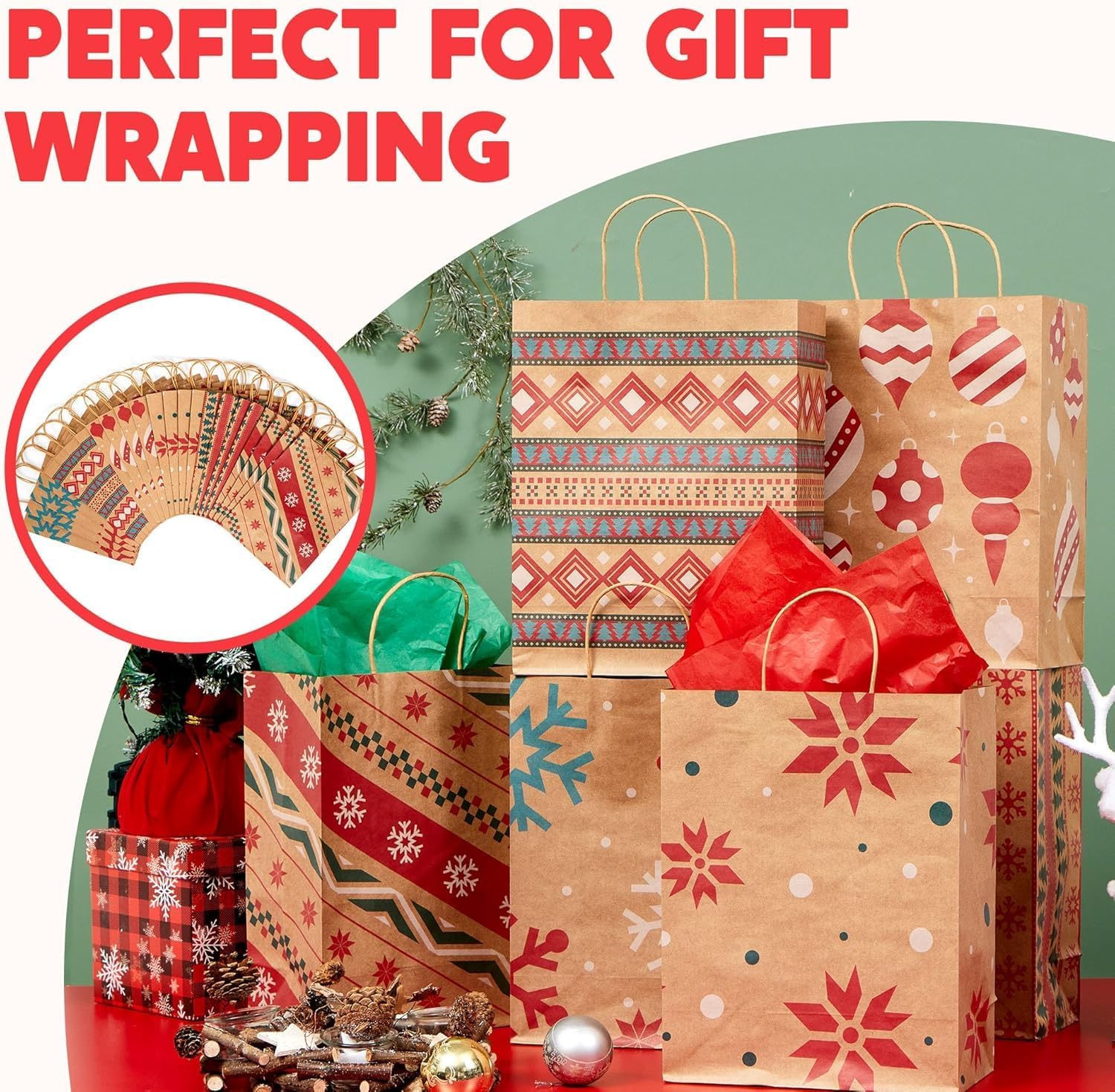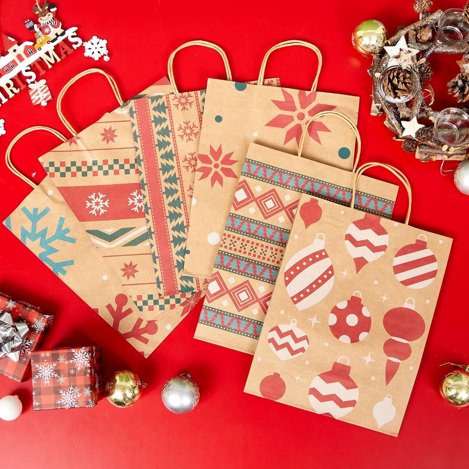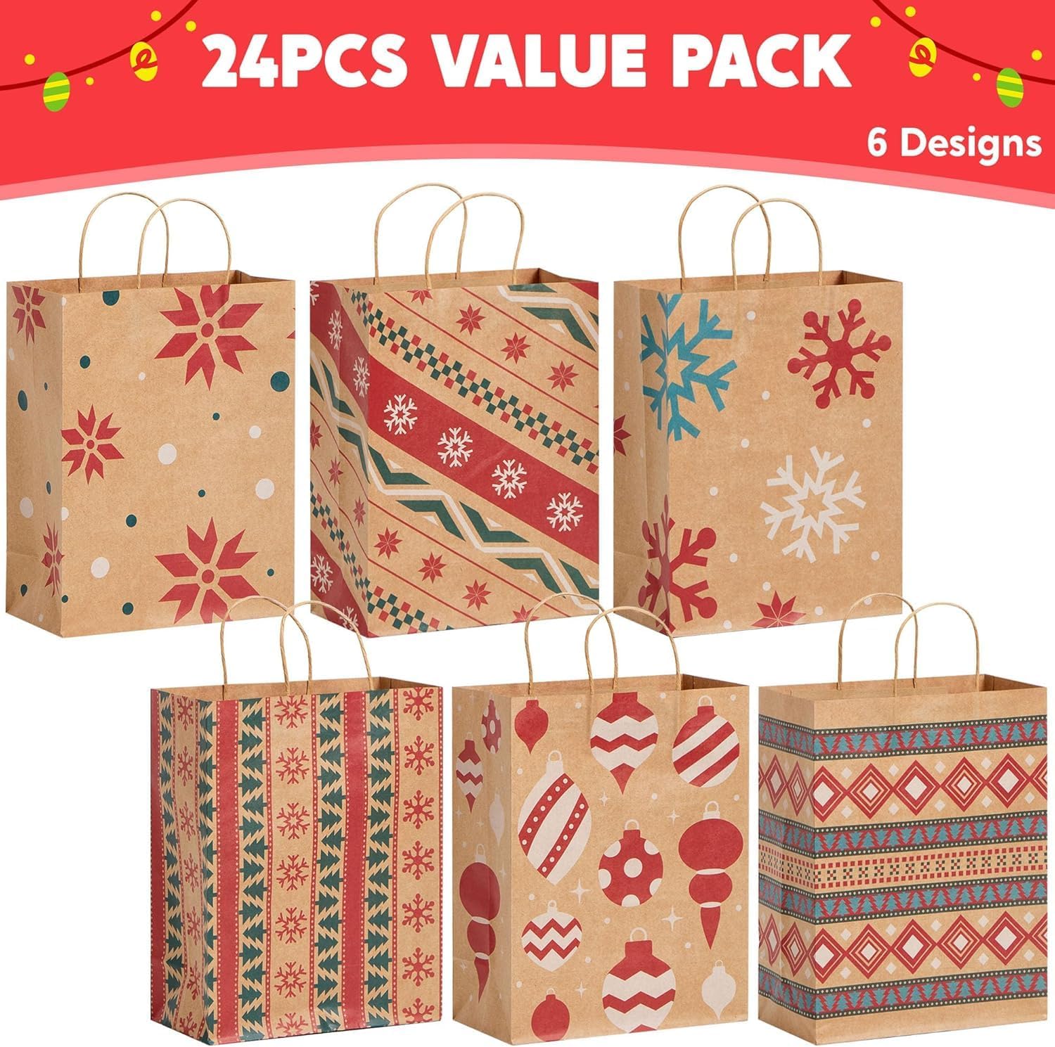 DIMENSIONI E CAPACITÀ GENEROSE Questo set contiene 24 sacchetti regalo di Natale con 6 design (fiocchi di neve, albero di Natale, decorazioni natalizie, ecc.), fornendo un pacchetto completo per tutte le tue occasioni di regali. Con dimensioni di 25,4 x 33 x 12,7 cm, questi sacchetti regalo in Kraft offrono molto spazio per diversi regali e sono quindi versatili. Le borse FORTI E DUREVOLI realizzate con carta kraft di alta qualità sono robuste e possono sopportare il peso dei tuoi regali, garantendo che rimangano intatti durante le festività natalizie. Realizzati con attenzione ai dettagli e materiali di alta qualità, questi sacchetti di carta natalizi con manici sono della massima qualità per garantire che i tuoi regali siano presentati magnificamente. FACILI DA PRESENTARE Grazie alle comode maniglie, queste borse della spesa natalizie rendono la presentazione dei tuoi regali semplice e senza problemi, risparmiando tempo e fatica durante le intense festività natalizie. Migliora la tua esperienza di regalo con questi pratici e adorabili sacchetti da regalo natalizi e rendi i tuoi regali davvero speciali. MULTIUSO - Perfetto per decorazioni natalizie, confezioni regalo, feste, matrimoni e altro ancora. Queste borse natalizie sono versatili e adatte a diverse occasioni. Questi sacchetti regalo natalizi Kraft sono l'aggiunta perfetta alle tue forniture per feste, rendendo i regali più convenienti e festosi. Crea un'atmosfera festosa: i design festivi e i colori vivaci di queste borse rendono la tua esperienza di regalo più gioiosa e memorabile.