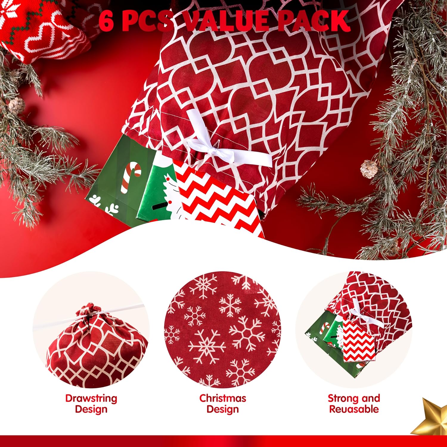 JOYIN Confezione da 6 sacchetti regalo natalizi in tessuto, sacchetti regalo natalizi, colore rosso elegante con 3 misure per regali natalizi con sacchetti di Babbo Natale