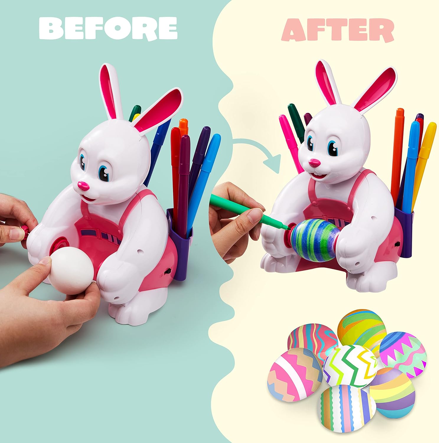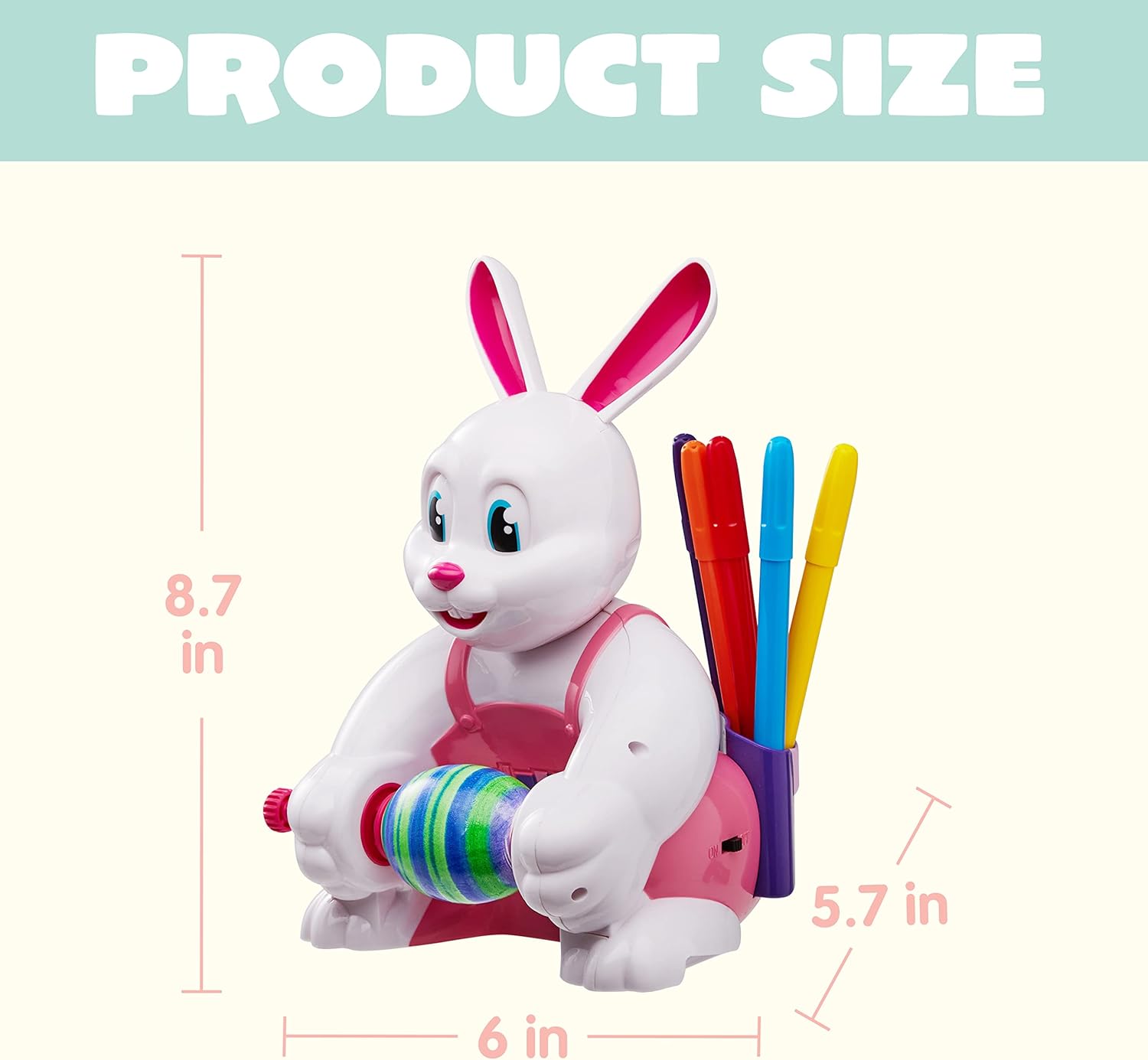 Confezione super conveniente. La nostra macchina per decorare uova di Pasqua include 1 spinner decoratore uovo coniglio e 10 pennarelli coloranti. Richiede 2 batterie AA (non incluse). Simpatico coniglietto occupato che decora le uova renderà le tue vacanze di Pasqua divertenti! Design unico. Il coniglietto tiene l'uovo tra le zampe e gira l'uovo automaticamente una volta che l'interruttore è acceso! Inserisci un uovo vuoto e un coniglio occupato fa girare l'uovo mentre disegni! Il kit da colorare con coniglietto di Pasqua con spinner è realizzato in plastica robusta e resistente non tossica, i pennarelli vivaci a base d'acqua sono altamente pigmentati, di lunga durata. È adatto per bambini di età superiore ai 36 mesi per giocare. Facile decorare le tue uova di Pasqua con il kit di decorazione JOYIN Easter Egg Spinner Divertimento infinito. Questo kit di decorazione per uova di Pasqua è ideale per decorare le uova di Pasqua con la famiglia e gli amici. Perfetto come riempitivo per cestini pasquali. Ideale per attività pasquali, scuola pasquale e attività di classe, attività pasquali in famiglia e giochi e molto altro ancora Qualità e sicurezza premium. Sicuro per i bambini: non tossico. Soddisfa lo standard dei giocattoli statunitTest di sicurezza approvato. SODDISFAZIONE DEL CLIENTE. Fornire un'esperienza di soddisfazione al 100% è la nostra priorità principale per i nostri clienti. Sentiti libero di inviarci un messaggio tramite "contatta i venditori" se i prodotti non soddisfano le tue aspettative. Le celebrazioni iniziano alle JOYIN!