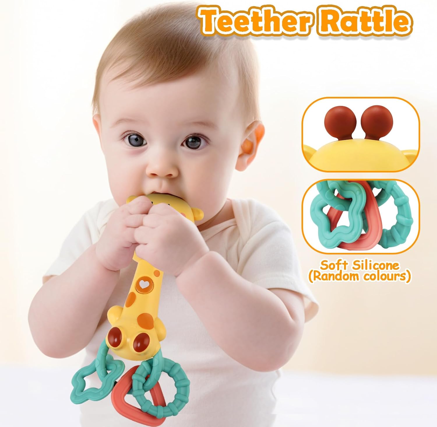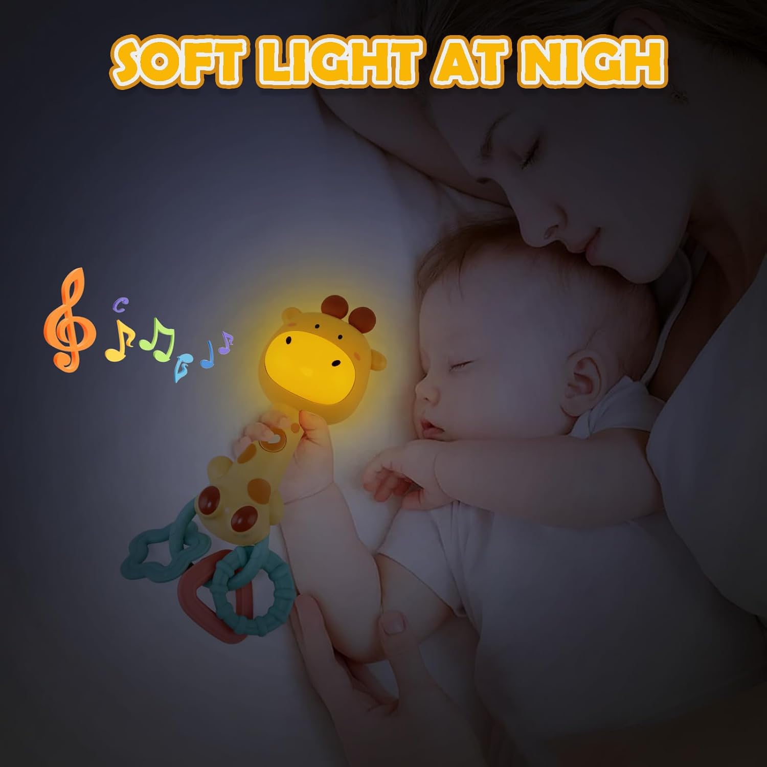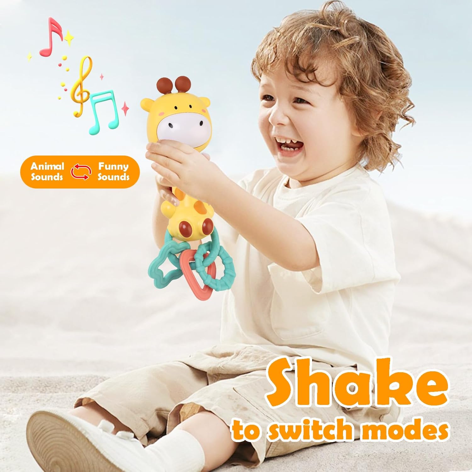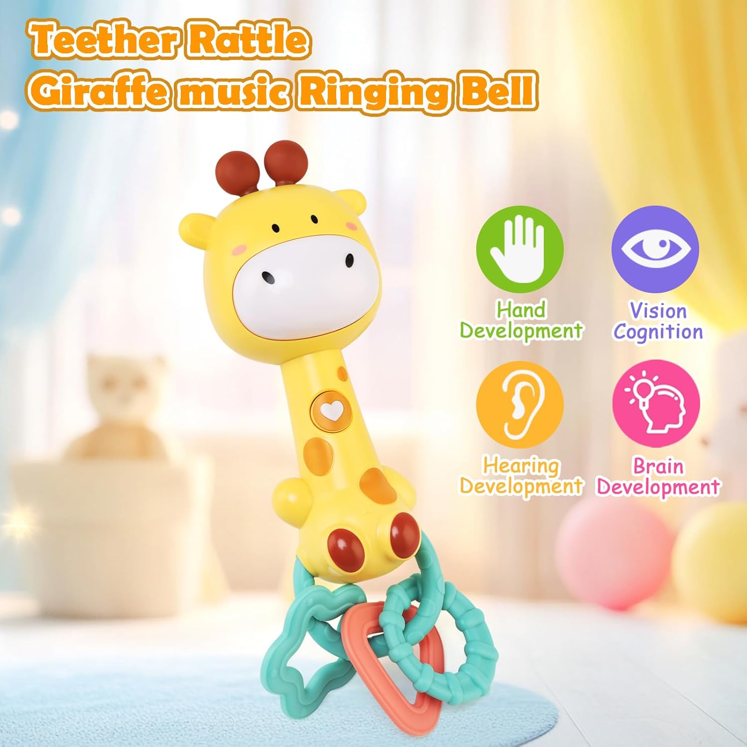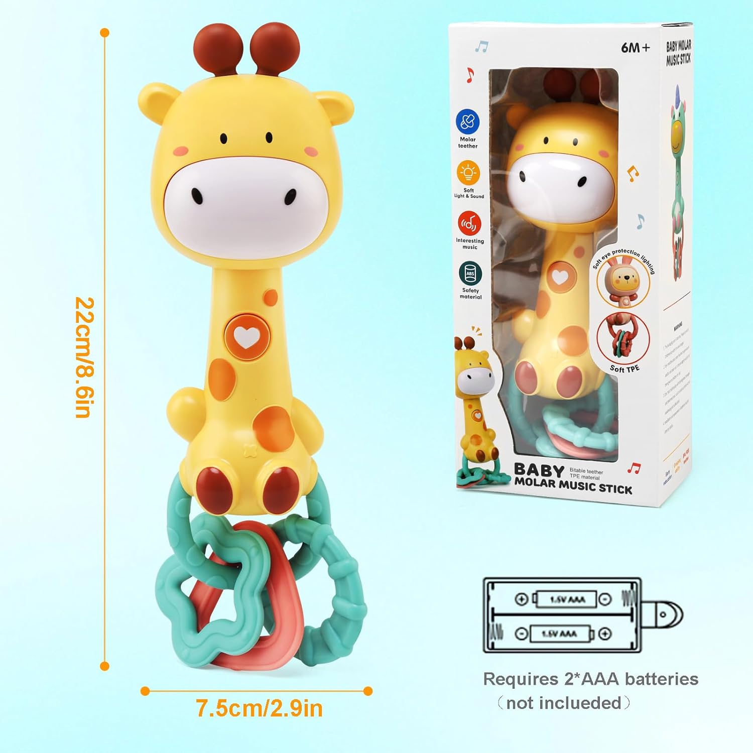【Giocattolo Sonaglio Musicale Multifunzionale】 È un giocattolo multifunzionale per bambini a forma di giraffa con bastone musicale giallo, adatto ai neonati da 0 a 18 mesi. Non è solo un giocattolo a sonagli con musica e luce, ma anche un giocattolo per la dentizione del bambino. Non solo aiuta lo sviluppo sensoriale del bambino, ma è anche molto adatto a calmare il sonno dei bambini e l'interazione genitori-figli. 【Materiali di Alta Qualità】 Come sonaglio per bambini, la sua simpatica forma di animale e i suoi colori vivaci sono sicuramente amati dai bambini. La dimensione è appropriata e facile da afferrare per i bambini. Il peso è leggero e facile da prendere e scuotere per i bambini. La superficie è liscia, rotonda e levigata senza sbavature, per consentire ai bambini di afferrarla comodamente senza farsi male alle mani. Il materiale è resistente alle cadute e non si danneggia facilmente, durevole e sicuro per il gioco del bambino. 【4 Modalità Musicali】 Come giocattolo musicale e luminoso per il bambino, ha 4 modalità musicali (musica rilassante/suono animale/suono dello strumento/suono di scuotimento del martello di sabbia) che possono essere commutate attraverso i pulsanti sulla parte anteriore del giocattolo, e 3 marce (off/basso/alto) che possono essere regolate attraverso i pulsanti sul retro del giocattolo. Quando viene riprodotta la musica, il muso dell'animale emette una luce soffusa che non danneggia gli occhi del bambino. Il bambino può ascoltare una musica rilassante e addormentarsi. 【Giocattolo per la Dentizione】Come giocattolo da dentizione per bambini, le orecchie degli animali sulla parte superiore e gli anelli di gomma sottostanti sono realizzati in gomma morbida, elastica, sicura e inodore. La parte in gomma morbida del giocattolo può essere immersa in acqua calda per la disinfezione e la pulizia ad alta temperatura, in modo che i bambini possano mordere liberamente e i genitori possano sentirsi più tranquilli. Fare attenzione a non mettere in acqua la batteria del giocattolo. 【Miglior Regalo】Può essere utilizzato in vari luoghi come culle, passeggini, seggiolini auto e altro. Come regalo per i bambini da 0 a 18 mesi, questo interessante giocattolo giraffa sarà sicuramente una buona scelta! È ottimo per il regalo del neonato, la festa di compleanno, il giocattolo per le vacanze, i regali di Natale. I vostri bambini meritano questo regalo!