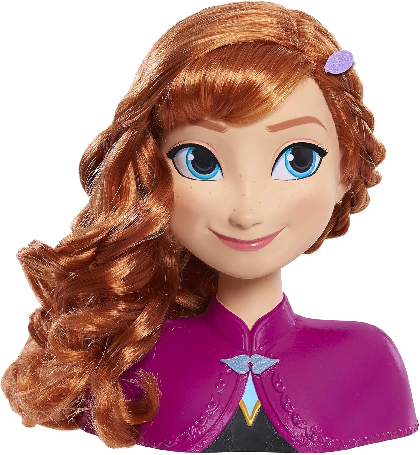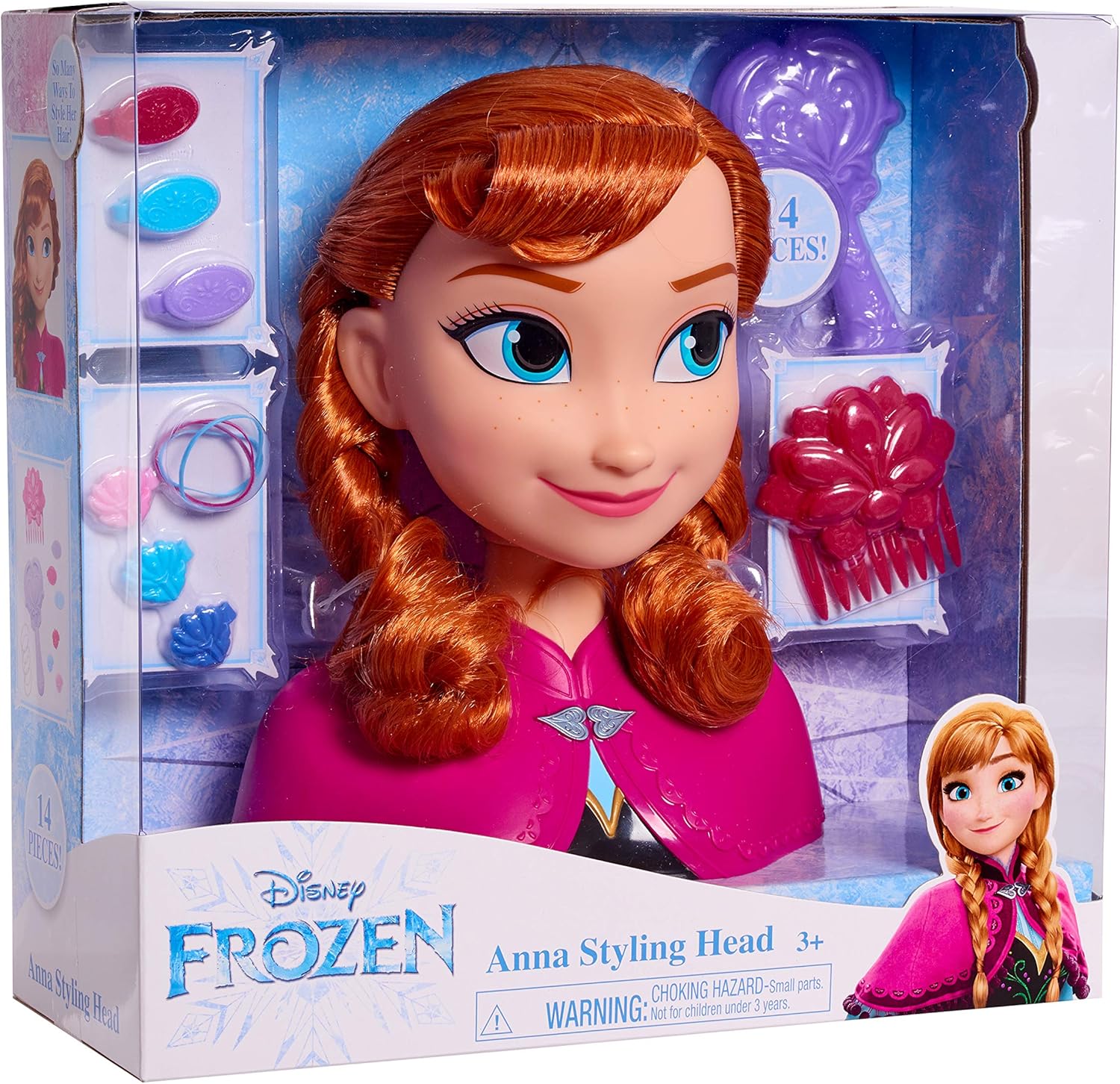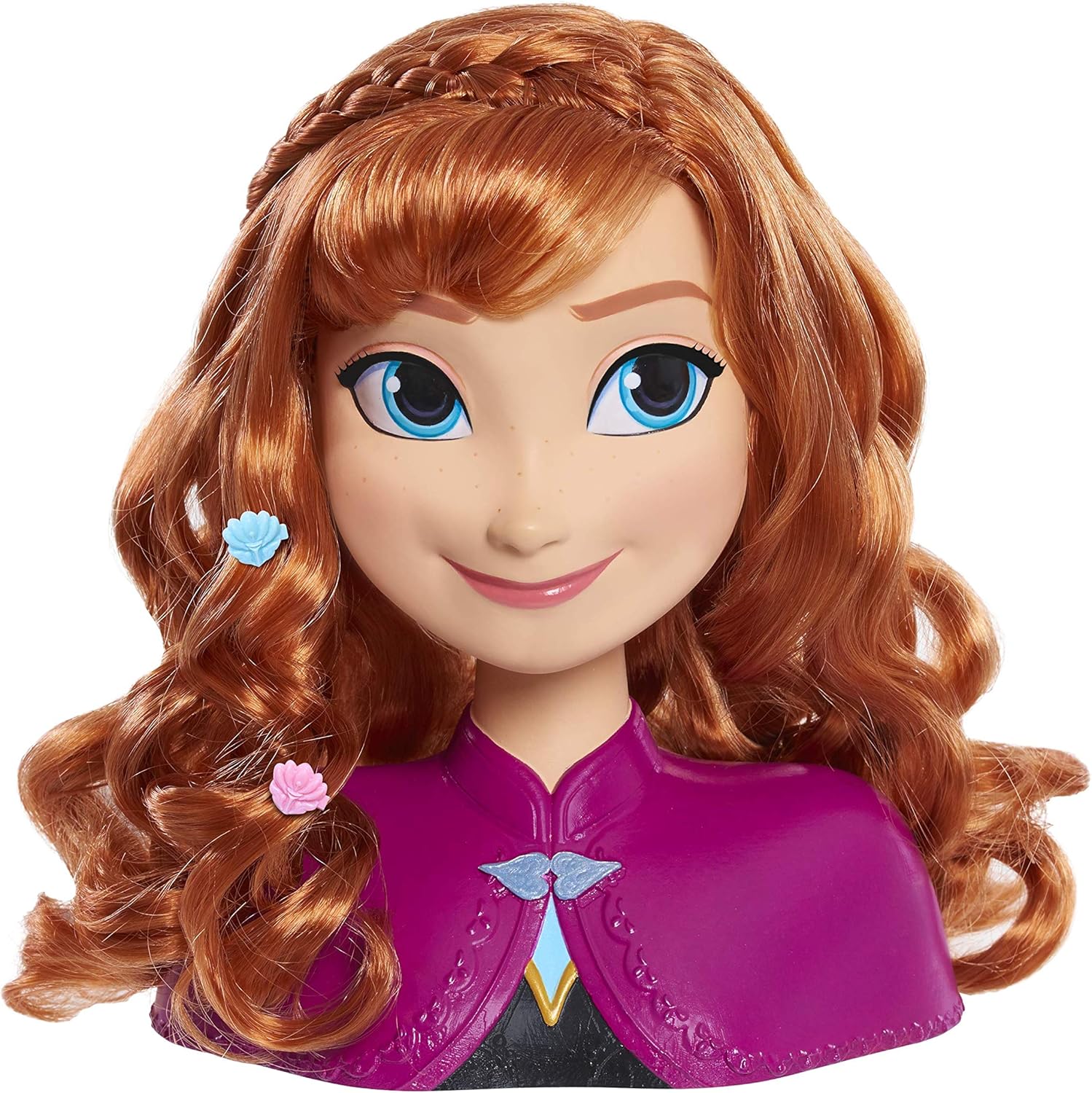 La Disney Frozen Anna Styling Head ha così tanti capelli gioco possibile La testina Disney Frozen Anna include: 1 spazzola per fiori di croco, 6 fermagli per capelli, 1 pettine a fiore di croco e 5 elastici Disney Frozen Anna Styling Head con lunghi capelli rossi nelle sue trecce iconiche I bambini possono usare il pennello per creare divertenti acconciature su Anna