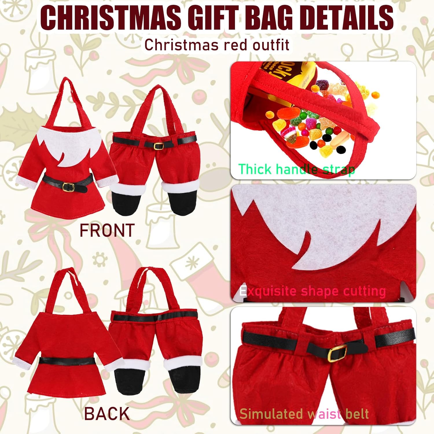 【BORSA DI NATALE】 Riceverai 4 borse stampate con adorabili motivi natalizi, 4 stili con diversi elementi natalizi, quantità sufficiente, vari stili, stile di design semplice e alla moda, sufficiente per soddisfare le tue esigenze di imballaggio quotidiane. 【CONFEZIONE REGALO DI NATALE】 Ideale per la festa di Natale, stupisci i tuoi amici con queste borse dal design unico ed elegante. Regala al loro volto un sorriso enorme con i tuoi regali speciali! Goditi il tuo piacevole Natale con la tua famiglia! BORSE E REGALI: Queste borse in feltro sono perfette per avvolgere pane, biscotti, caramelle, pasticcini, snack, popcorn, barrette di cioccolato, snack, ecc., Ma anche per confezionare regali per decorare la tua festa. 【UTILIZZA TUTTO L'INVERNO】Con 4 borse incluse, ne avrai abbastanza per tutta la stagione invernale. Tienili nel tuo armadio e sii sempre pronto per Natale, vacanze, Capodanno o qualsiasi altro evento a tema invernale! 【AMPIO UTILIZZO】 I sacchetti regalo di Natale sono molto adatti per confezionare regali di compleanno, regali di nozze, regali aziendali, regali di San Valentino, regali per la festa della mamma, regali di Natale, regali del Ringraziamento, bomboniere, caramelle, ecc.