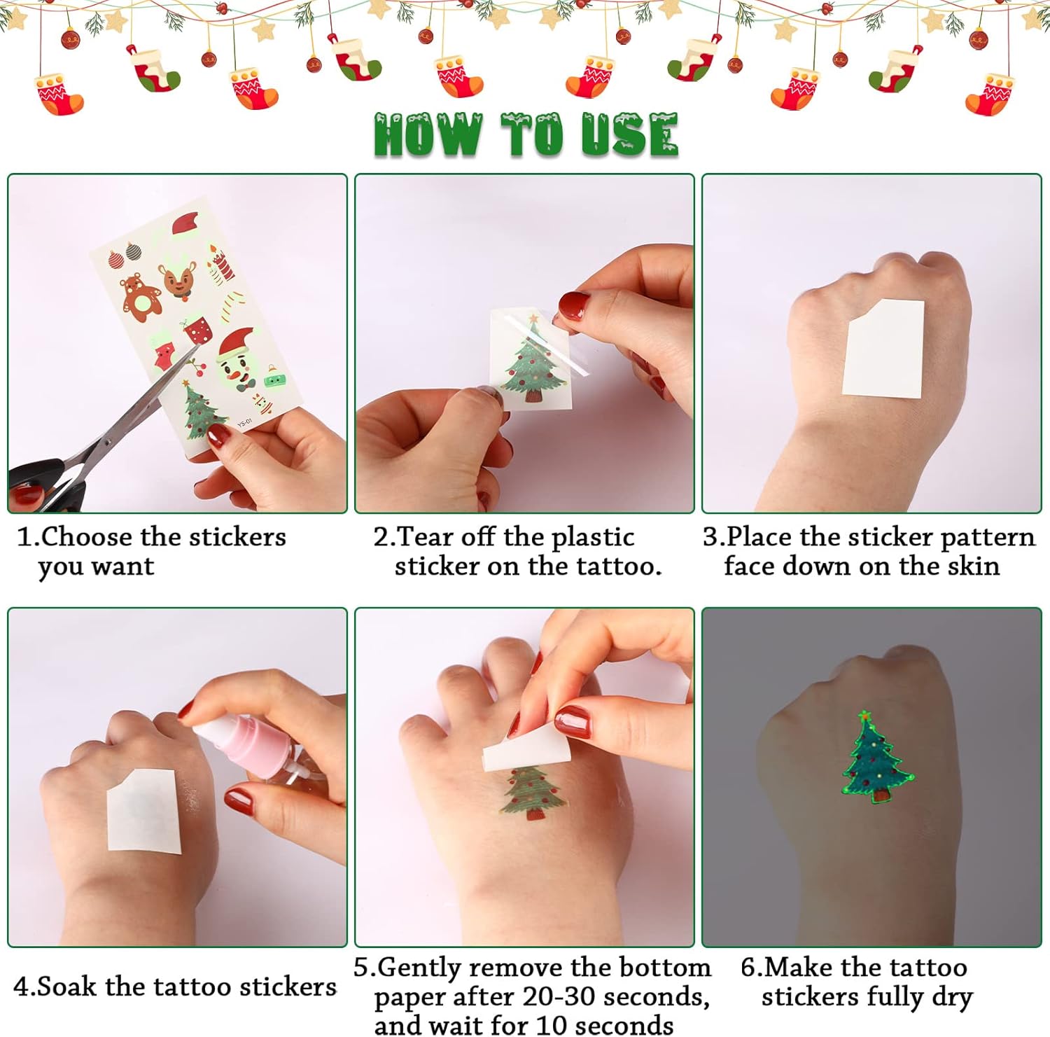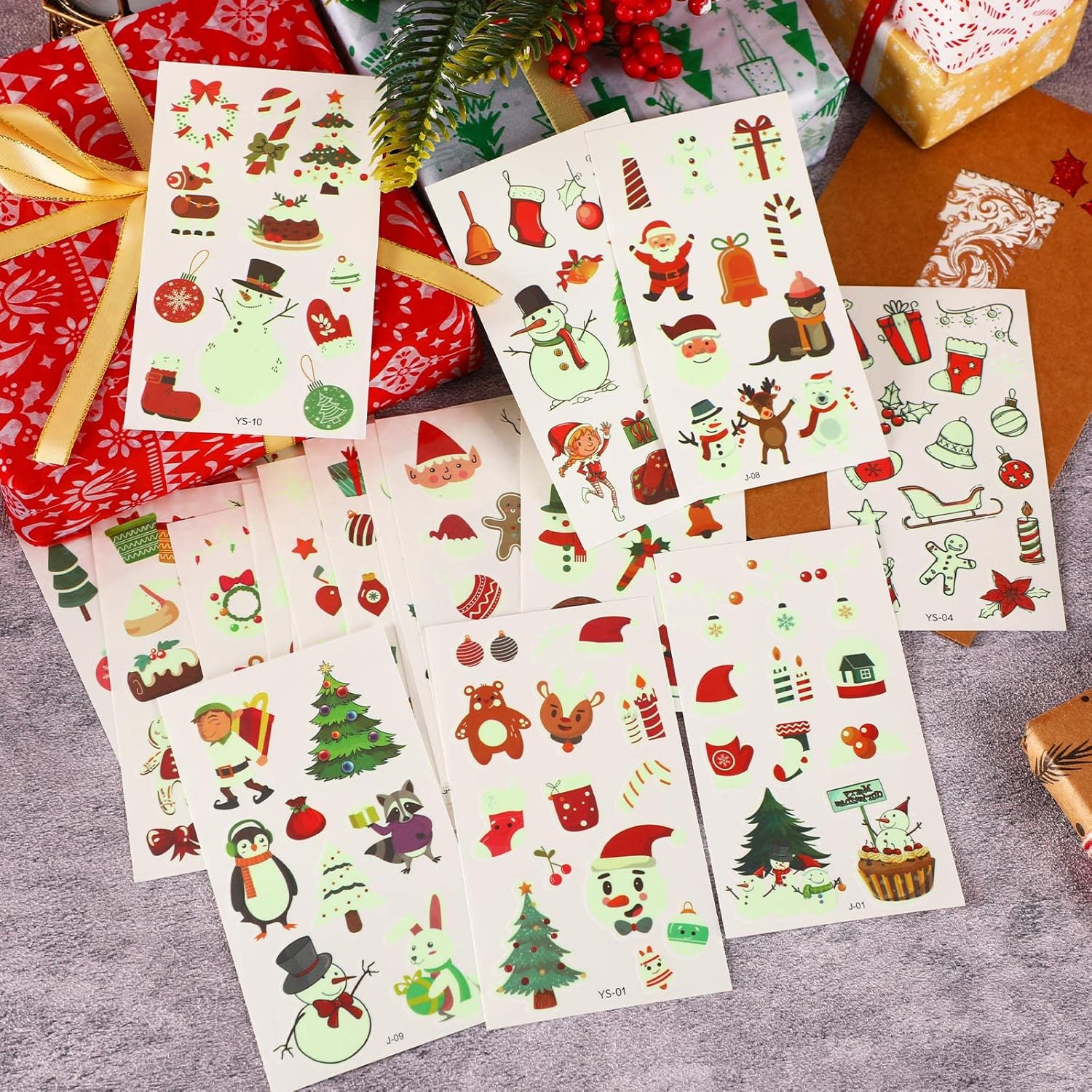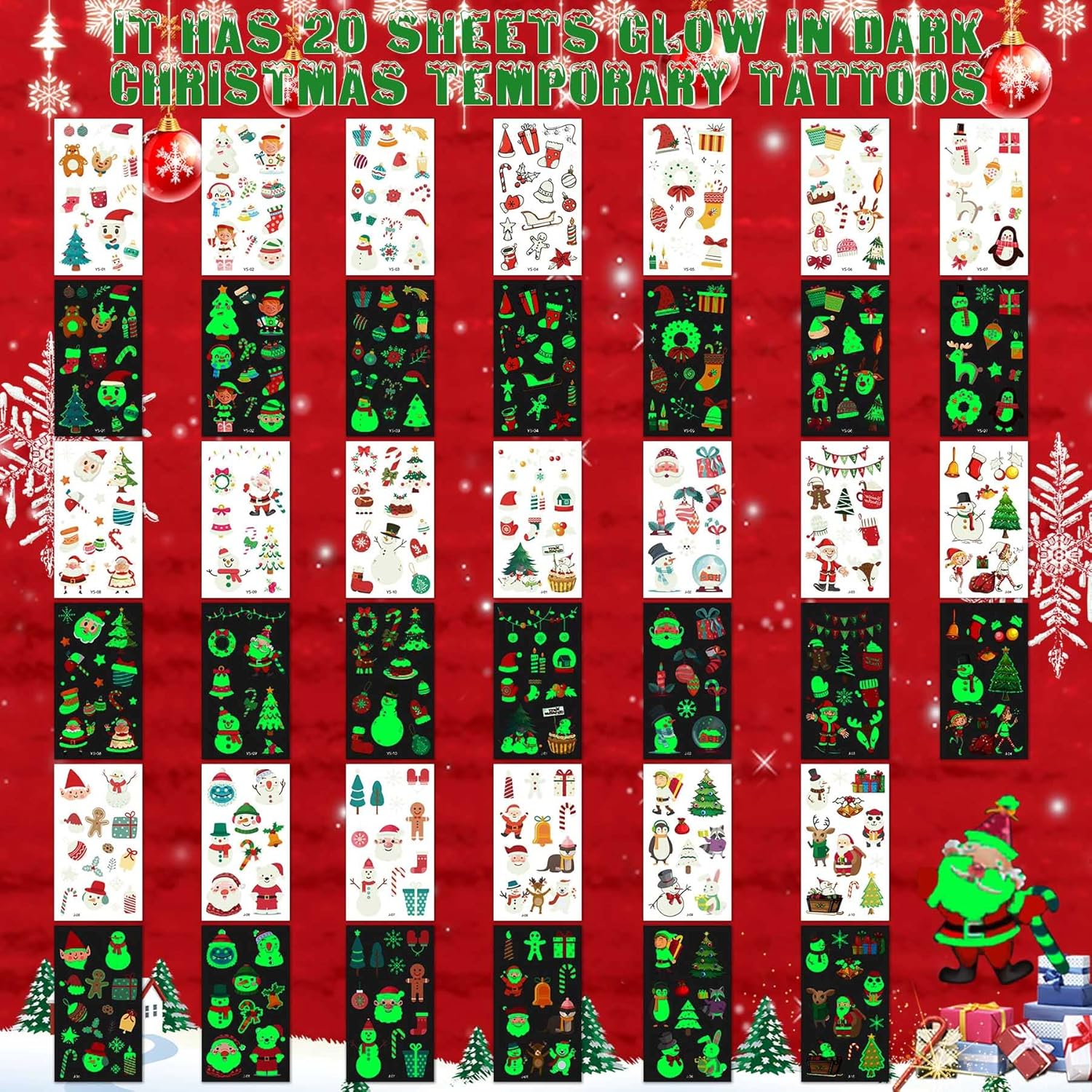 Quantità di adesivi per tatuaggi: riceverai 20 fogli di luminosi tatuaggi natalizi per bambini con oltre 350 adesivi in totale. Tatuaggio temporaneo per bambini che si illumina al buio, che è un fantastico regalo di Natale per bambini. Stili di tatuaggio: i nostri tatuaggi temporanei per bambini includono Babbo Natale, pupazzo di neve, omino di pan di zenzero, alce, albero di Natale, campane, pinguini, ecc., che offre molteplici scelte per i bambini. Abbina gli abiti natalizi ai tatuaggi dei bambini e porta un tocco festoso alla tua casa. Materiale sicuro: i tatuaggi temporanei natalizi adottano materiale sicuro, adatto a bambini di età superiore a 3 anni e adolescenti. Inoltre, le nostre calze natalizie hanno effetti luminosi, che saranno un grande successo alla festa quando spegni le luci di notte. Utilizzo: posiziona il lato con il design dei nostri tatuaggi temporanei natalizi per bambini sulla tua pelle. Immergi gli adesivi in acqua per 20-30 secondi. Quindi staccare la pellicola quando gli adesivi sono asciutti. Il tatuaggio temporaneo per bambini può essere applicato su qualsiasi punto della pelle e rimane per 2-3 giorni. Se vuoi rimuoverlo, ricordati di pulirlo con alcol. Ampia applicazione: i tatuaggi natalizi sono un fantastico ripieno per calze, bomboniere, regali di Natale, decorazioni per feste, premi di giochi, regali di compleanno, forniture per feste, giocattoli natalizi, decorazioni per bicchieri d'acqua, adatti per feste di Natale, feste di compleanno e attività scolastiche. I tatuaggi dei bambini possono essere attaccati su braccia, viso, spalle, gambe, ecc. Puoi anche attaccare i nostri tatuaggi luminosi su pareti, palloncini, scaffali al buio
