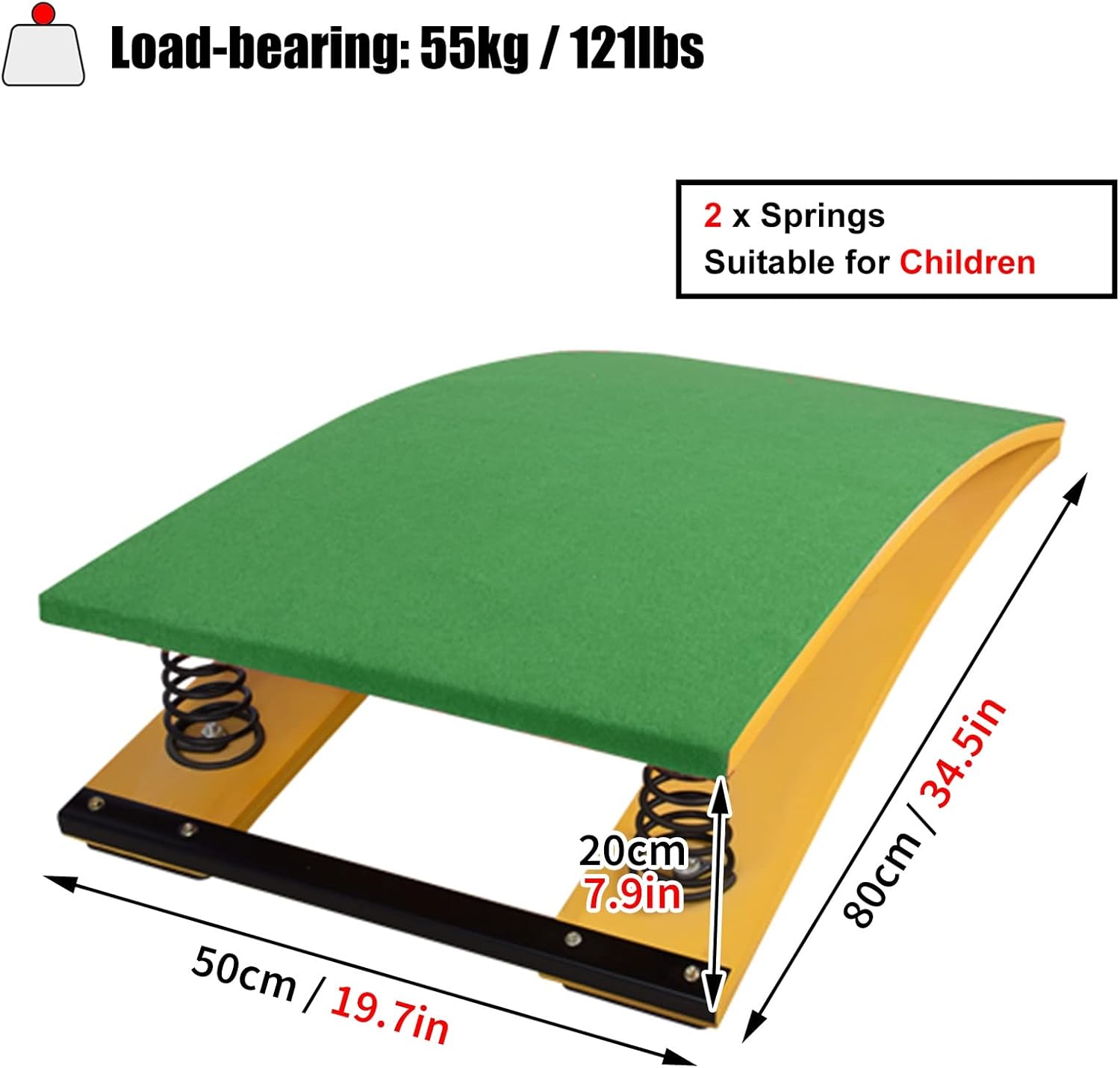 [Comodo e ad alta capacità di rimbalzo] Realizzato in legno duro liscio e senza sbavature; rivestito con un tappeto antiscivolo imbottito e una molla in acciaio al manganese ispessita all'interno. [Supporto per chi indossa scarpe] Il tappeto superiore comodo e antiscivolo consente ai piedi di aderire bene durante il salto e offre anche una superficie confortevole. Non provoca formicolio ai piedi, anche se si è a piedi nudi. [2 molle in acciaio per impieghi gravosi] Il trampolino di lancio Junior ha 2 molle. Elevata tenacità e elasticità delle molle ispessite, sicuro e durevole, reattivo e riduce notevolmente l'affaticamento degli atleti. [Trampolino per bambini] Questo trampolino standard da 80 x 50 x 20 cm / 34,5 x 19,7 x 7,9 pollici (lunghezza x larghezza x altezza) è per i giovani. Può sopportare un peso di 55 kg / 121 libbre senza. Rafforzerà la forma fisica del tuo bambino e gli consentirà di sviluppare un buon temperamento e fiducia in se stesso. [Riabilitazione corporea con trampolino sportivo] Non è solo un'attrezzatura ginnica utilizzata per migliorare la tecnica del volteggio a cavallo, per esercitarsi nello scendere e nell'atterraggio, nell'arte sportiva e nello stretching.