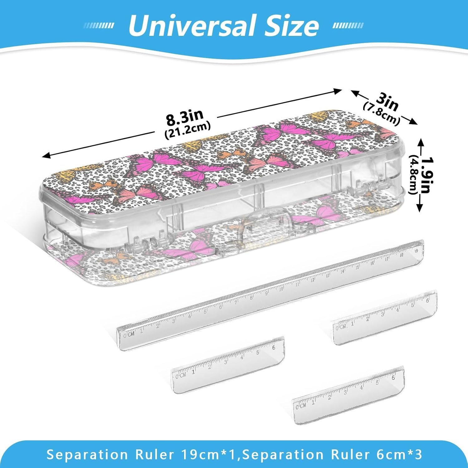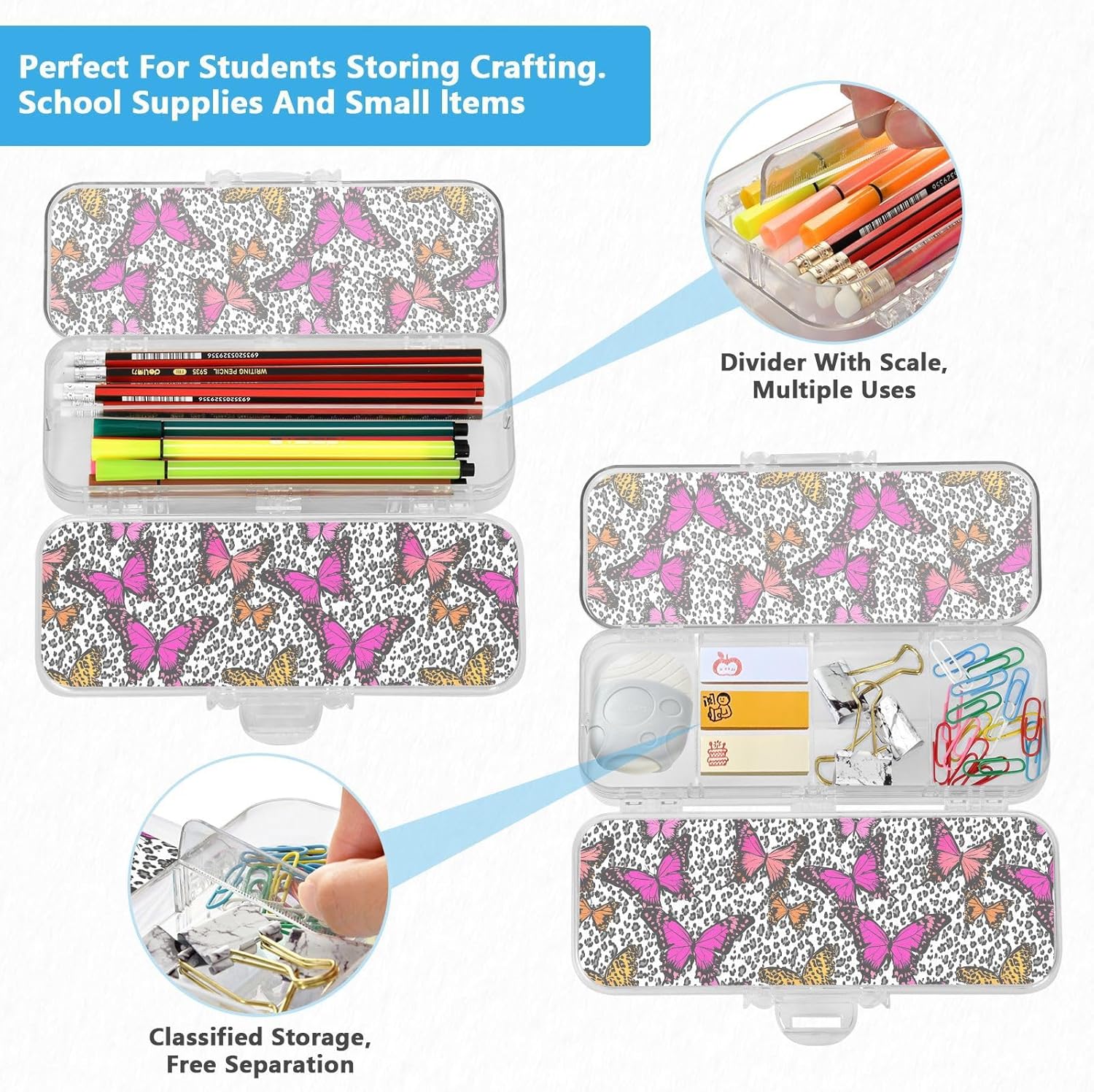 Materiale trasparente: la scatola di plastica trasparente misura 21,1 x 7,6 x 4,8 cm, realizzata in PET trasparente resistente ai graffi. Visualizza facilmente i contenuti e prendi ciò di cui hai bisogno per studiare, lavorare o viaggiare. Doppio strato: il design a doppio strato offre una grande capacità. Entrambi gli strati possono contenere matite, pennarelli o piccoli oggetti come gomme, graffette e clip. Consigliato per bambini dai 3 anni in su. Scomparti personalizzabili: include 3 divisori corti + 1 lungo rimovibile. Crea 6 sezioni o spazi aperti liberamente. I divisori fungono da pratici righelli. Organizza penne, piccoli oggetti in modo sicuro, evitando perdite e disordine senza sforzo. Portatile e sicuro: custodia compatta per scuola, ufficio, gite o viaggi. La chiusura a scatto mantiene il contenuto al sicuro durante . Trasporta oggetti artistici, articoli di cancelleria o oggetti essenziali da viaggio ordinatamente organizzati Coperchio affidabile: la chiusura a scatto assicura che entrambi gli strati rimangano al sicuro. Il contenuto rimane protetto e perfettamente posizionato.